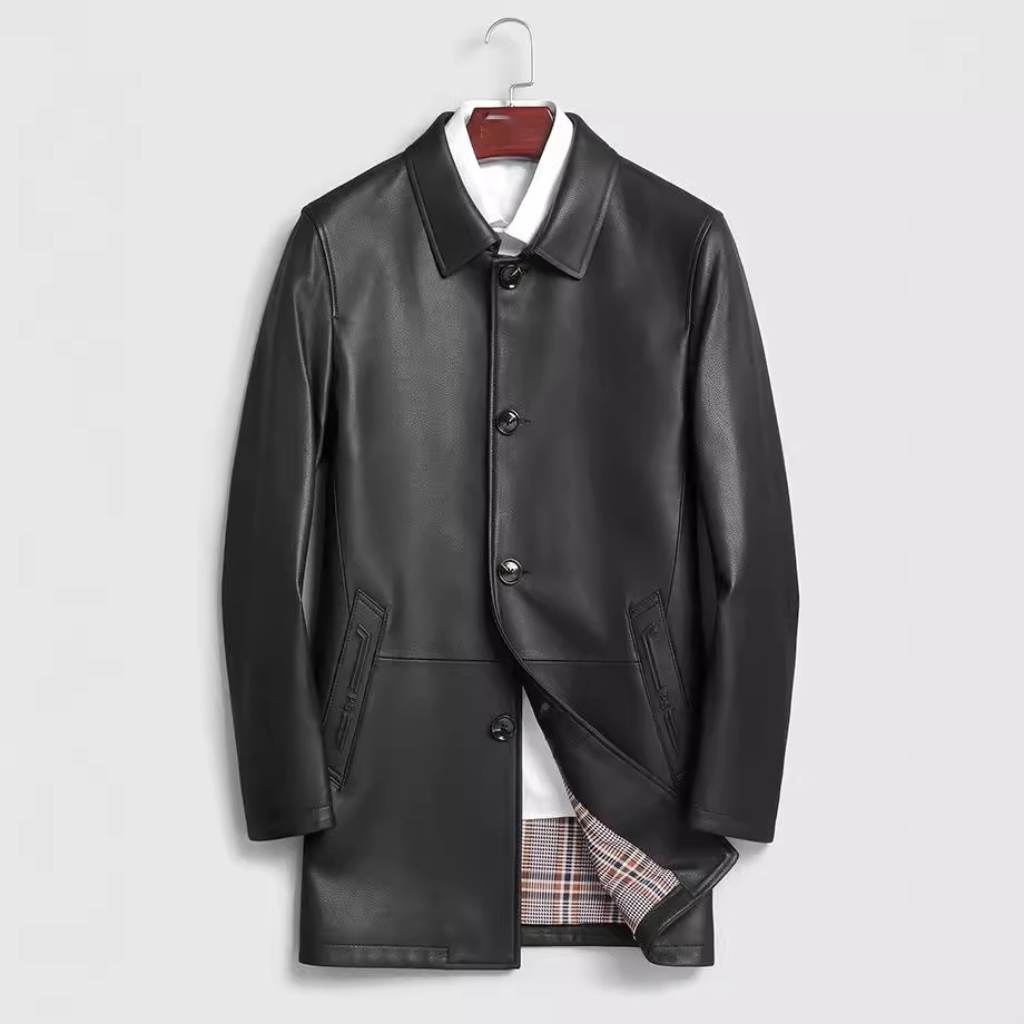 Áo khoác da thật dành cho nam, thiết kế kiểu áo choàng dài vừa phải, rất phù hợp cho tiết trời thu đông. Cổ áo kiểu bẻ, màu đen dễ dàng phối đồ, mặc được cả trong công việc và sinh hoạt thường ngày. Chất liệu da thật mềm mại mang đến cảm giác dễ chịu và ấm áp khi mặc. Có thể kết hợp cùng áo thun, quần âu hoặc quần jean đều rất hợp. Dùng khăn mềm ẩm lau nhẹ để giữ áo luôn sạch đẹp. | Tên sản phẩm: Áo Da Nam Chất Liệu Da Bò Kín Cổ Hàng Mùa Xuân Thu Đông - Thời Trang Nam | Mã sản phẩm: B5096 - Giá: 7.680.000đ | Mã nhà sản xuất: HADGA-G06Hình ảnh sản phẩm