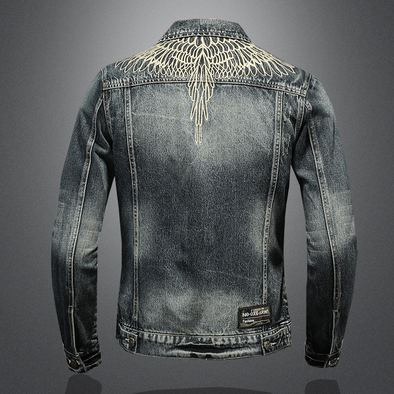 Áo khoác denim nam với điểm nhấn là hình thêu đôi cánh lớn ở mặt sau, tạo phong cách mạnh mẽ và cá tính. Chất liệu denim dày dặn, form dáng chuẩn, mặc vừa vặn thoải mái. Sản phẩm dễ dàng phối cùng nhiều loại trang phục như quần tây, quần kaki hay quần jean. Mặc kèm áo thun hoặc áo sơ mi đều phù hợp cho các dịp đi chơi, gặp gỡ bạn bè. | Tên sản phẩm: Áo Khoác Nam Chất Liệu Jean Bò Thêu Họa Tiết Hoa - Thời Trang Nam | Mã sản phẩm: C8407 - Giá: 2.020.000đ | Mã nhà sản xuất: QITYGF-G05Hình ảnh sản phẩm