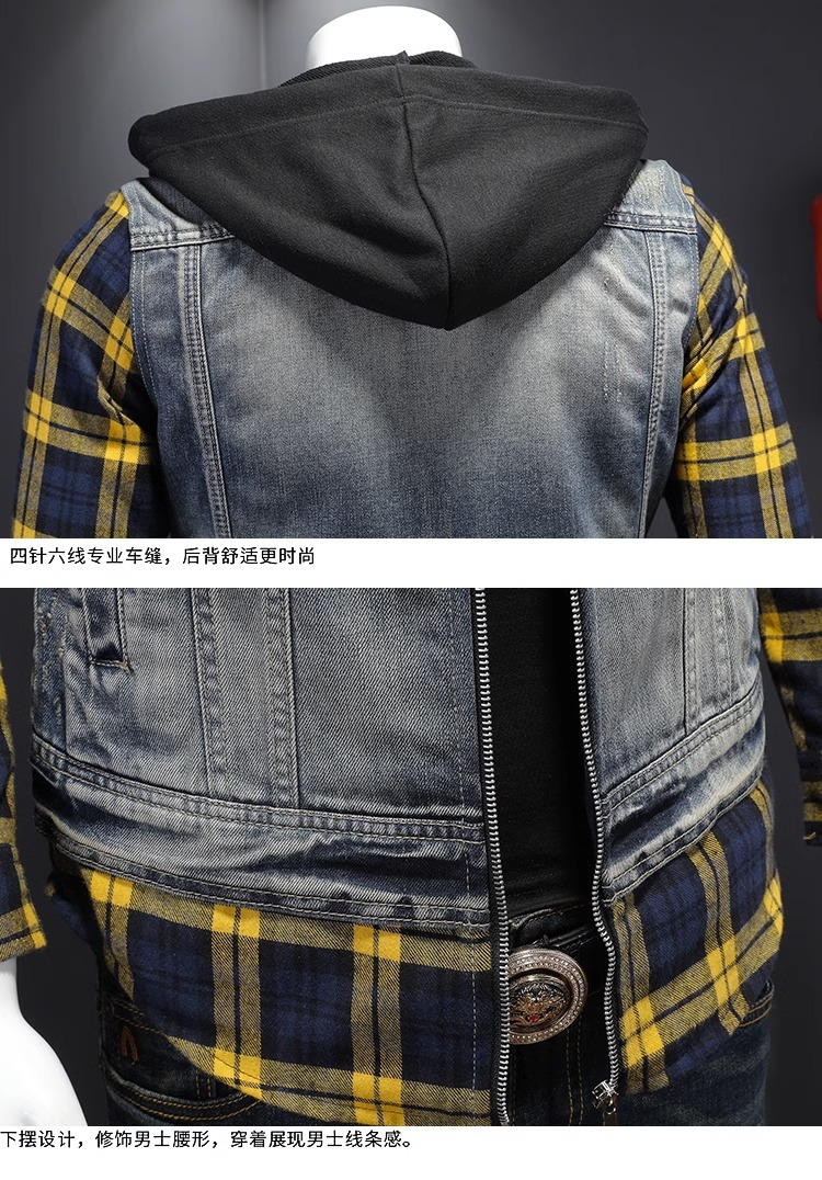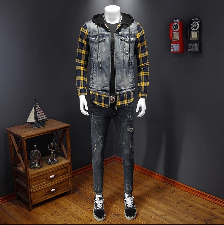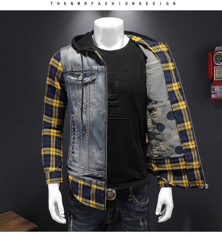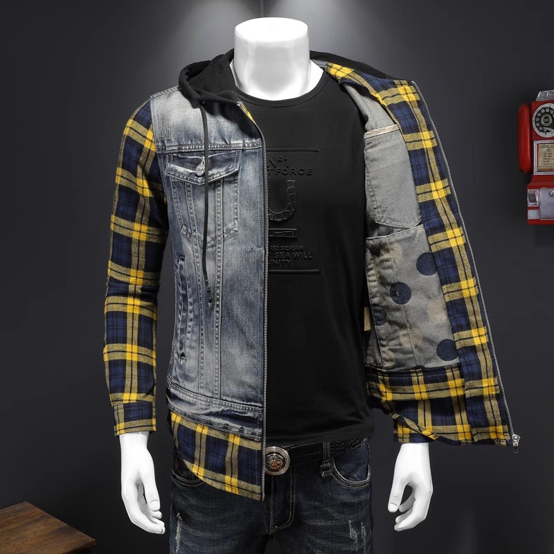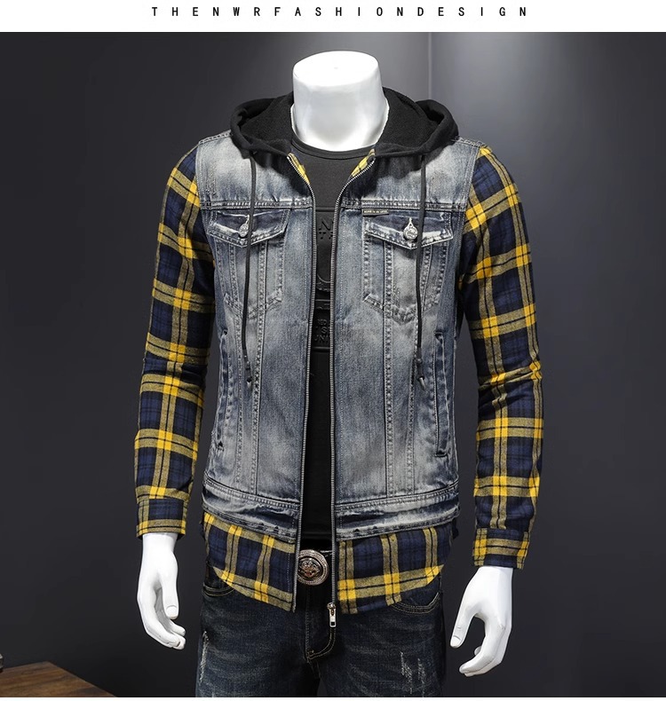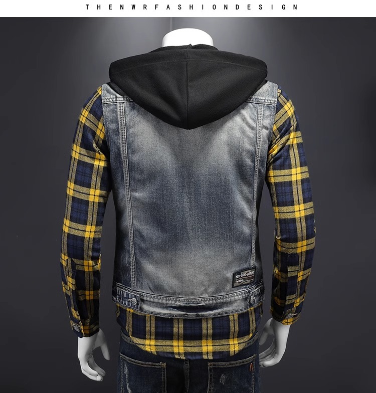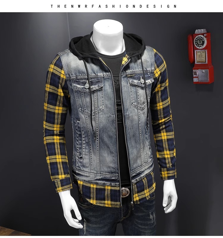 Áo khoác jean có mũ được thiết kế như đang mặc hai lớp, tạo kiểu dáng trẻ trung và năng động. Chất liệu denim bền chắc, điểm nhấn là họa tiết ô vuông tinh tế phía trước. Sản phẩm có dây rút điều chỉnh ở mũ và túi rộng tiện lợi. Phù hợp mặc đi học, dạo phố hay các buổi gặp mặt bạn bè. Có thể phối cùng quần shorts hoặc quần jeans để tạo vẻ ngoài cá tính. | Tên sản phẩm: Áo Sơ Mi Nam Chất Liệu Jean Bò Cả Bộ 2 Món Kẻ Caro - Thời Trang Nam | Mã sản phẩm: B1740 - Giá: 2.210.000đ | Mã nhà sản xuất: QITYGF-G05Hình ảnh sản phẩm