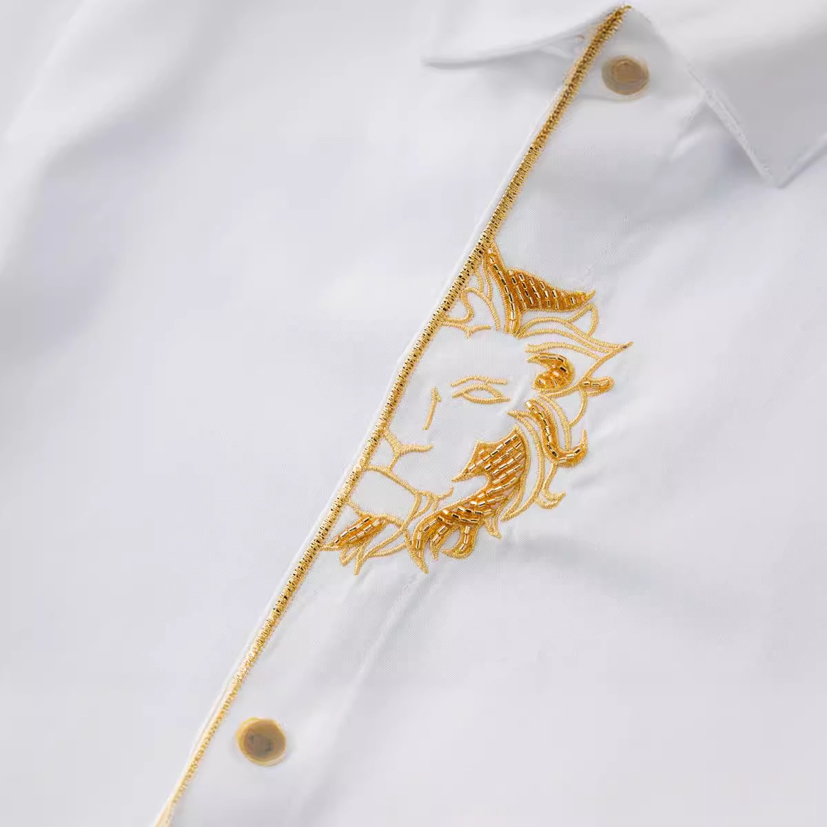 Áo sơ mi nam dáng ôm với điểm nhấn là hình chú sư tử được gắn hạt cầu kỳ hoàn toàn thủ công. Sản phẩm có tay dài, được dệt từ chất liệu bông mềm mại, mang lại cảm giác dễ chịu khi mặc. Kiểu dáng lịch sự, phù hợp cho nhiều dịp. Bạn có thể kết hợp cùng quần tây hoặc quần jean để tạo nên những phong cách khác nhau. | Tên sản phẩm: Áo Sơ Mi Nam Chất Liệu Vải Bông Dáng Ôm - Thời Trang Nam | Mã sản phẩm: B7621 - Giá: 2.190.000đ | Mã nhà sản xuất: SHDAP-G05Hình ảnh sản phẩm