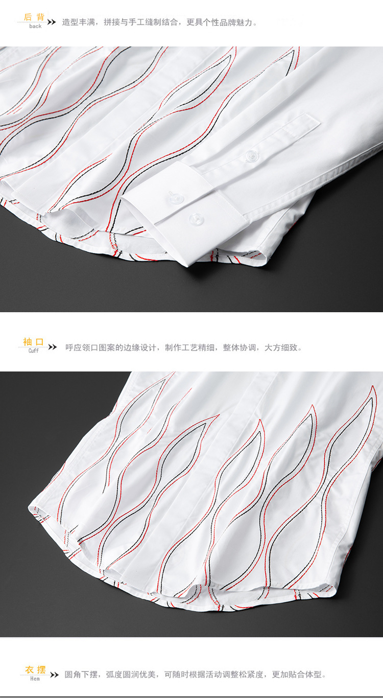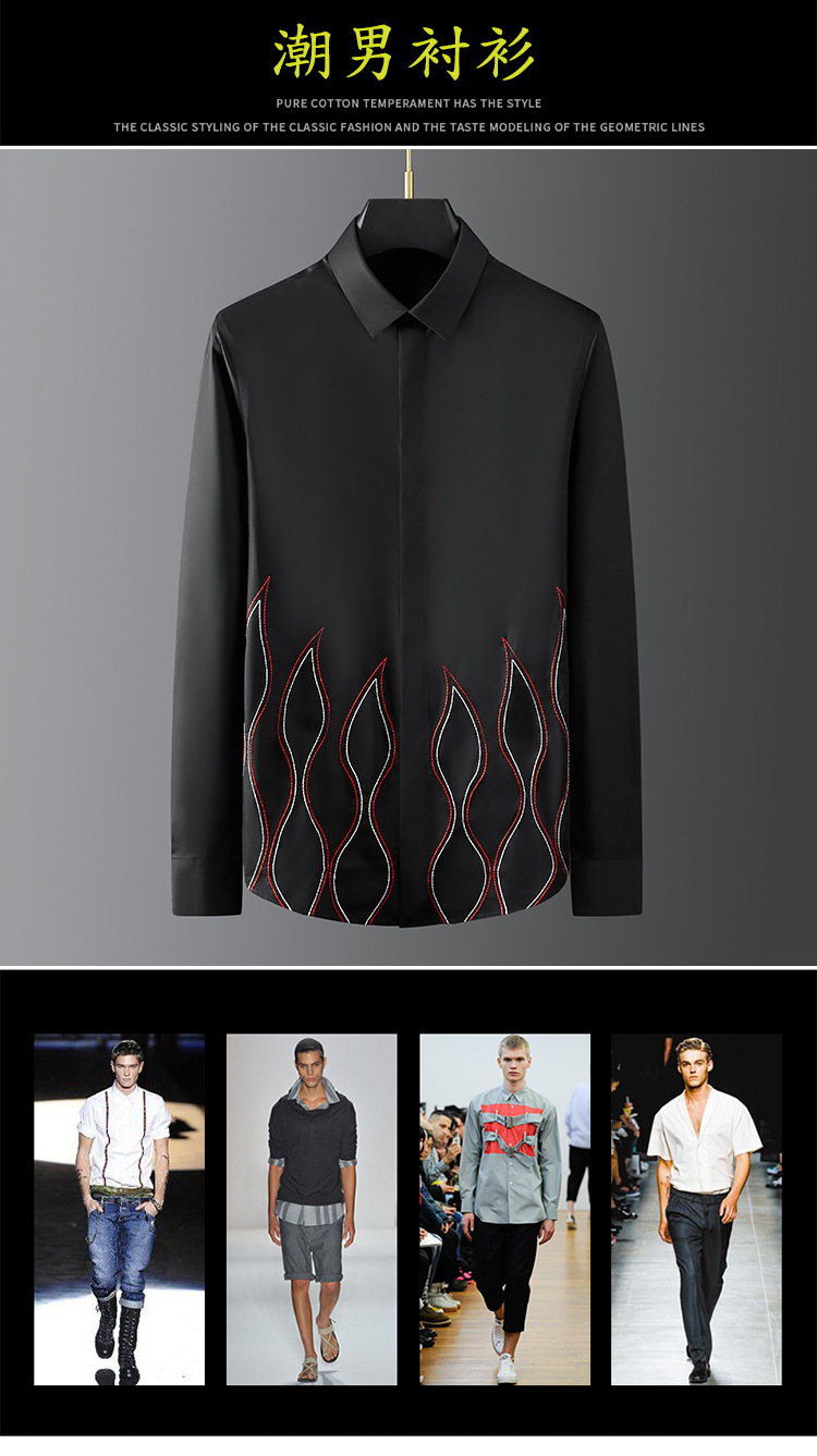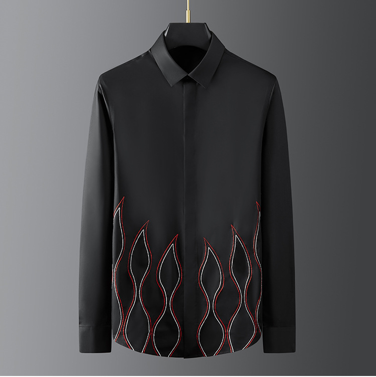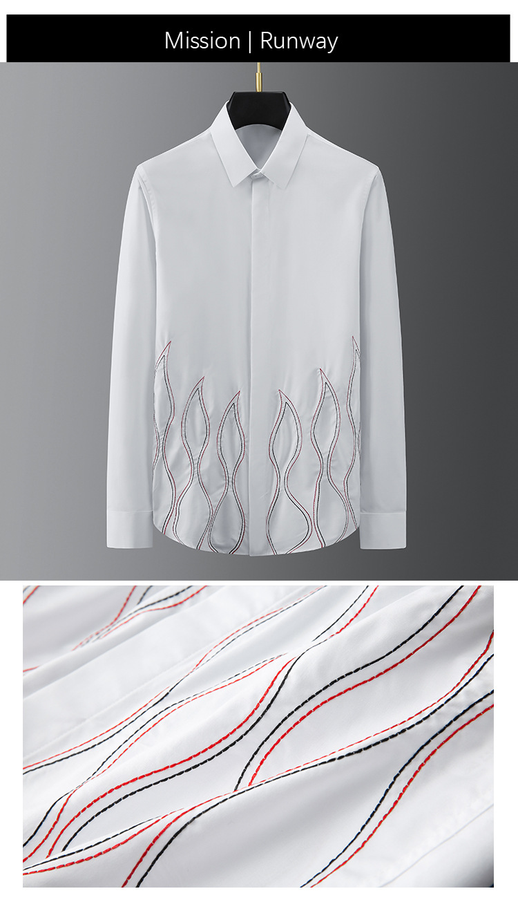 Áo sơ mi dài tay dành cho nam, kiểu dáng mặc thường ngày rất thoải mái. Điểm nổi bật là hình thêu ngọn lửa cách điệu đan chéo nhau ở phần gấu áo, tạo nên phong cách riêng. Chất liệu vải mềm mại, thấm hút mồ hôi tốt, phù hợp mặc đi làm hoặc dạo phố. Có thể mặc kèm với quần jeans hoặc quần âu đều phù hợp. Giặt máy nhẹ nhàng để giữ form áo và hình thêu được bền đẹp. | Tên sản phẩm: Áo Sơ Mi Nam Dài Tay Thêu Họa Tiết Hoa Hàng Mùa Xuân Thu Đông - Thời Trang Nam | Mã sản phẩm: A9503 - Giá: 1.380.000đ | Mã nhà sản xuất: FODAR-G04Hình ảnh sản phẩm