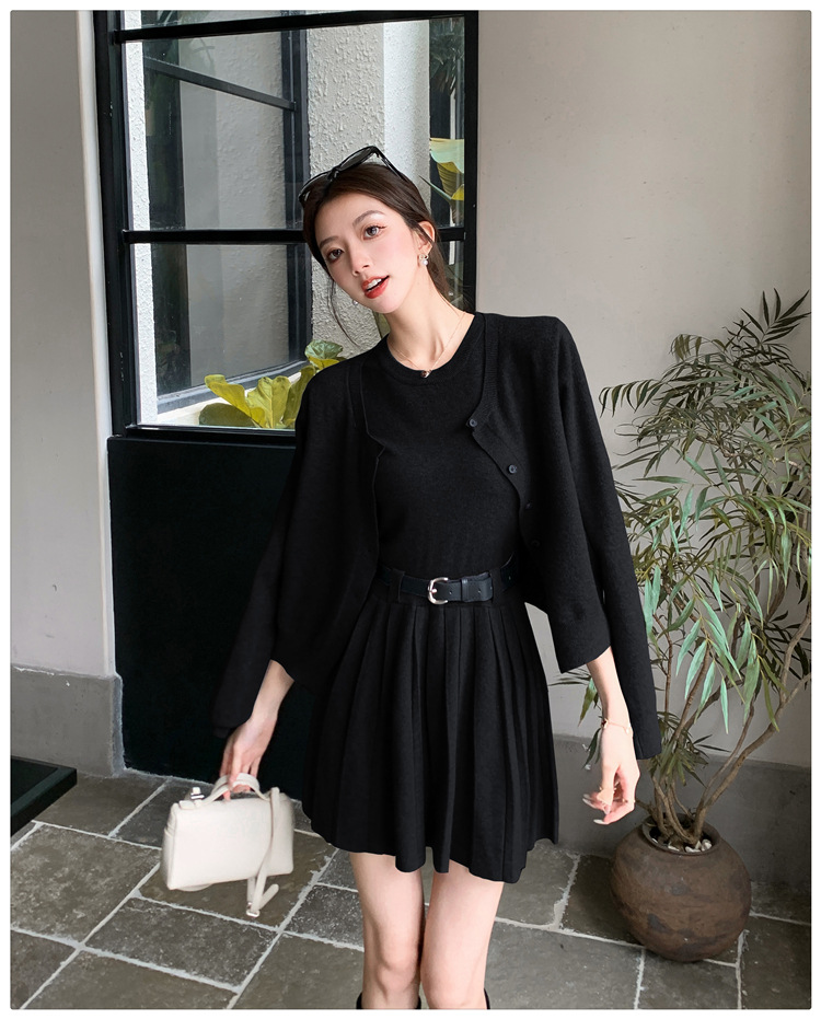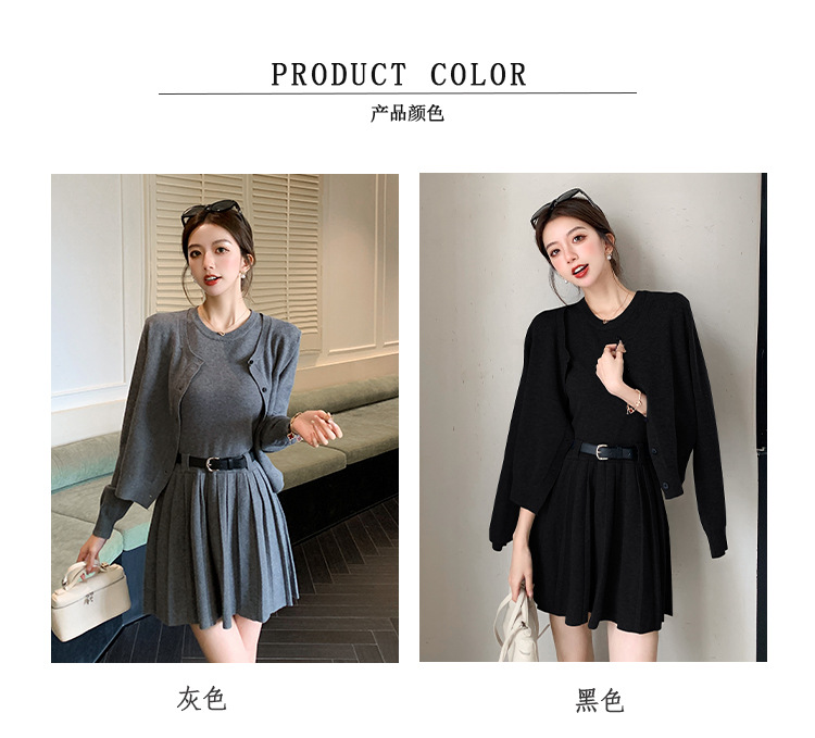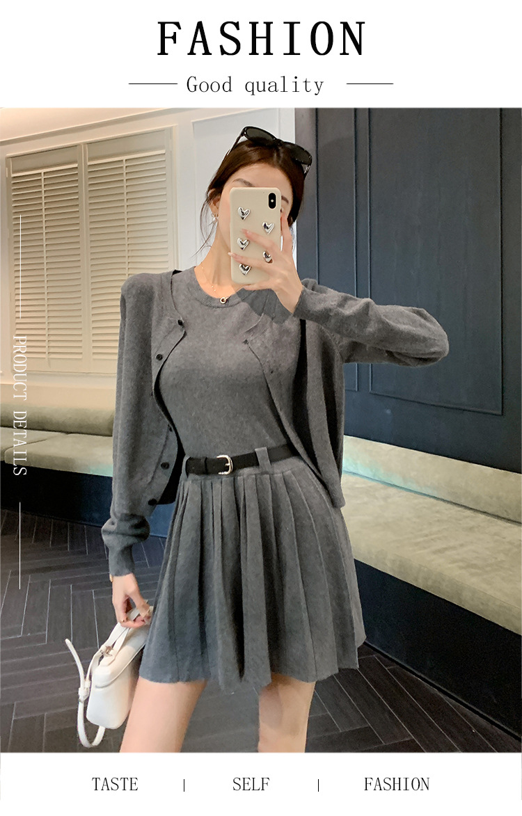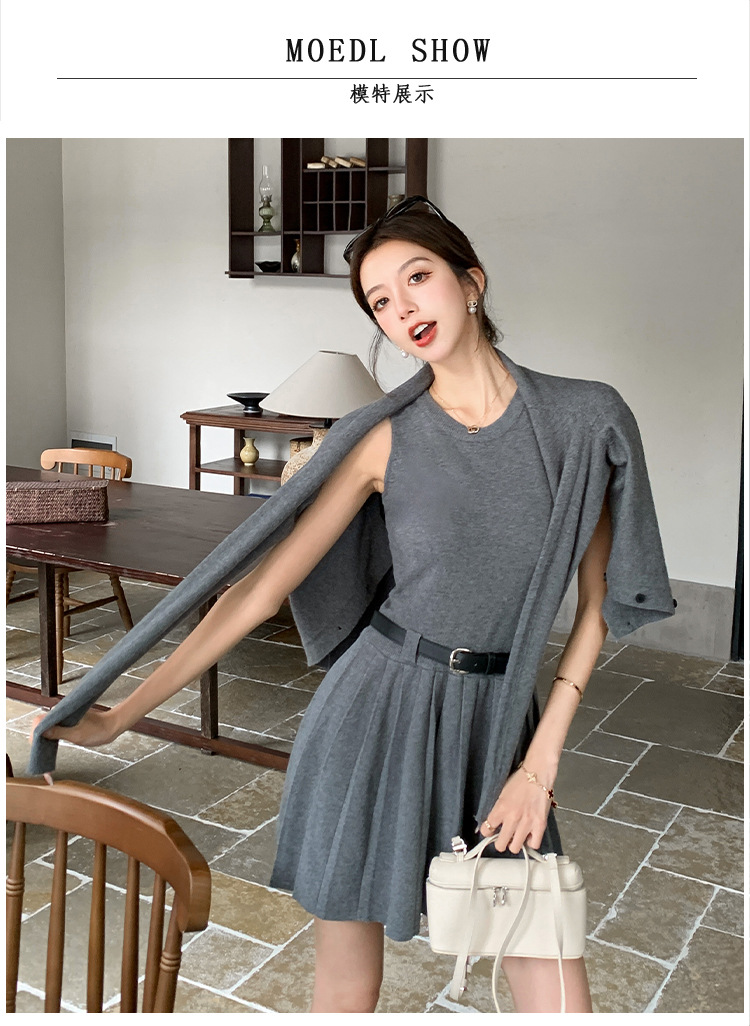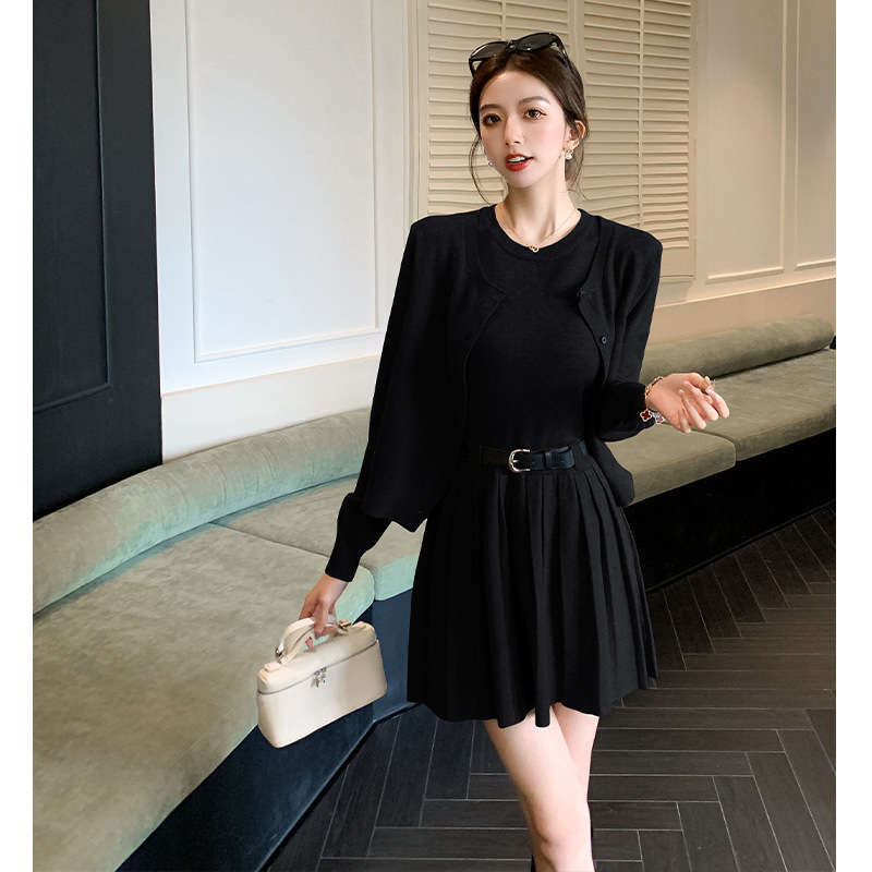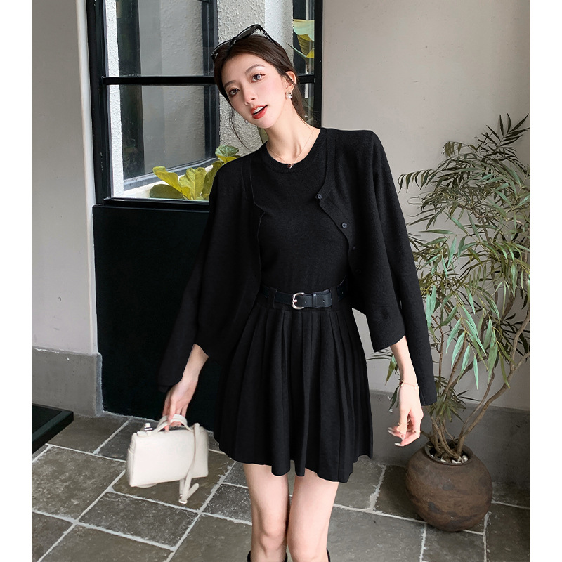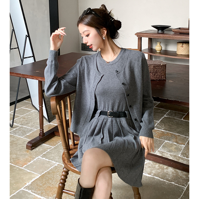 Bộ trang phục hai mảnh này gồm đầm và áo khoác mỏng. Chiếc đầm kết hợp dáng áo ba lỗ và phần chân váy xếp ly, tạo vẻ ngoại điệu đà. Áo khoác dạng cardigan đan mềm mại, dễ mặc. Bộ này thích hợp cho tiết trời mát mẻ. Bạn có thể mặc riêng chiếc đầm hoặc kết hợp cả hai mảnh để tạo nên bộ trang phục hoàn chỉnh, phù hợp cho nhiều dịp sinh hoạt thường ngày. | Tên sản phẩm: Áo Sơ Mi Nữ Áo Len Dáng Dộng Cả Bộ 2 Món Hàng Mùa Xuân Thu Đông - Thời Trang Nữ | Mã sản phẩm: B3211 - Giá: 900.000đ | Mã nhà sản xuất: ZHOUT-G03Hình ảnh sản phẩm
