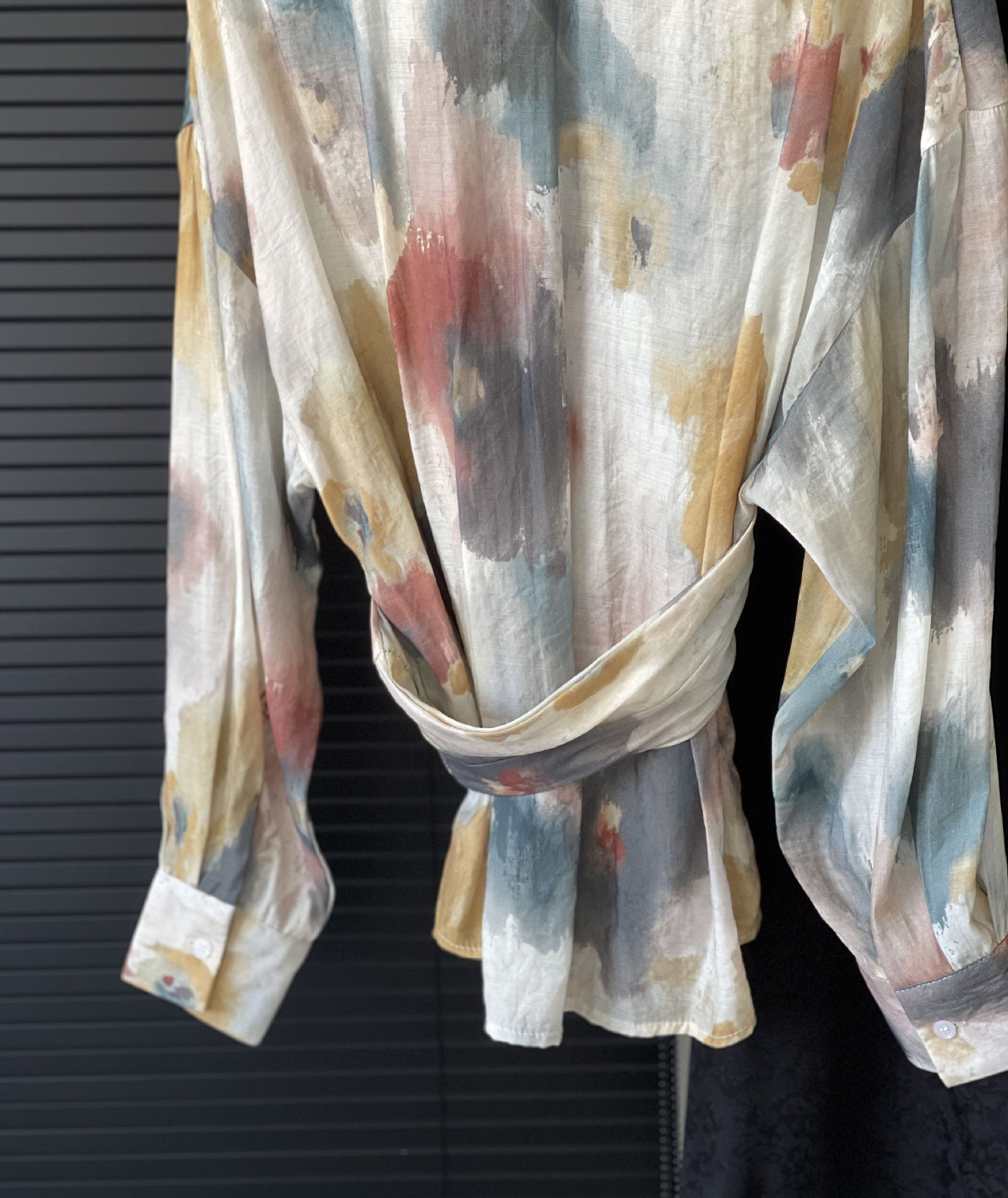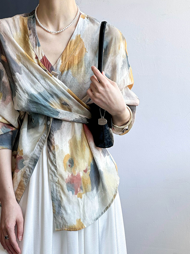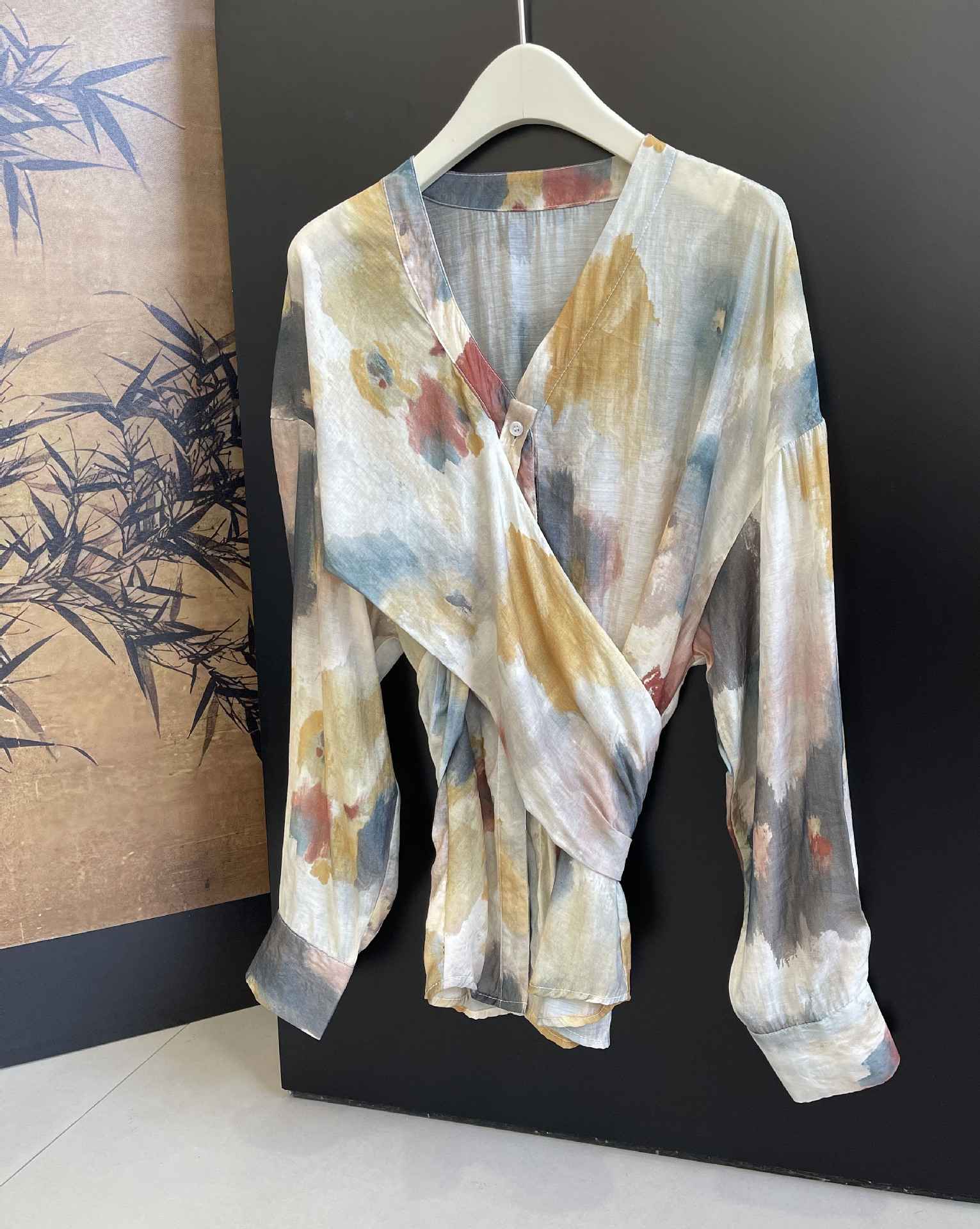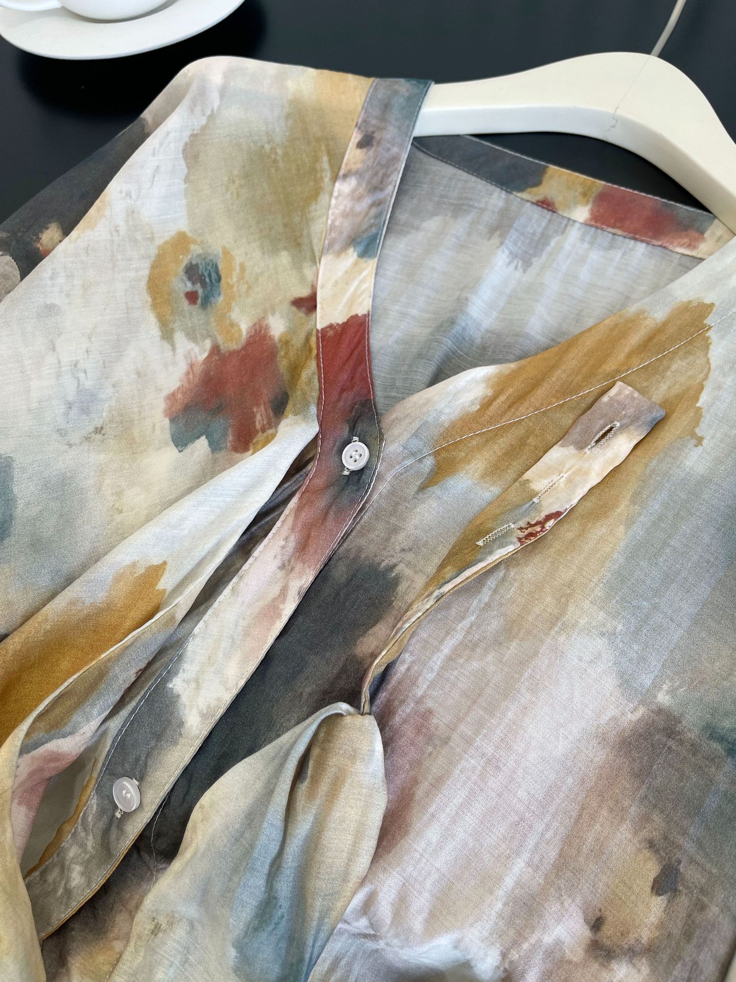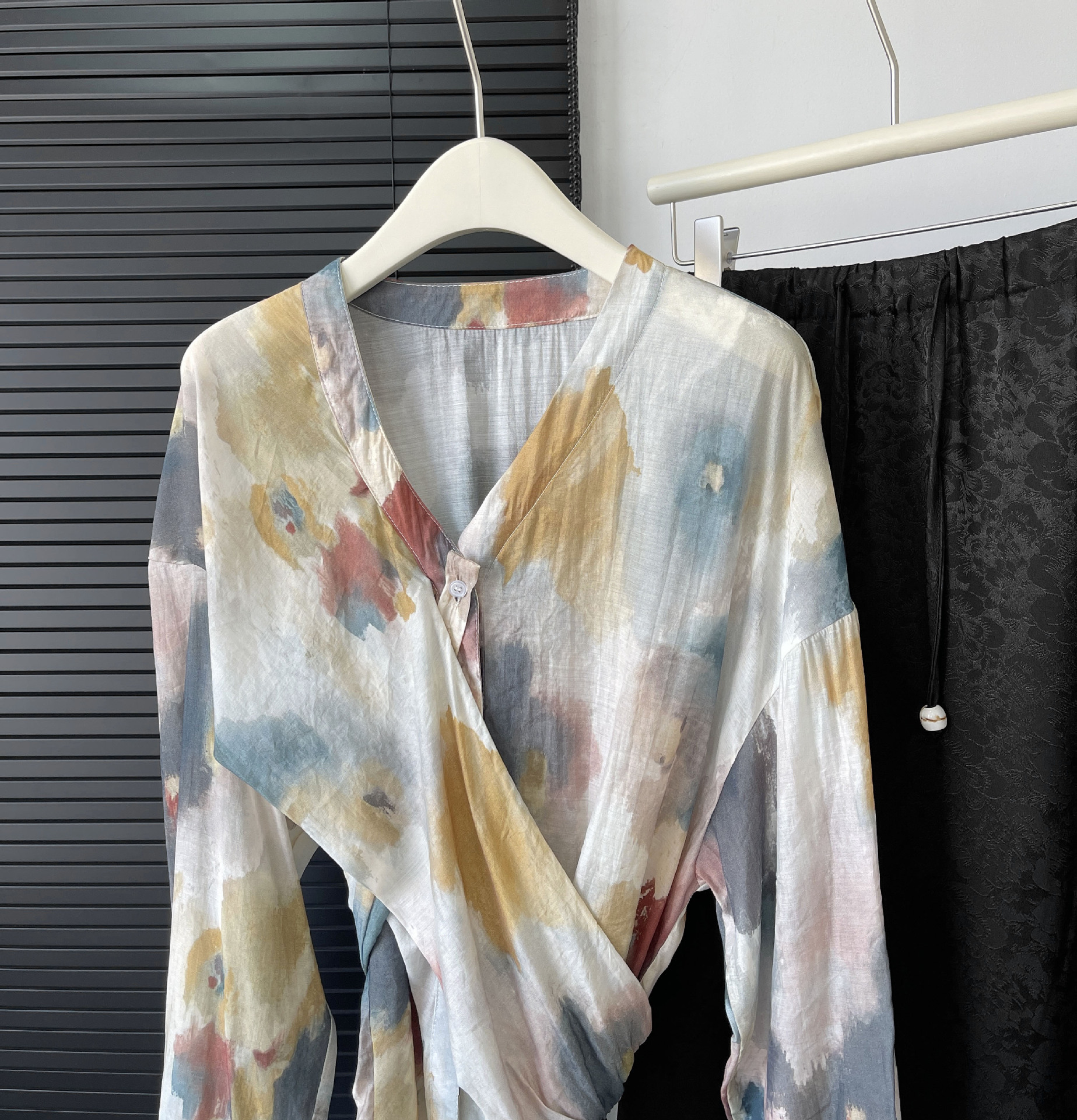 Áo kiểu dáng rộng tay thướt tha, phù hợp mặc trong mùa hè. Cổ chữ V cùng dây buộc mềm mại giúp tôn dáng người mặc. Chất vải nhẹ có khả năng ngăn nắng, in họa tiết loang màu nhẹ nhàng. Mẫu mã riêng biệt, dễ dàng phối với nhiều trang phục khác. Có thể mặc đi làm, dạo phố hay dự những buổi gặp mặt thân mật. | Tên sản phẩm: Áo Sơ Mi Nữ Cổ Chữ V Hàng Mùa Hè - Thời Trang Nữ | Mã sản phẩm: L0586 - Giá: 880.000đ | Mã nhà sản xuất: HADUN-G03Hình ảnh sản phẩm