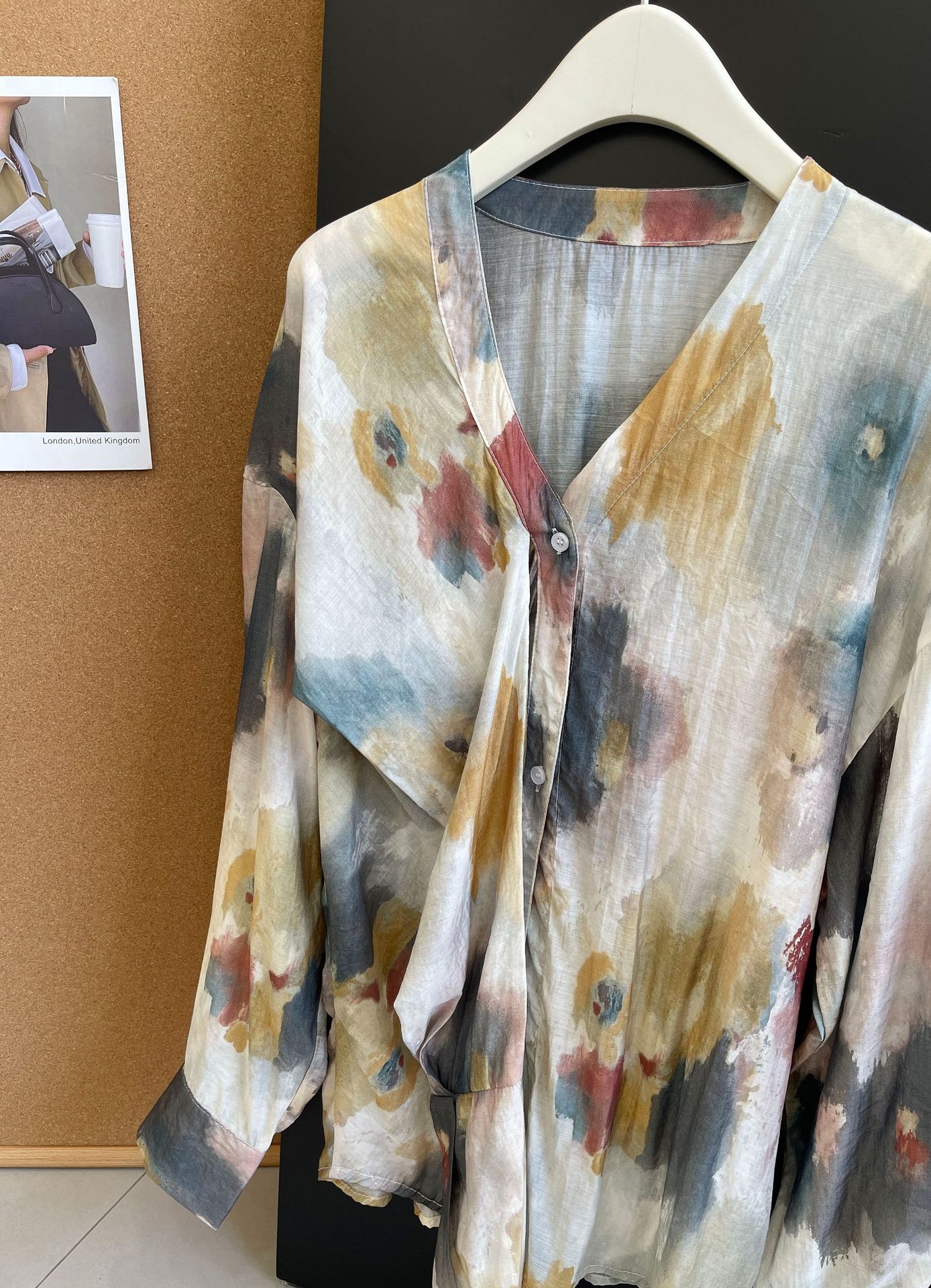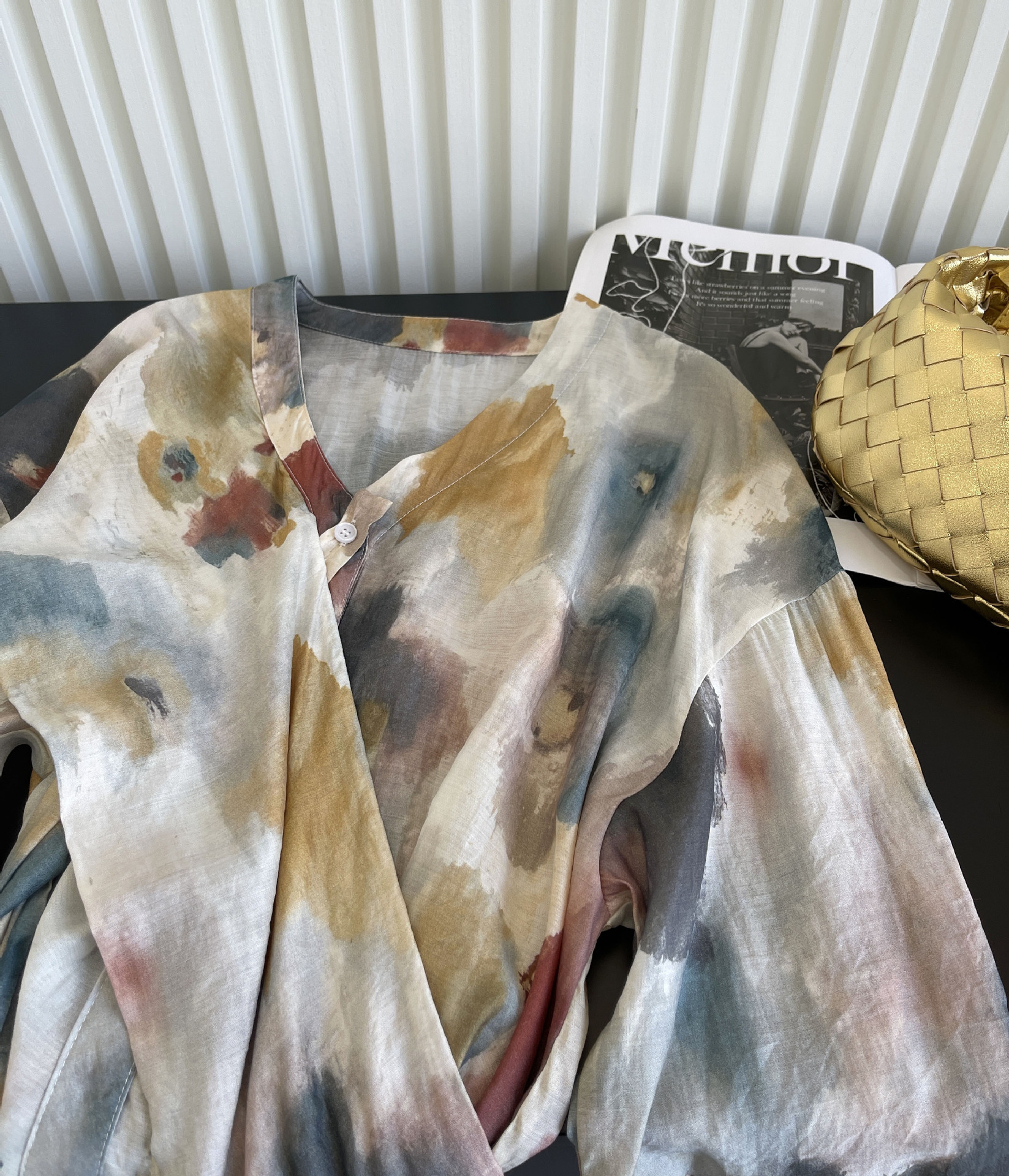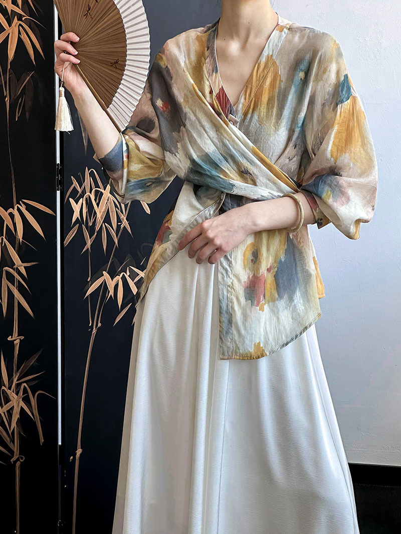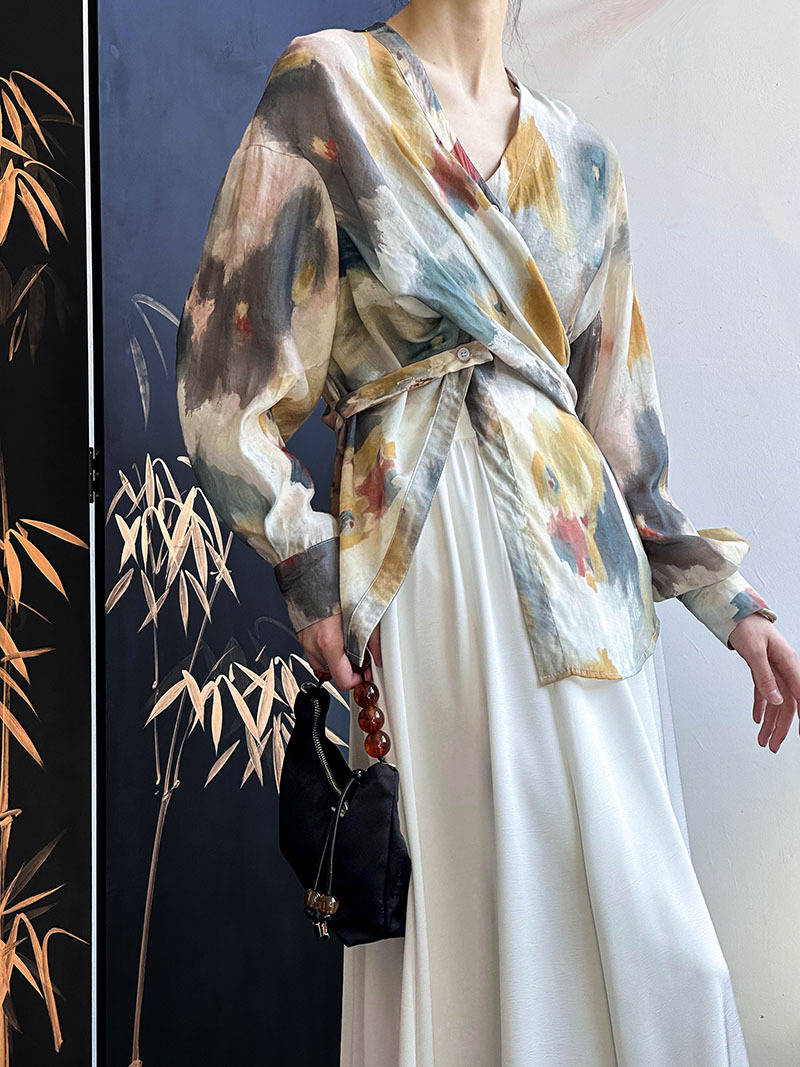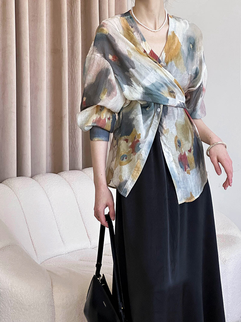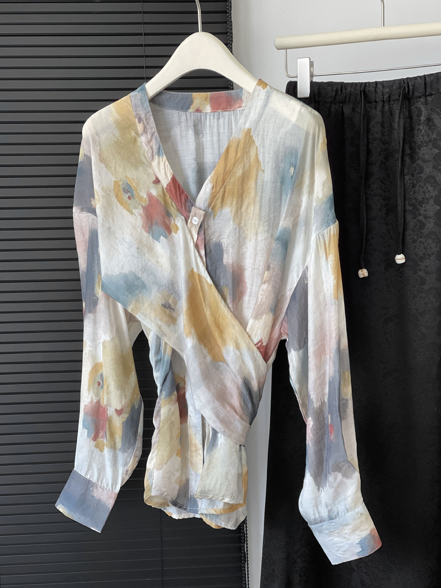 Áo kiểu dáng rộng tay thướt tha, phù hợp mặc trong mùa hè. Cổ chữ V cùng dây buộc mềm mại giúp tôn dáng người mặc. Chất vải nhẹ có khả năng ngăn nắng, in họa tiết loang màu nhẹ nhàng. Mẫu mã riêng biệt, dễ dàng phối với nhiều trang phục khác. Có thể mặc đi làm, dạo phố hay dự những buổi gặp mặt thân mật. | Tên sản phẩm: Áo Sơ Mi Nữ Cổ Chữ V Hàng Mùa Hè - Thời Trang Nữ | Mã sản phẩm: L0586 - Giá: 880.000đ | Mã nhà sản xuất: HADUN-G03Hình ảnh sản phẩm