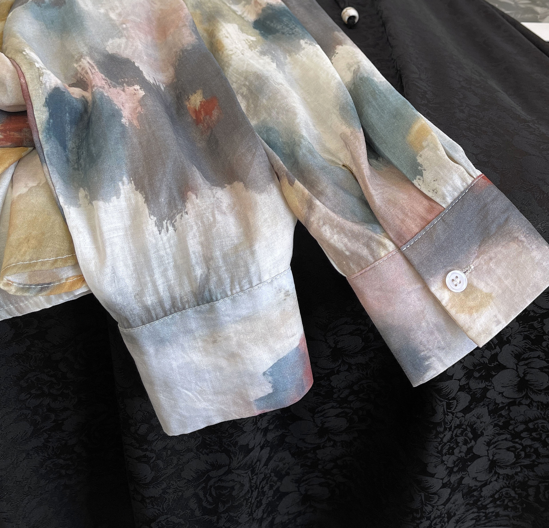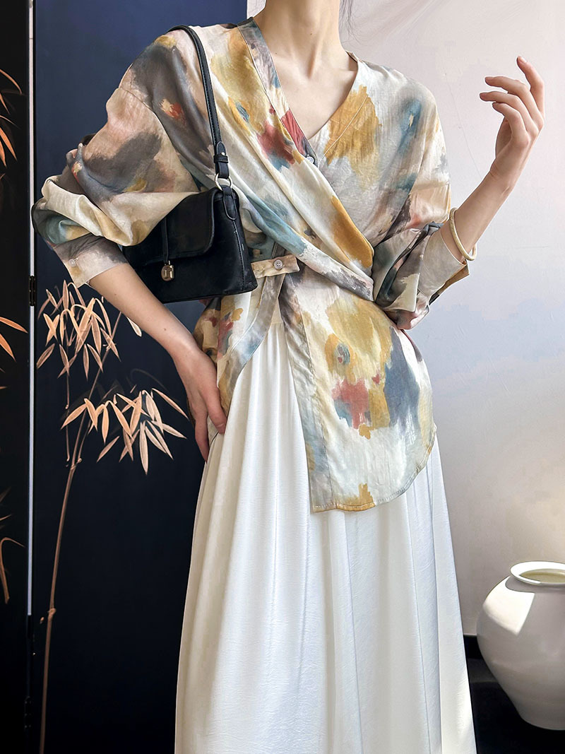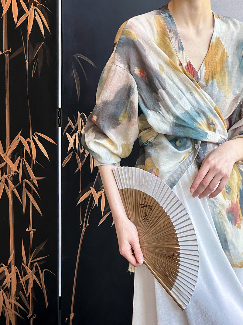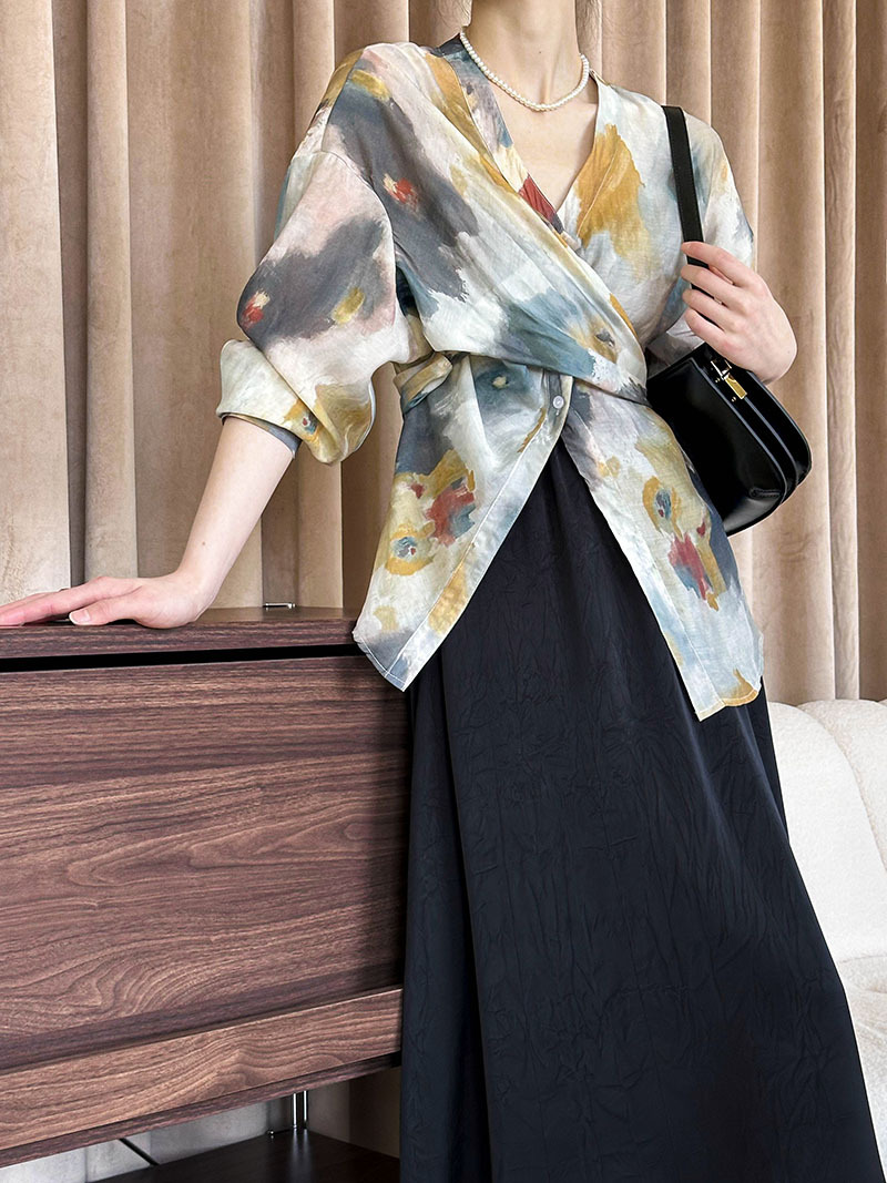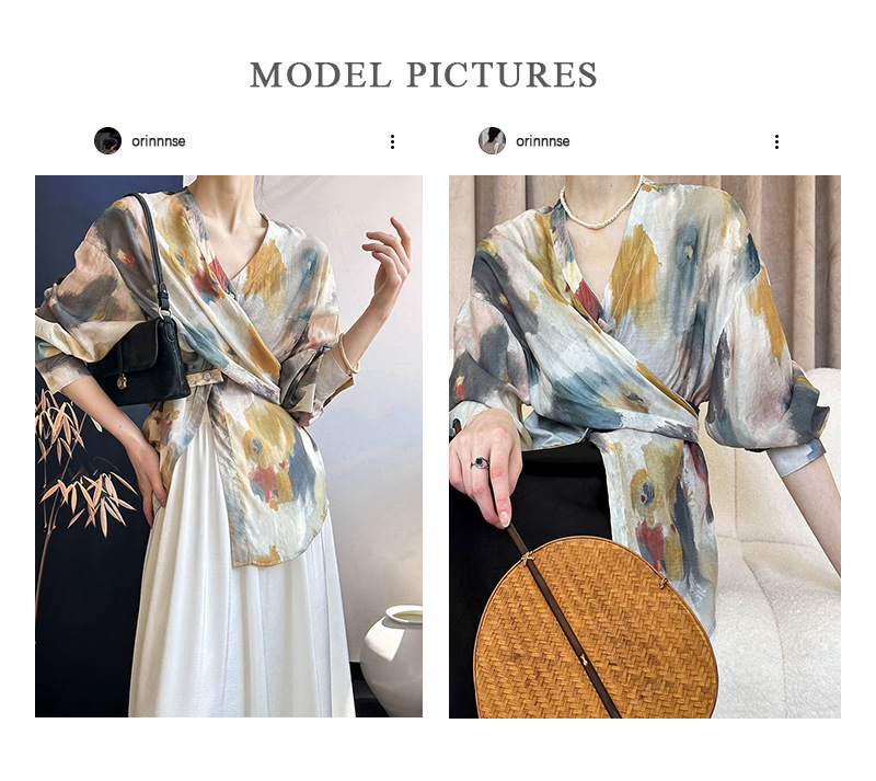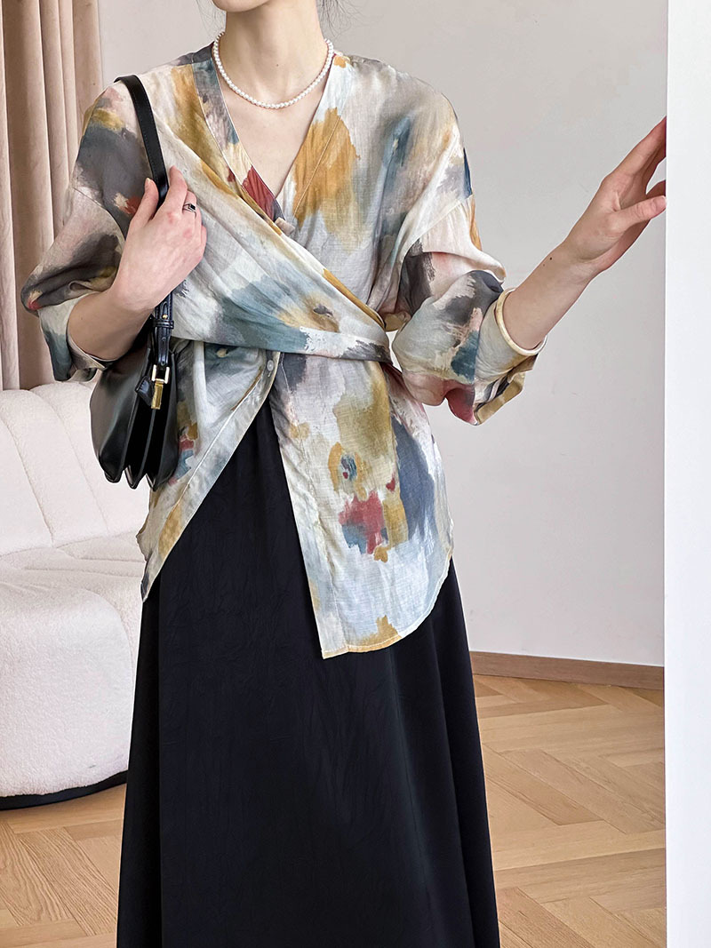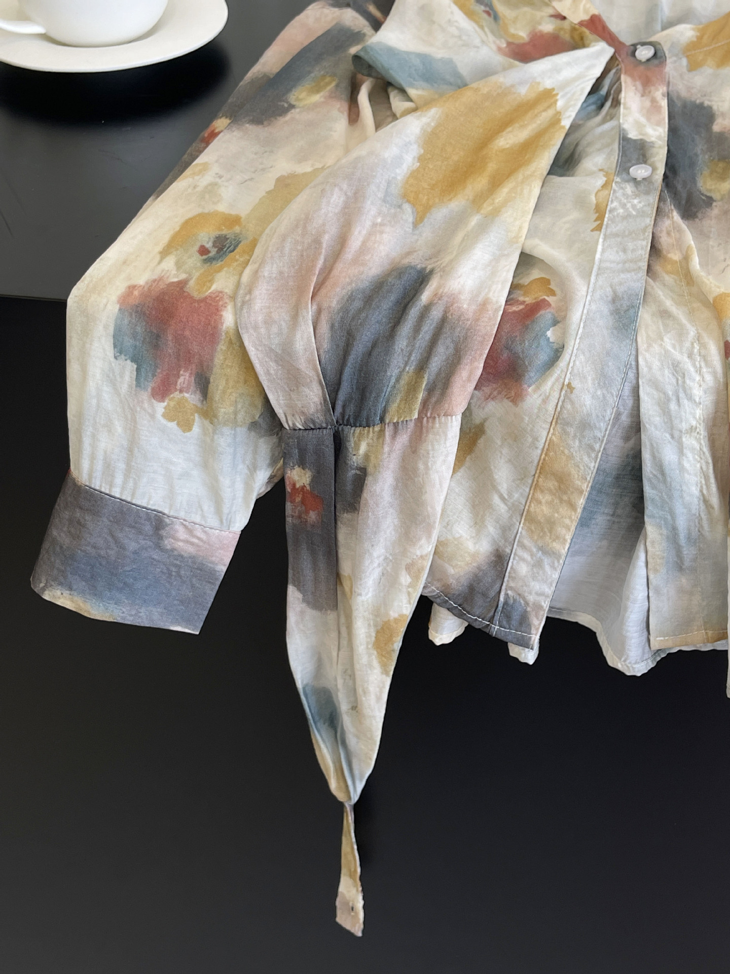 Áo kiểu dáng rộng tay thướt tha, phù hợp mặc trong mùa hè. Cổ chữ V cùng dây buộc mềm mại giúp tôn dáng người mặc. Chất vải nhẹ có khả năng ngăn nắng, in họa tiết loang màu nhẹ nhàng. Mẫu mã riêng biệt, dễ dàng phối với nhiều trang phục khác. Có thể mặc đi làm, dạo phố hay dự những buổi gặp mặt thân mật. | Tên sản phẩm: Áo Sơ Mi Nữ Cổ Chữ V Hàng Mùa Hè - Thời Trang Nữ | Mã sản phẩm: L0586 - Giá: 880.000đ | Mã nhà sản xuất: HADUN-G03Hình ảnh sản phẩm