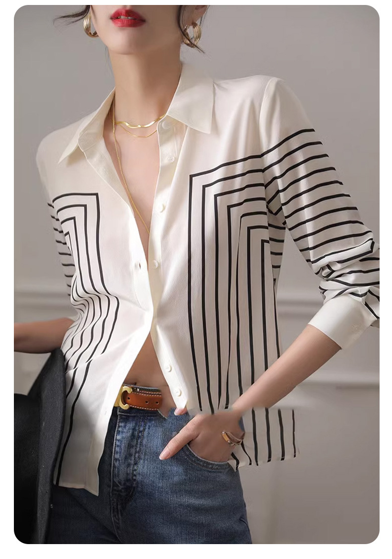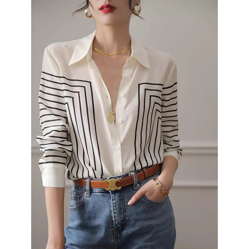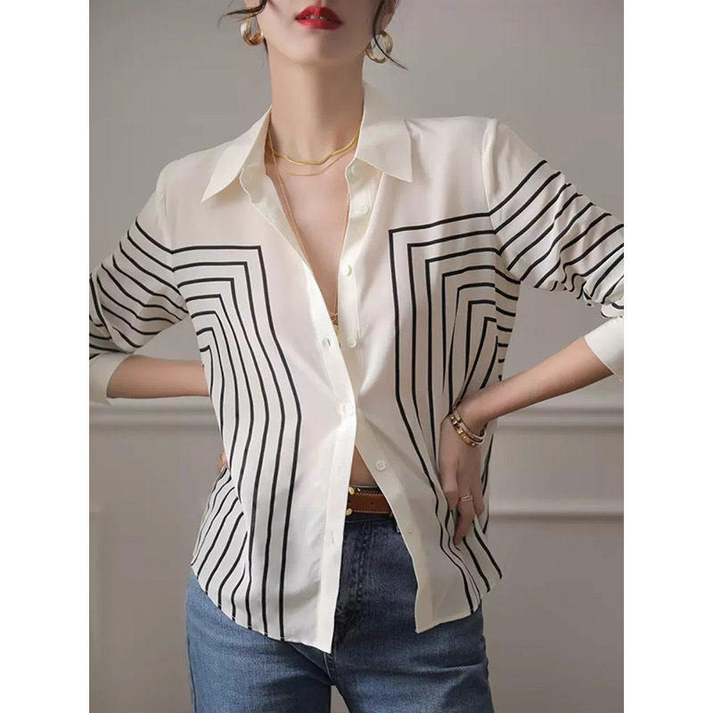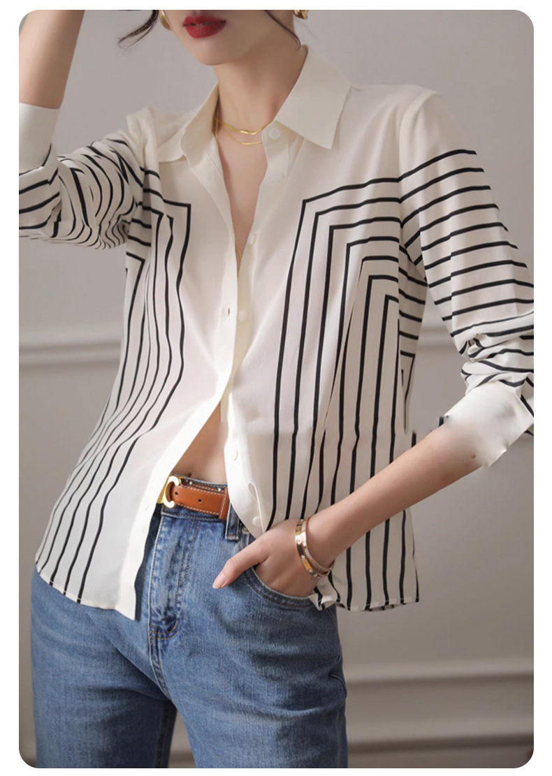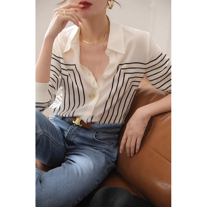 Áo kiểu dáng sơ mi polo tay dài, mang đến vẻ ngoại hình thanh lịch và dễ dàng kết hợp. Sản phẩm có các đường sọc trên nền màu be nhạt, tạo điểm nhấn nhẹ nhàng. Chất vải mềm mại, thoáng mát, phù hợp cho những ngày hè. Bạn có thể mặc đi làm, đi chơi hoặc dạo phố cùng quần jeans, chân váy. Mẫu mã này giúp tôn dáng một cách tự nhiên. | Tên sản phẩm: Áo Sơ Mi Nữ Dài Tay Hàng Mùa Hè - Thời Trang Nữ | Mã sản phẩm: B7091 - Giá: 880.000đ | Mã nhà sản xuất: DODG-G03Hình ảnh sản phẩm