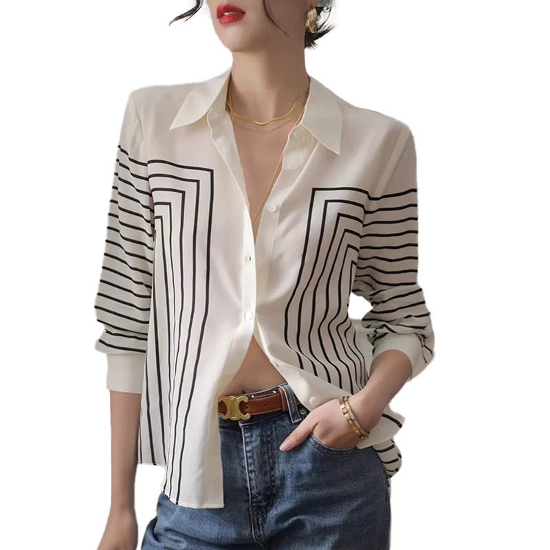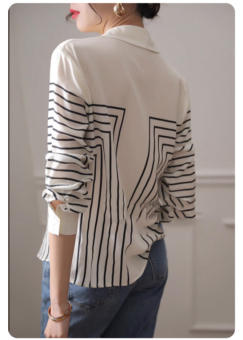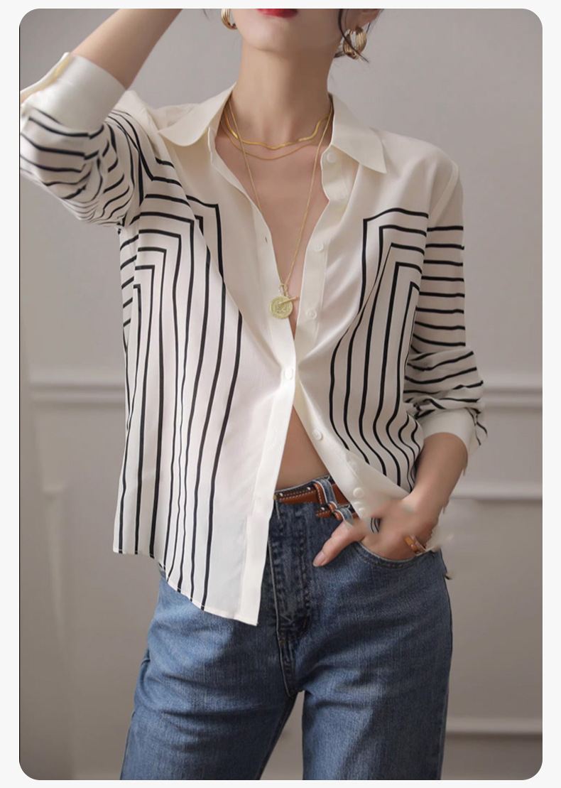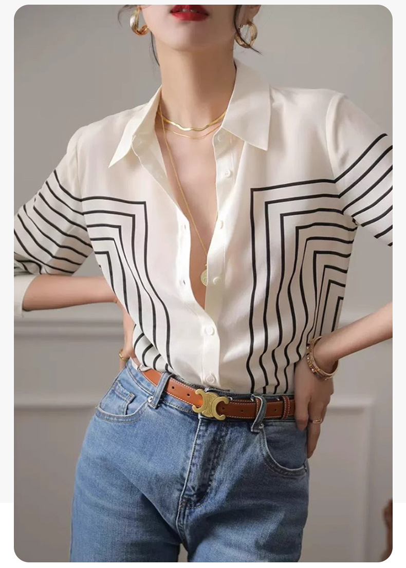 Áo kiểu dáng sơ mi polo tay dài, mang đến vẻ ngoại hình thanh lịch và dễ dàng kết hợp. Sản phẩm có các đường sọc trên nền màu be nhạt, tạo điểm nhấn nhẹ nhàng. Chất vải mềm mại, thoáng mát, phù hợp cho những ngày hè. Bạn có thể mặc đi làm, đi chơi hoặc dạo phố cùng quần jeans, chân váy. Mẫu mã này giúp tôn dáng một cách tự nhiên. | Tên sản phẩm: Áo Sơ Mi Nữ Dài Tay Hàng Mùa Hè - Thời Trang Nữ | Mã sản phẩm: B7091 - Giá: 880.000đ | Mã nhà sản xuất: DODG-G03Hình ảnh sản phẩm