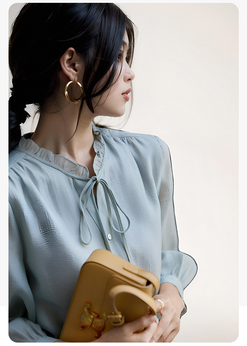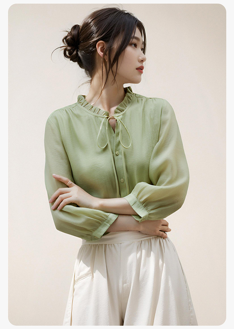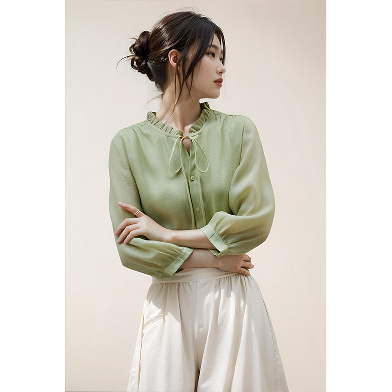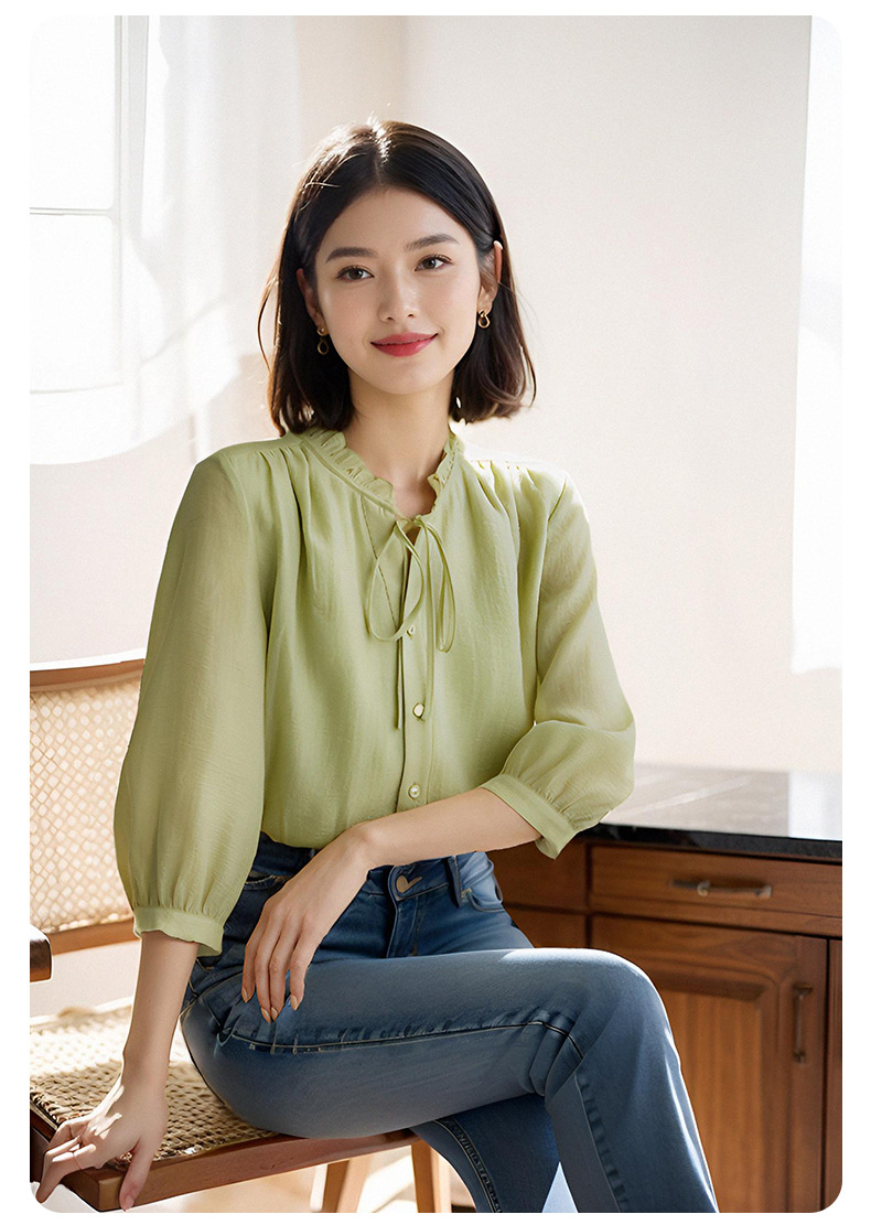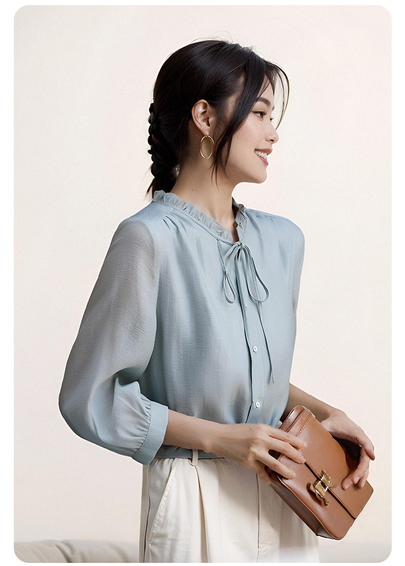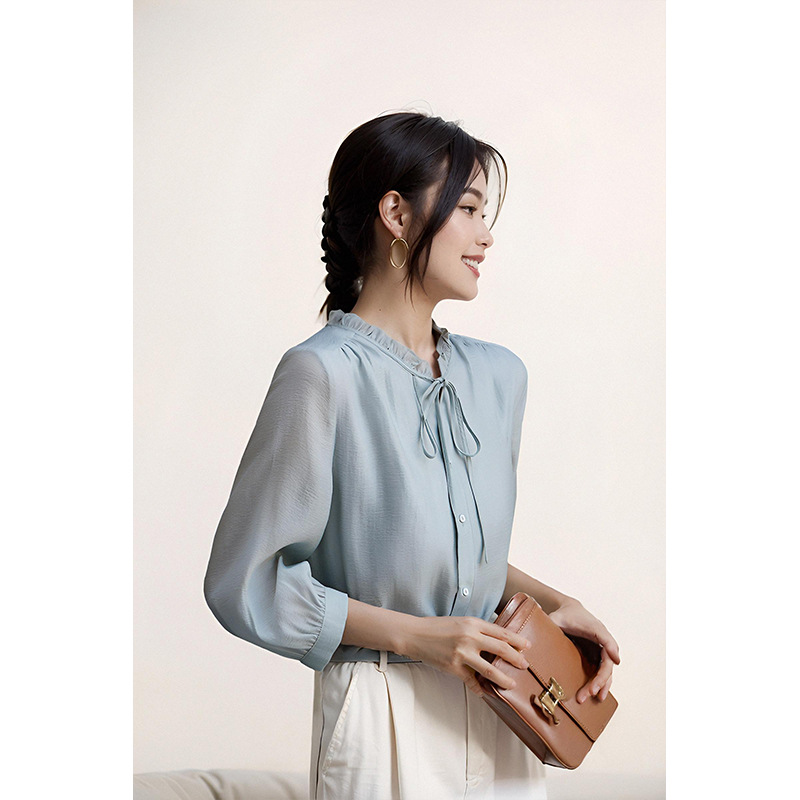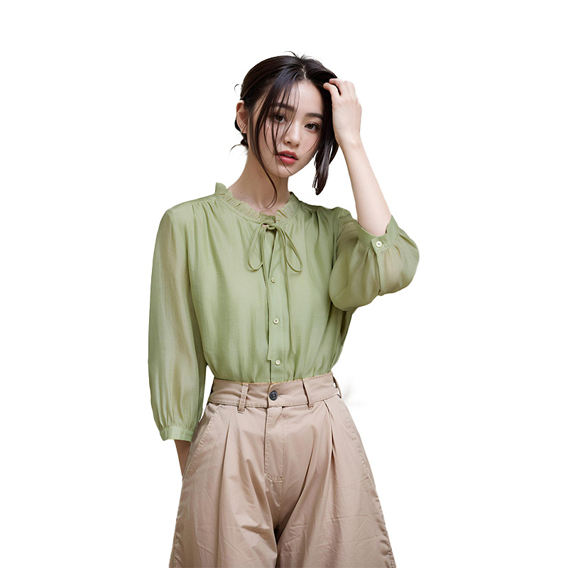 Áo sơ mi nữ với phần cổ xòe mềm mại như cánh hoa, tạo điểm nhấn thanh lịch. Tay áo dài bảy phần mang đến sự thoải mái, phù hợp cho nhiều hoàn cảnh. Màu xanh lá nhạt tươi mát, kiểu dáng đơn giản nhưng có đường nét thiết kế tinh tế. Chất vải mềm, nhẹ, thấm hút mồ hôi tốt cho những ngày hè. Dễ dàng phối cùng quần tây, chân váy để đi làm hoặc dạo phố. | Tên sản phẩm: Áo Sơ Mi Nữ Hàng Mùa Hè - Thời Trang Nữ | Mã sản phẩm: B7003 - Giá: 990.000đ | Mã nhà sản xuất: DODG-G03Hình ảnh sản phẩm