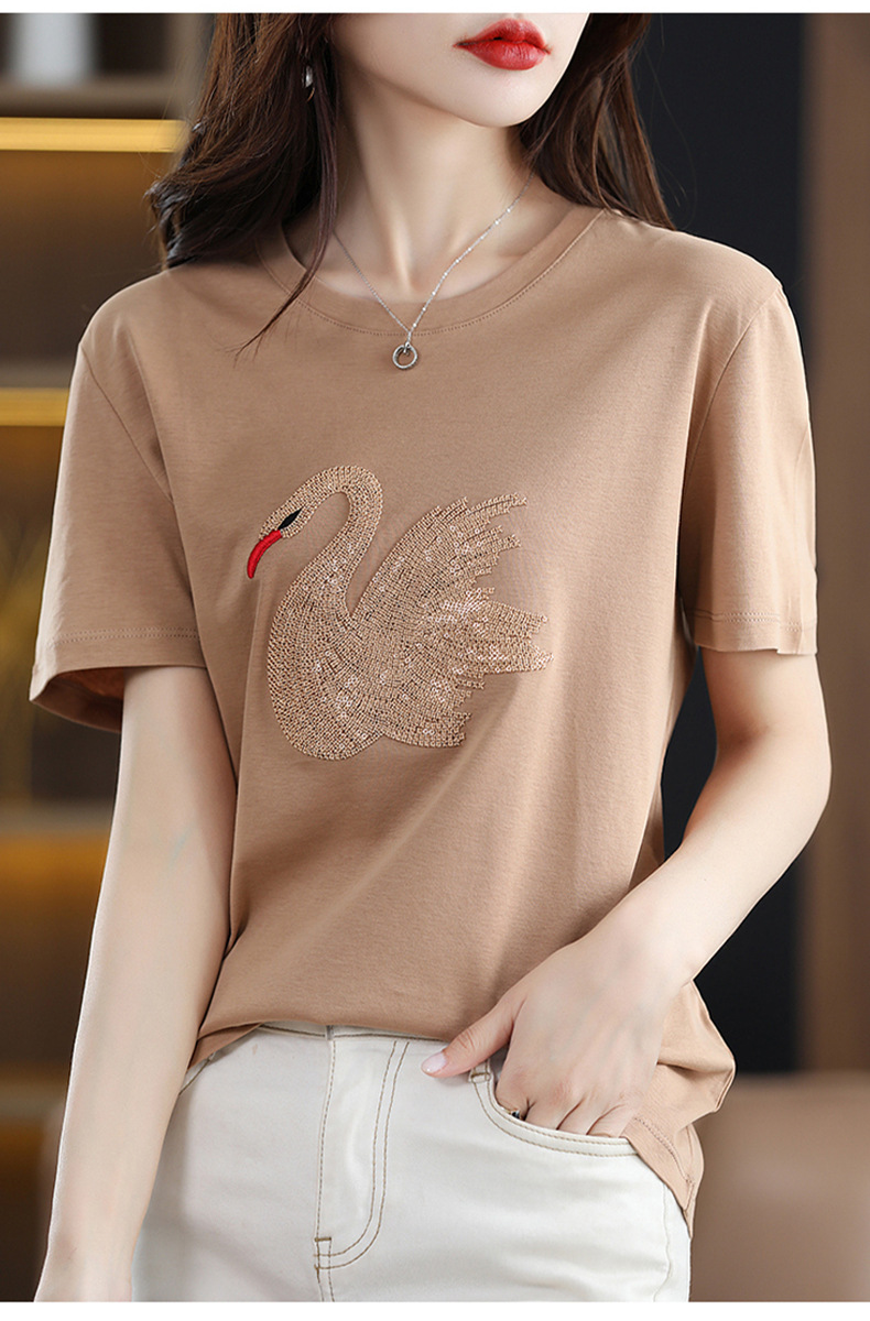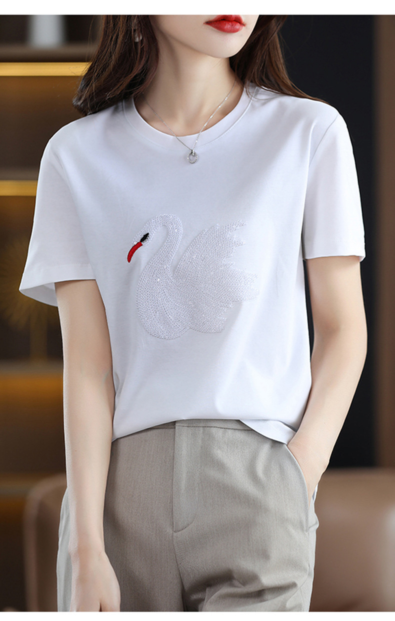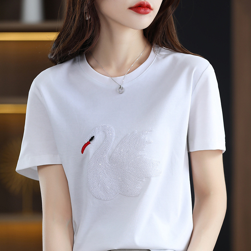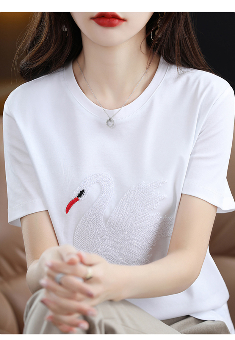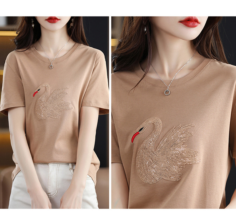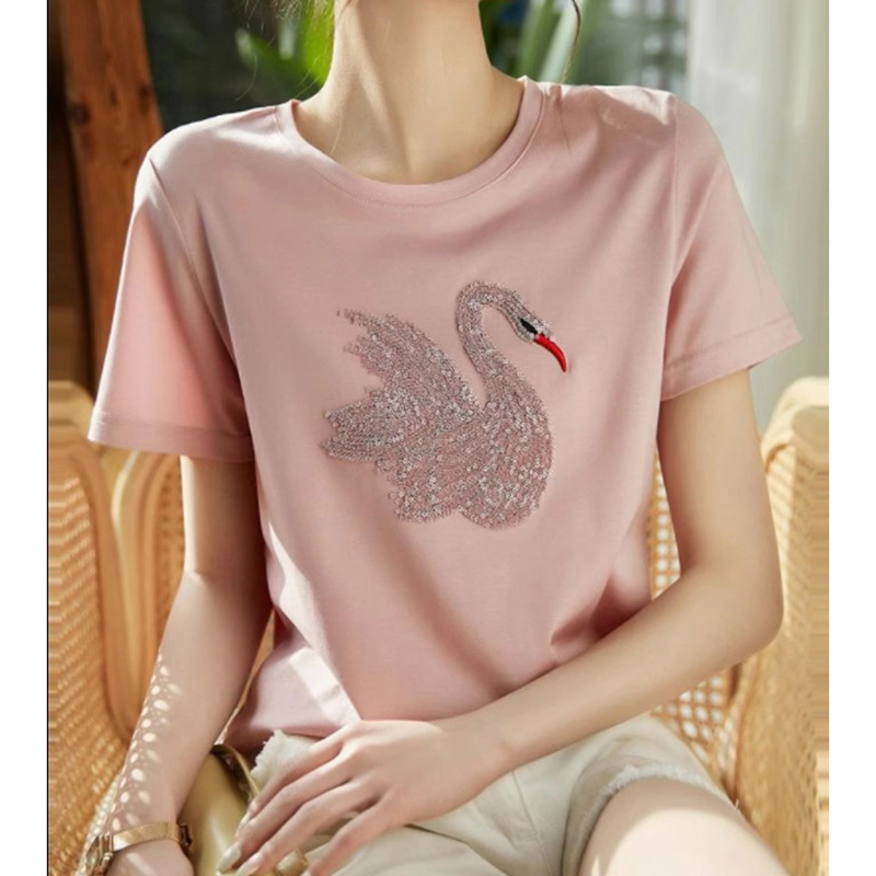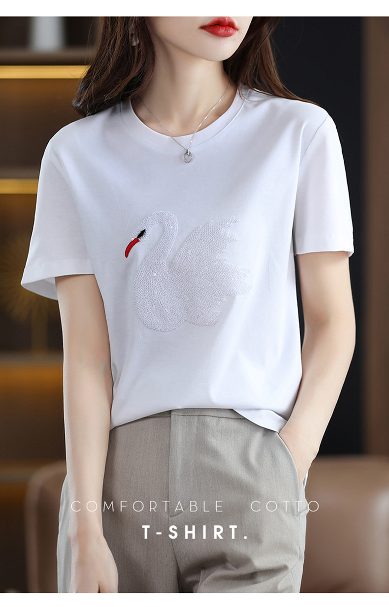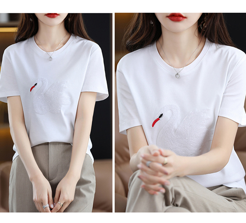 Áo thun tay ngắn có hình thêu chim thiên nga cách điệu, kiểu dáng mới cho mùa hè. Chất vải co giãn nhẹ, thoáng mát, tạo cảm giác dễ chịu khi mặc. Đường cắt may tinh tế giúp tôn dáng người mặc một cách tự nhiên. Họa tiết thêu tinh xảo làm điểm nhấn đặc biệt cho chiếc áo. Dễ dàng kết hợp với nhiều loại trang phục khác nhau như quần jeans, chân váy. Phù hợp cho nhiều hoạt động thường ngày. | Tên sản phẩm: Áo Thun Nữ Ngắn Tay Thêu Họa Tiết Hoa Trông Trẻ Hơn Tuổi Hàng Mùa Hè - Thời Trang Nữ | Mã sản phẩm: B7011 - Giá: 540.000đ | Mã nhà sản xuất: DODG-G01Hình ảnh sản phẩm