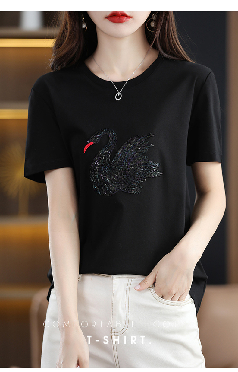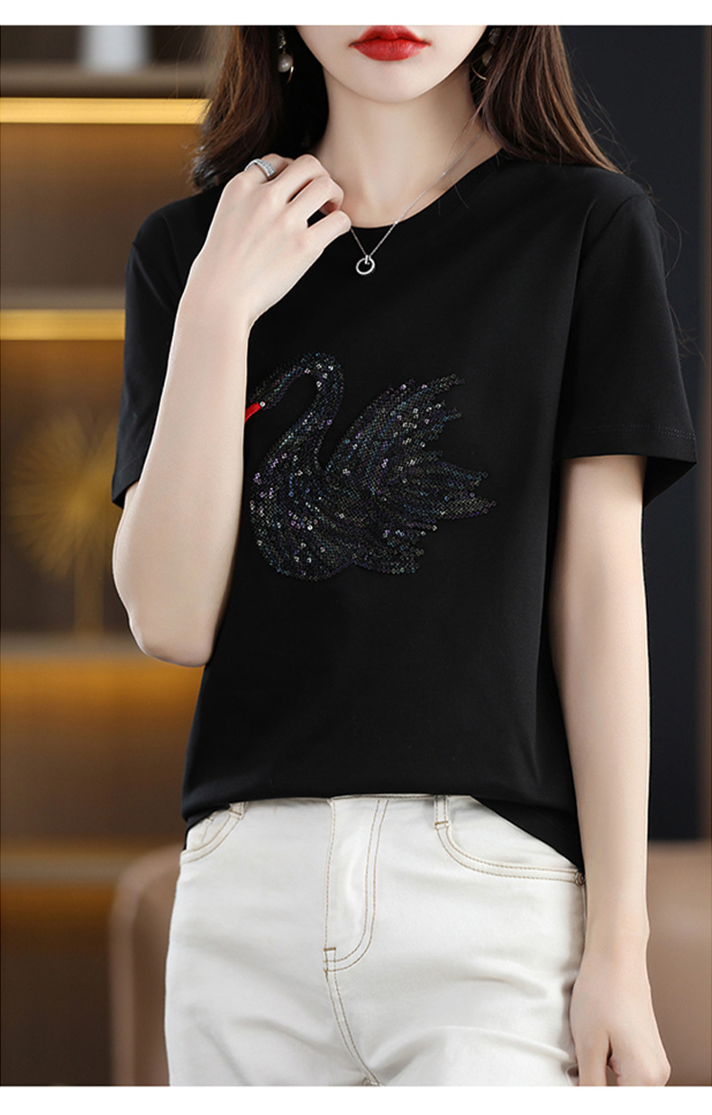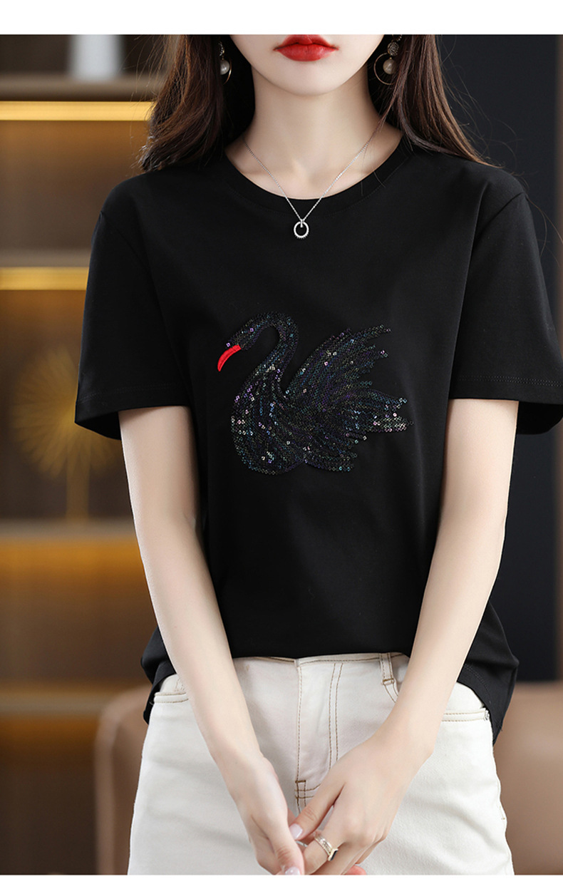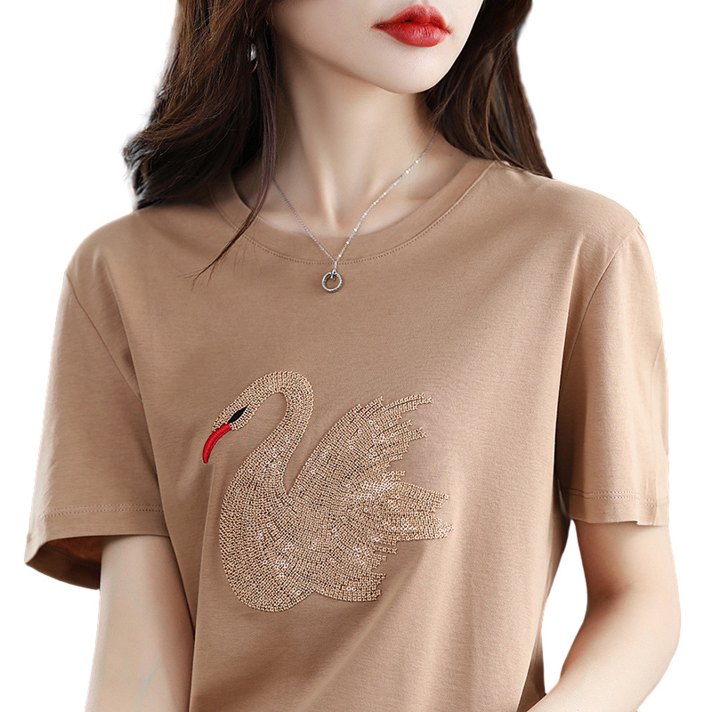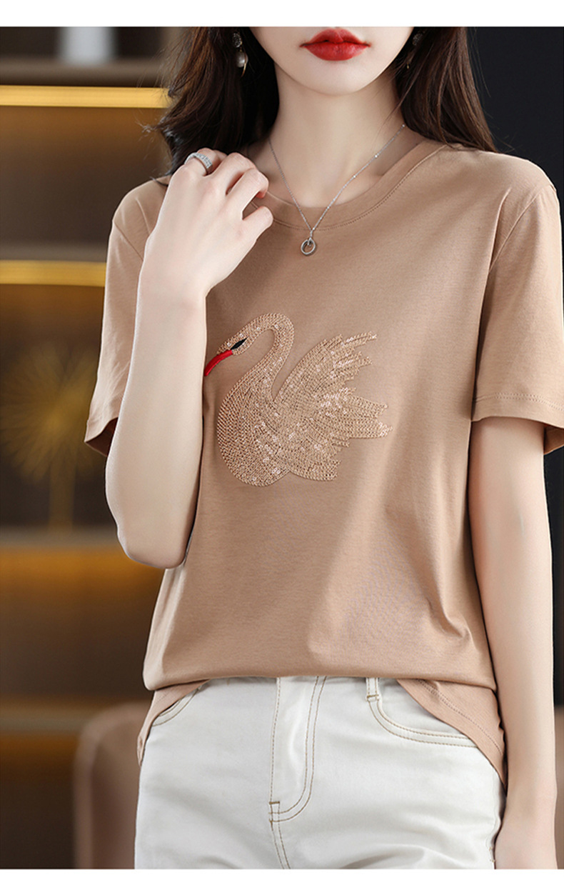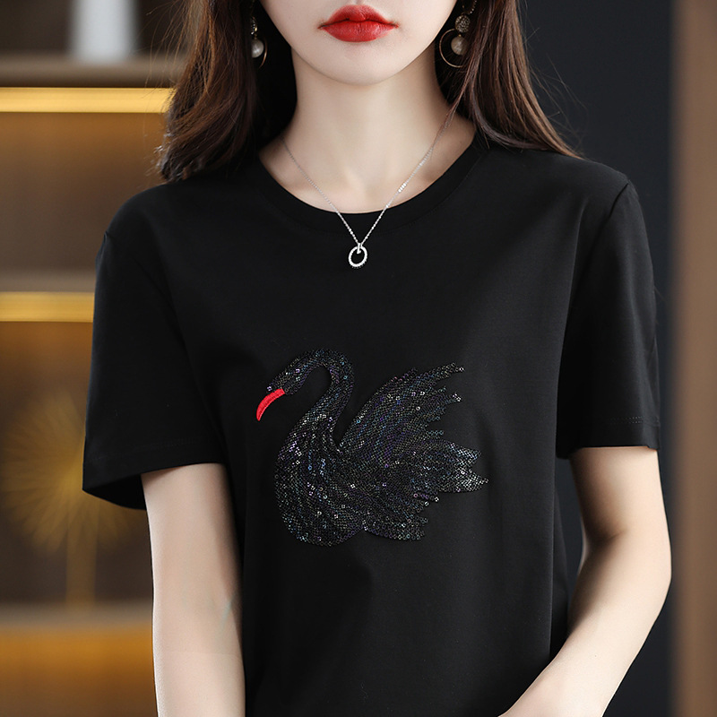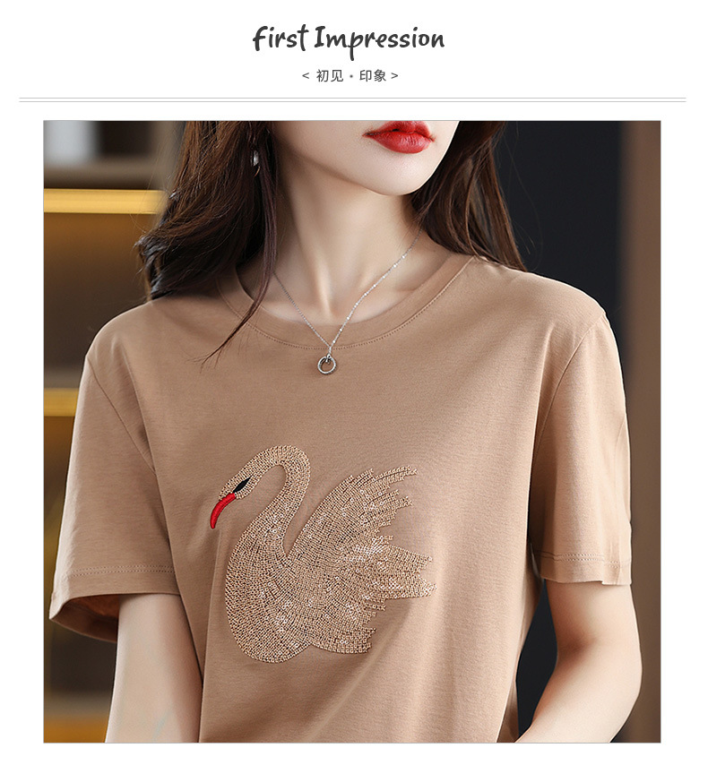 Áo thun tay ngắn có hình thêu chim thiên nga cách điệu, kiểu dáng mới cho mùa hè. Chất vải co giãn nhẹ, thoáng mát, tạo cảm giác dễ chịu khi mặc. Đường cắt may tinh tế giúp tôn dáng người mặc một cách tự nhiên. Họa tiết thêu tinh xảo làm điểm nhấn đặc biệt cho chiếc áo. Dễ dàng kết hợp với nhiều loại trang phục khác nhau như quần jeans, chân váy. Phù hợp cho nhiều hoạt động thường ngày. | Tên sản phẩm: Áo Thun Nữ Ngắn Tay Thêu Họa Tiết Hoa Trông Trẻ Hơn Tuổi Hàng Mùa Hè - Thời Trang Nữ | Mã sản phẩm: B7011 - Giá: 540.000đ | Mã nhà sản xuất: DODG-G01Hình ảnh sản phẩm