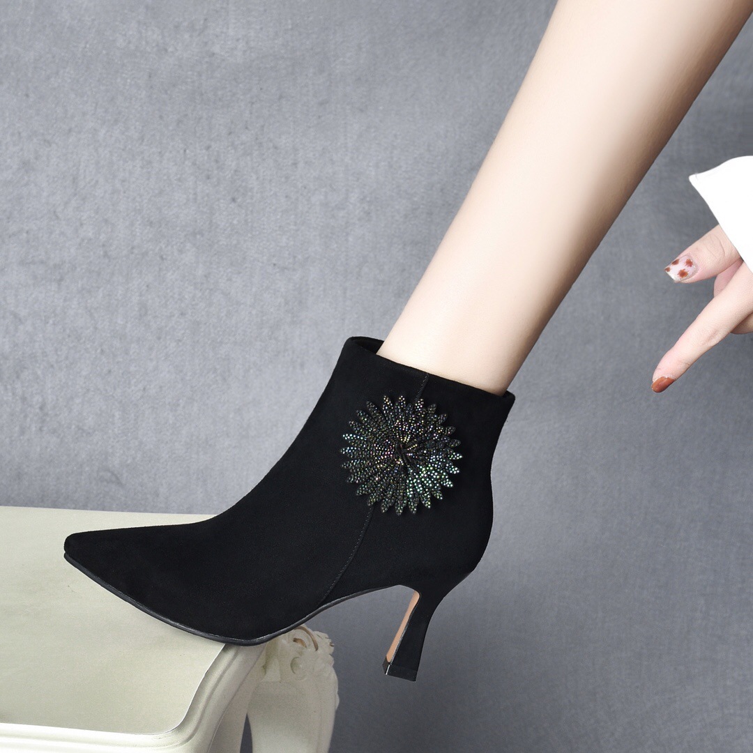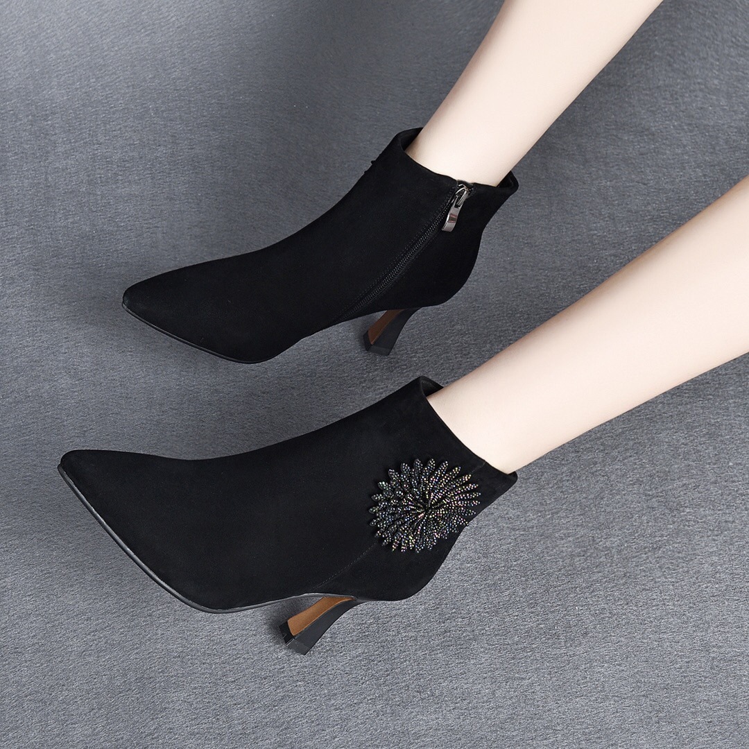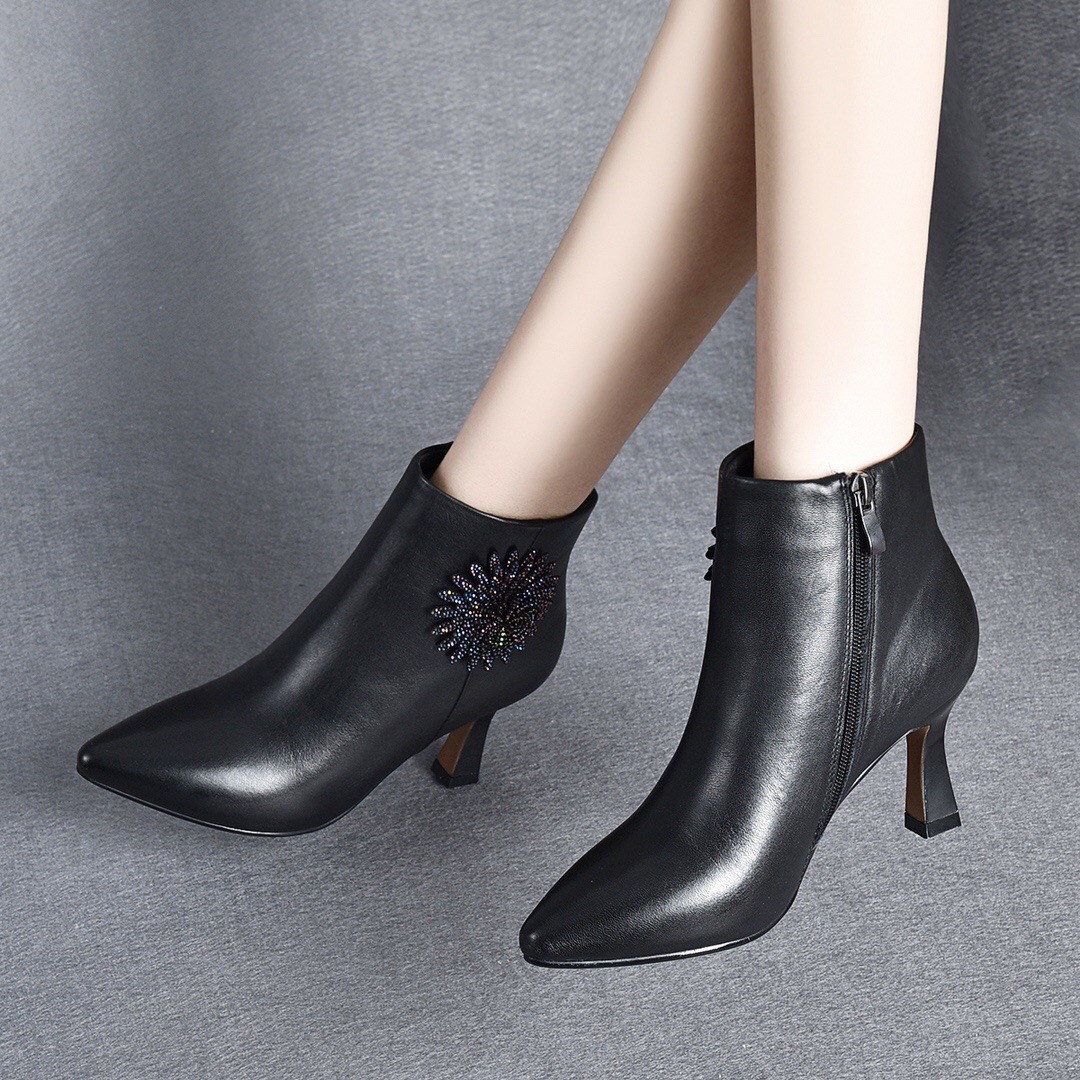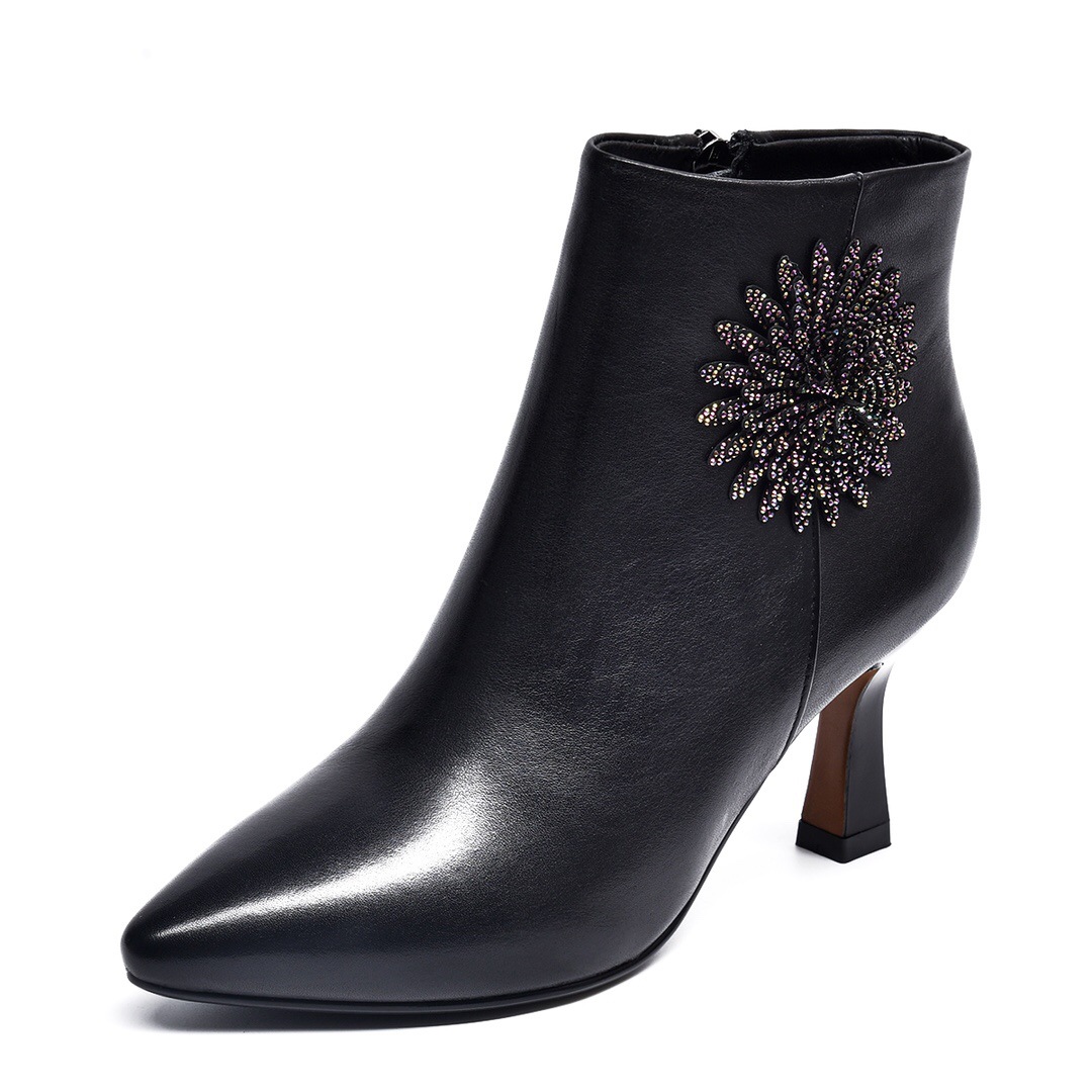Đôi bốt cổ thấp này có phần mũi nhọn và gót thanh mảnh, tôn lên dáng vẻ thanh lịch. Sản phẩm làm từ chất liệu da mềm mại, ôm chân nhưng vẫn thoải mái khi di chuyển. Điểm nhấn là những viên đá lấp lánh được đính tinh tế quanh cổ bốt, tạo nên nét nổi bật riêng. Kiểu dáng này rất dễ phối đồ, bạn có thể mang cùng quần jeans, váy hay quần âu. Dùng khăn mềm lau sạch bụi và bảo quản nơi khô ráo sau khi sử dụng. | Tên sản phẩm: Boot Cổ Thấp Nữ Chất Liệu Da Bò Gắn Đá Gót Nhọn Hàng Mùa Xuân Thu Đông - Giày Dép Nữ | Mã sản phẩm: D5426 - Giá: 1.350.000đ | Mã nhà sản xuất: TOREHU-G04Hình ảnh sản phẩm