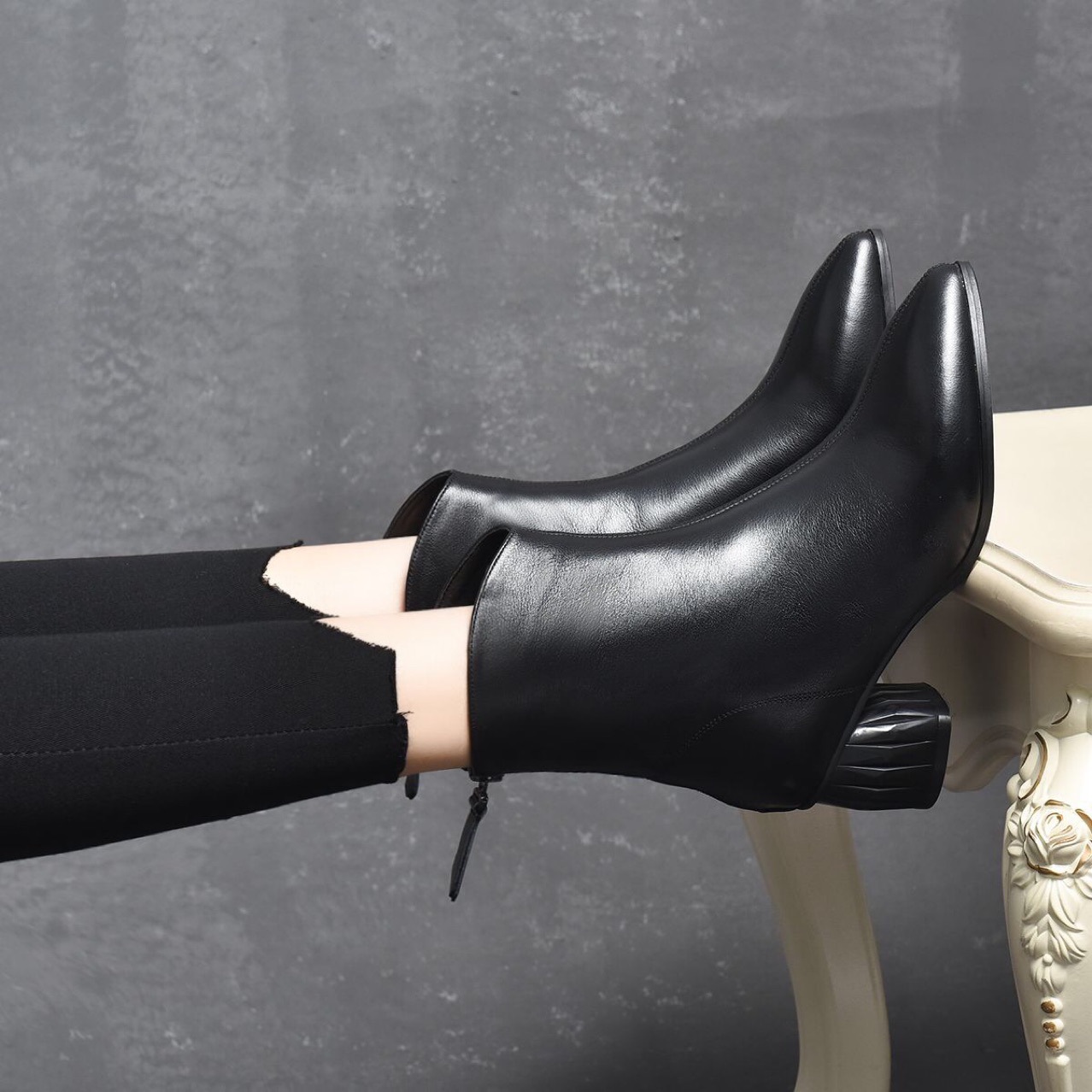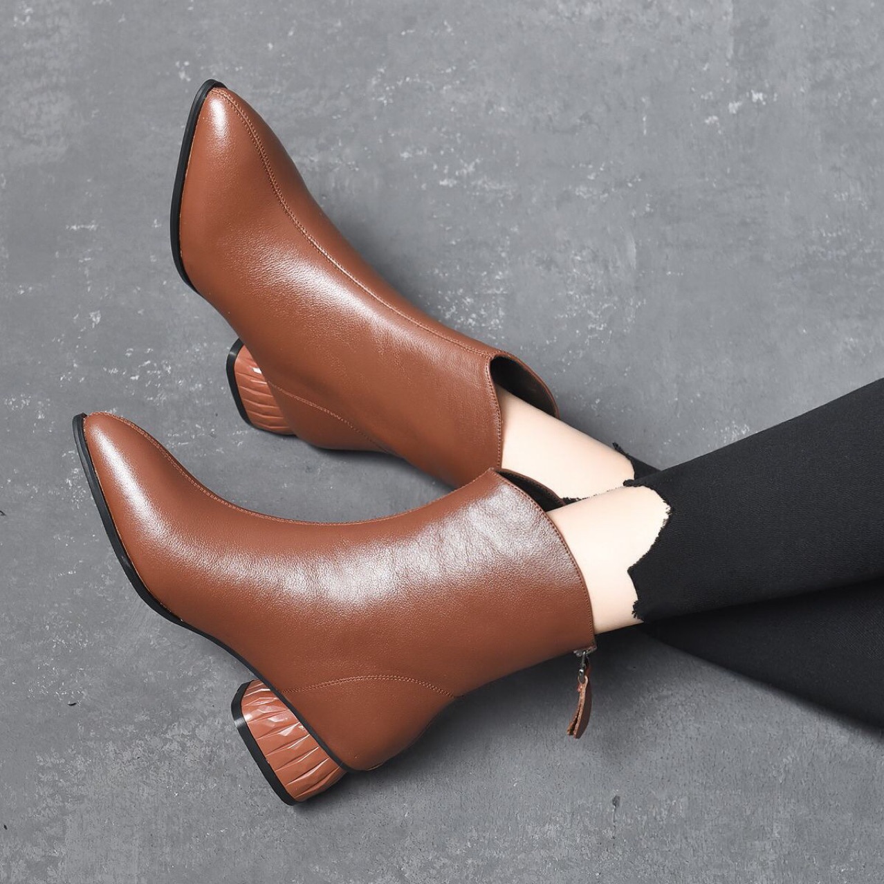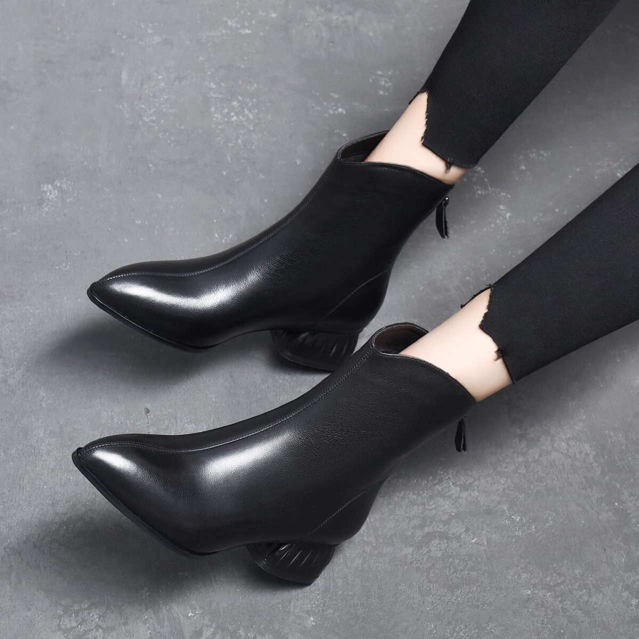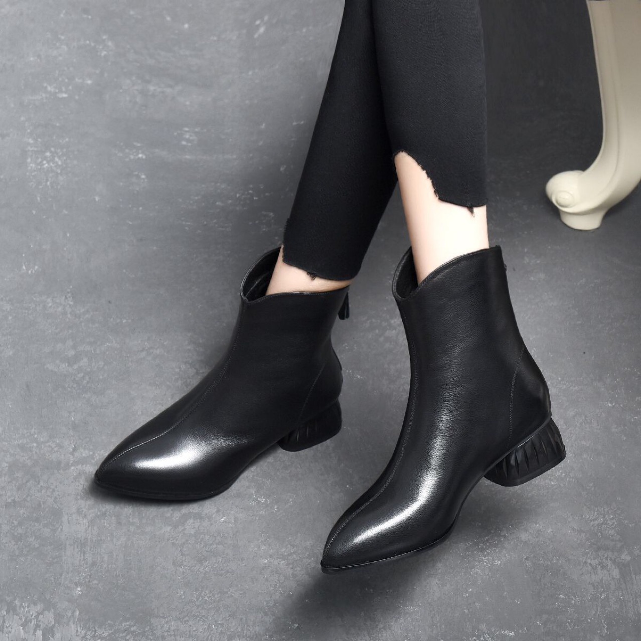 Đôi bốt cổ thấp này có phần mũi nhọn và cổ giày khoét hình chữ V độc đáo. Sản phẩm được làm từ chất liệu da thật, bền đẹp. Phần đế được thiết kế có lớp đệm bên trong giúp tăng chiều cao, cùng với gót chắc chắn tạo dáng đứng vững. Kiểu dáng phù hợp để kết hợp với nhiều loại trang phục khác nhau. Bạn có thể mang chúng hằng ngày, rất tiện lợi và thoải mái khi di chuyển. | Tên sản phẩm: Boot Cổ Thấp Nữ Chất Liệu Da Bò Mũi Nhọn Gót Vuông Tăng Chiều Cao - Giày Dép Nữ | Mã sản phẩm: D5454 - Giá: 1.520.000đ | Mã nhà sản xuất: TOREHU-G04Hình ảnh sản phẩm