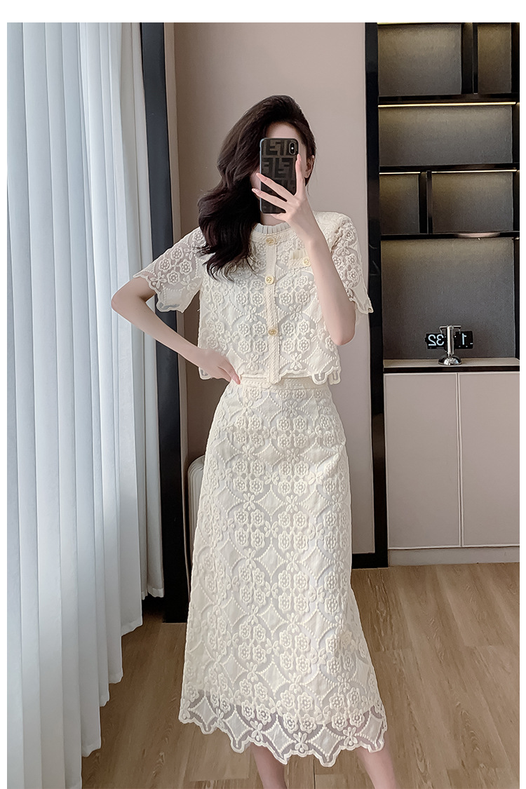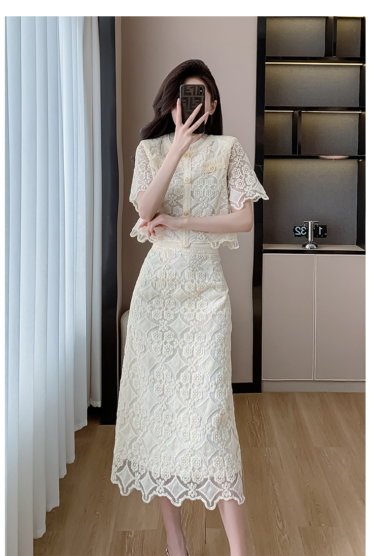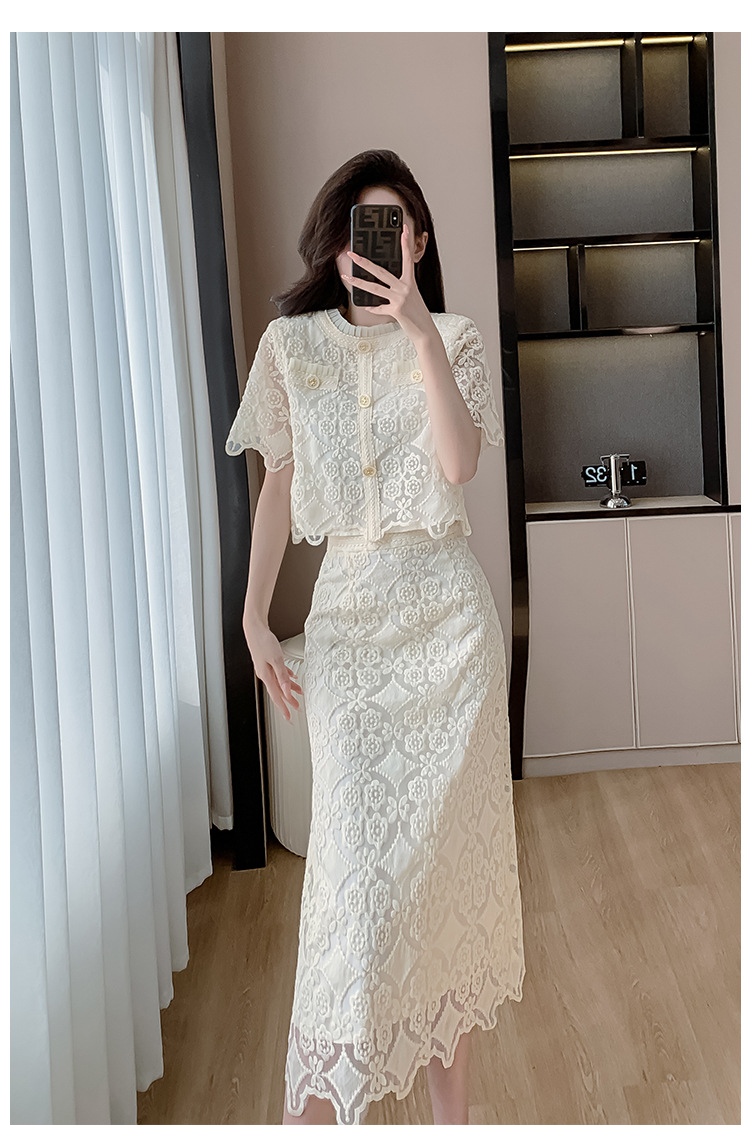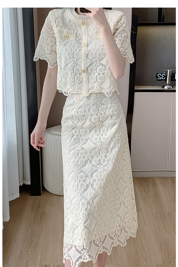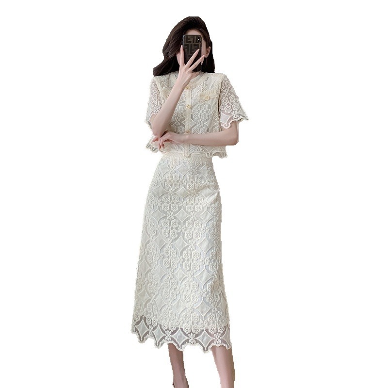 Bộ trang phục hai mảnh này mang phong cách thời trang với họa tiết ren tinh tế. Áo tay ngắn thiết kế cổ điển, kết hợp cùng chân váy dáng cao eo, tôn lên vẻ duyên dáng cho người mặc. Chất vải mềm mại, thoáng mát, thích hợp cho những ngày hè. Bạn có thể mặc nguyên bộ để tạo sự chỉn chu, hoặc phối cùng các trang phục khác để đa dạng phong cách. Sản phẩm dễ dàng giặt bằng tay hoặc máy ở chế độ nhẹ. | Tên sản phẩm: Đồ Bộ Nữ Chất Liệu Ren Ngắn Tay Cả Bộ 2 Món Hàng Mùa Hè - Thời Trang Nữ | Mã sản phẩm: B0239 - Giá: 970.000đ | Mã nhà sản xuất: ZHOUT-G03Hình ảnh sản phẩm