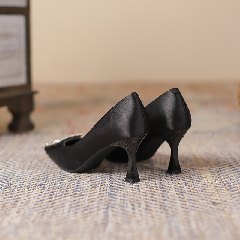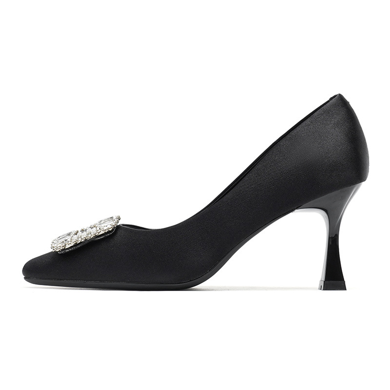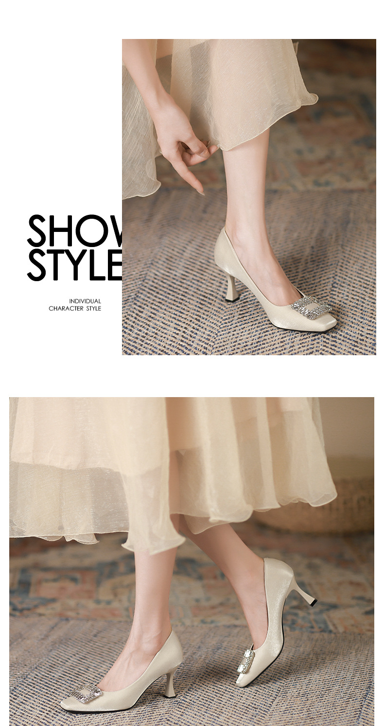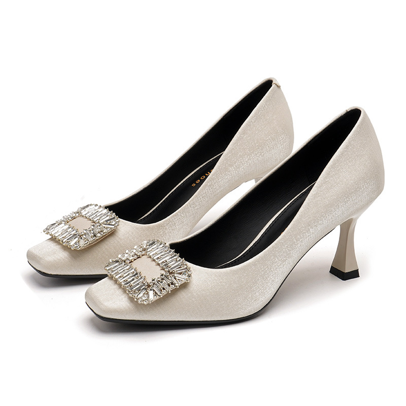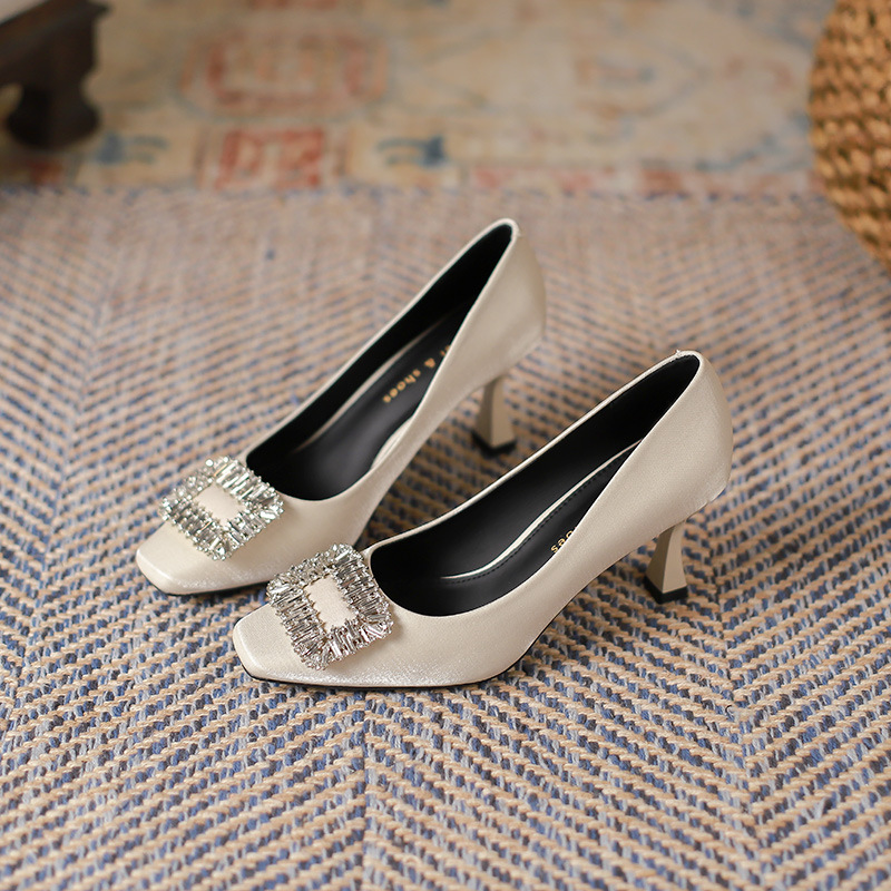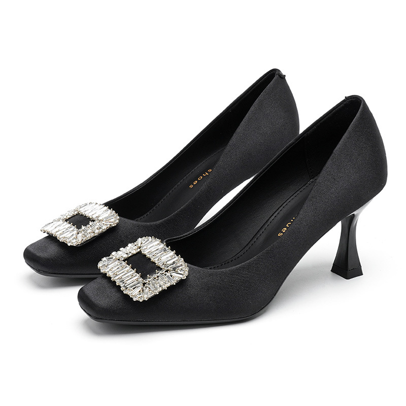 Đôi giày này có phần mũi vuông thanh lịch, đi kèm gót nhọn cao vừa phải giúp tôn dáng. Điểm nhấn nổi bật là chi tiết khóa hình vuông được đính những hạt pha lê lấp lánh tinh tế. Chất liệu vải mềm mại mang đến cảm giác dễ chịu khi mang. Kiểu dáng hở mũi, thiết kế đơn giản và dễ phối đồ, thích hợp để đi làm hoặc dùng trong nhiều dịp khác nhau. Bạn chỉ cần xỏ chân vào và cài khóa là đã có ngay một phong cách chỉn chu. | Tên sản phẩm: Giày Cao Gót Nữ Gắn Đá Gót Nhọn Hàng Mùa Xuân Thu Đông Phong Cách Hàn Quốc - Giày Dép Nữ | Mã sản phẩm: L0578 - Giá: 940.000đ | Mã nhà sản xuất: HURYAN-G03Hình ảnh sản phẩm