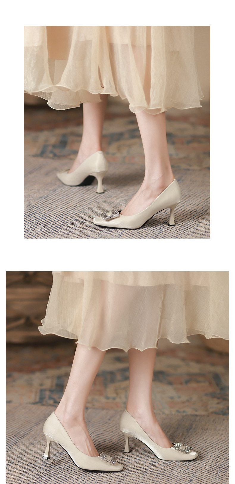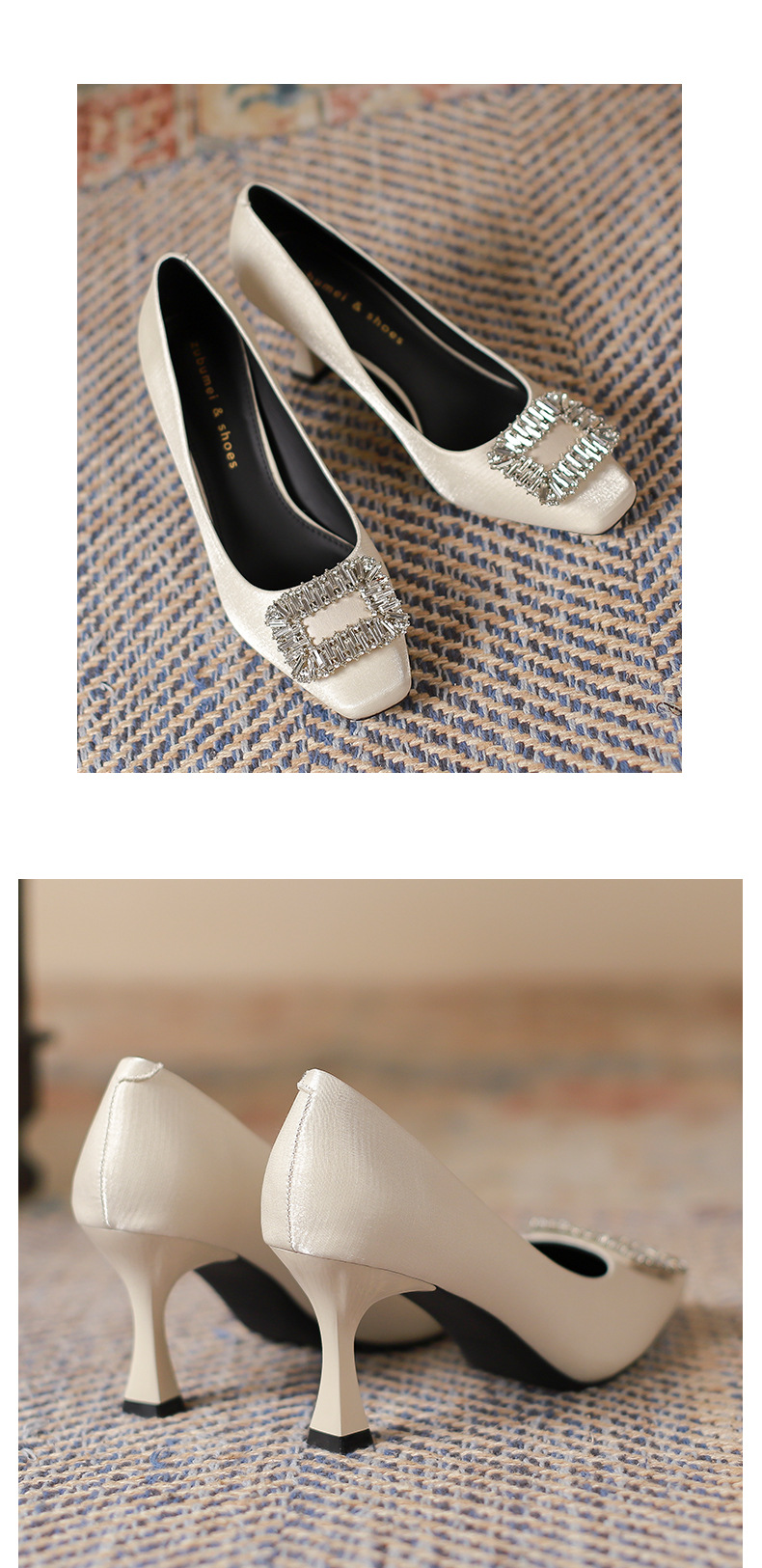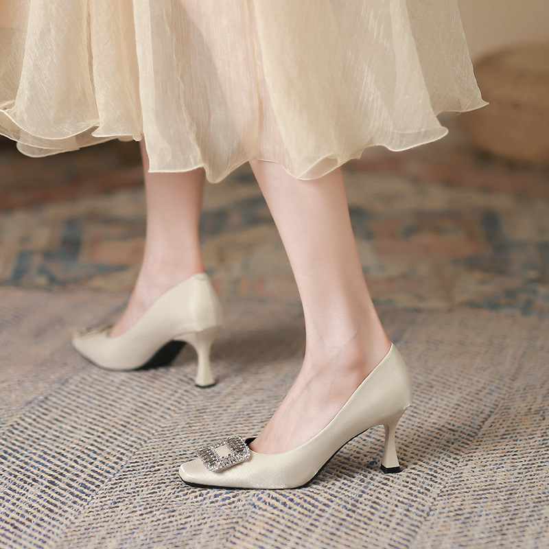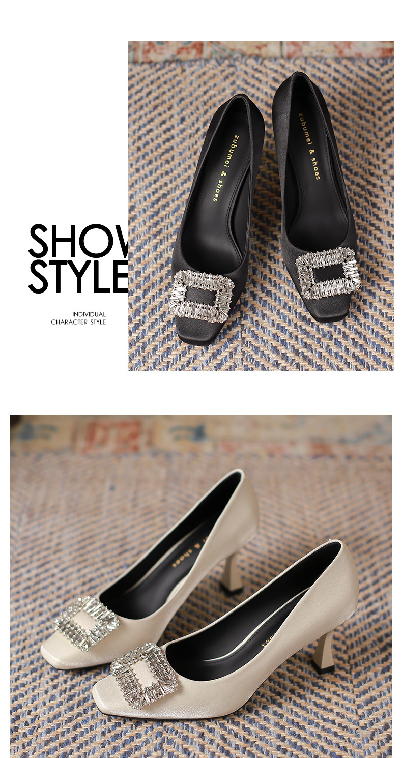 Đôi giày này có phần mũi vuông thanh lịch, đi kèm gót nhọn cao vừa phải giúp tôn dáng. Điểm nhấn nổi bật là chi tiết khóa hình vuông được đính những hạt pha lê lấp lánh tinh tế. Chất liệu vải mềm mại mang đến cảm giác dễ chịu khi mang. Kiểu dáng hở mũi, thiết kế đơn giản và dễ phối đồ, thích hợp để đi làm hoặc dùng trong nhiều dịp khác nhau. Bạn chỉ cần xỏ chân vào và cài khóa là đã có ngay một phong cách chỉn chu. | Tên sản phẩm: Giày Cao Gót Nữ Gắn Đá Gót Nhọn Hàng Mùa Xuân Thu Đông Phong Cách Hàn Quốc - Giày Dép Nữ | Mã sản phẩm: L0578 - Giá: 940.000đ | Mã nhà sản xuất: HURYAN-G03Hình ảnh sản phẩm