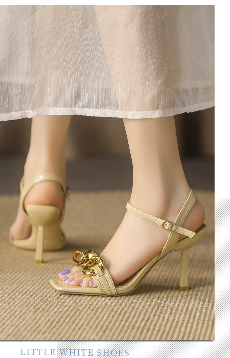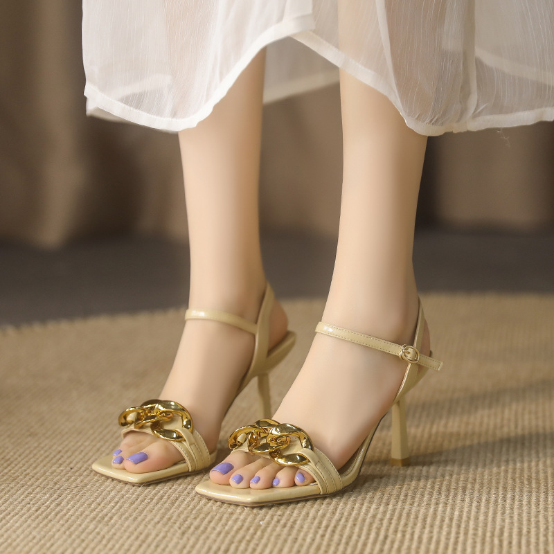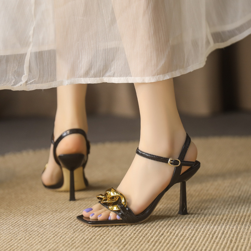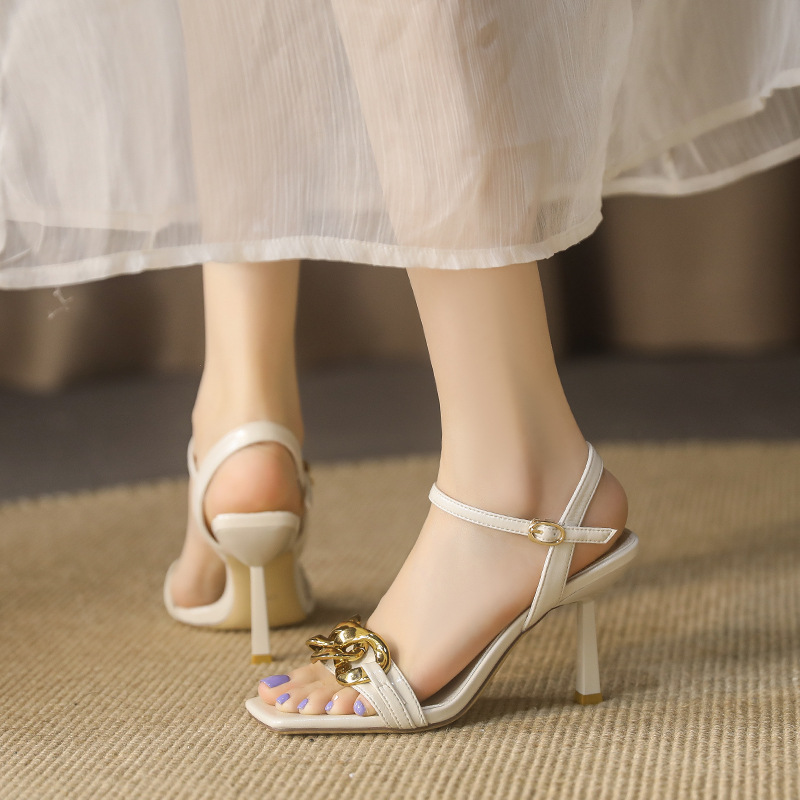 Đôi giày sandal nữ này có thiết kế mũi vuông thanh lịch, kèm theo qu ngang với khóa cài hình dáng đơn giản và dễ dàng điều chỉnh. Phần gót nhọn tạo dáng thanh thoát, phù hợp để diện trong mùa hè. Sản phẩm được kết hợp thêm chi tiết dây xích kim loại tăng phần nổi bật. Bạn có thể mang đôi giày này để kết hợp cùng nhiều loại trang phục khác nhau. | Tên sản phẩm: Giày Cao Gót Nữ Gót Nhọn Quai Hậu Hàng Mùa Hè - Giày Dép Nữ | Mã sản phẩm: B3176 - Giá: 1.190.000đ | Mã nhà sản xuất: ZHDIA-G04Hình ảnh sản phẩm
