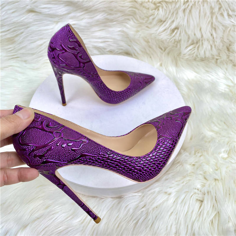 Đôi giày này có phần mũi nhọn và gót nhọn cao mười hai phân, tạo dáng thanh thoát. Chất da mềm mại giúp mang êm ái cả ngày. Kiểu dáng cổ thấp ôm gọn bàn chân, phù hợp cho nhiều dịp. Bề mặt da nổi vân giống da rắn với màu tím thời thượng, tạo điểm nhấn riêng. Có thể phối hợp cùng nhiều trang phục khác nhau để tạo nên vẻ đẹp cá tính. | Tên sản phẩm: Giày Cao Gót Nữ Mũi Nhọn Gót Nhọn - Giày Dép Nữ | Mã sản phẩm: E9547 - Giá: 1.280.000đ | Mã nhà sản xuất: HURYNG-G04Hình ảnh sản phẩm