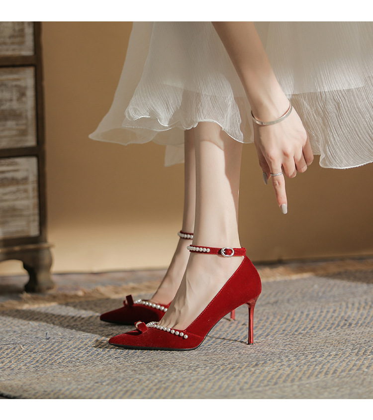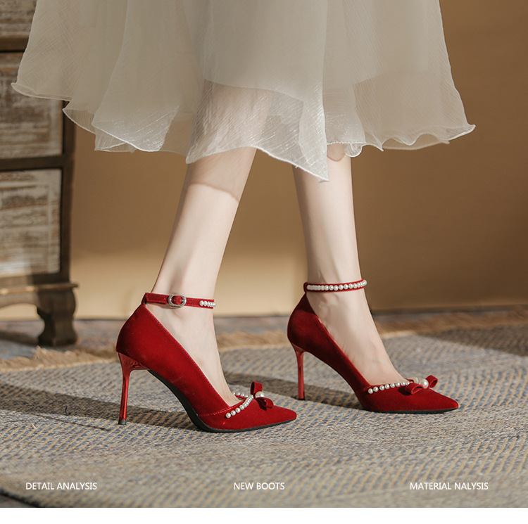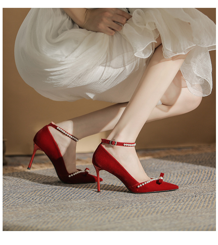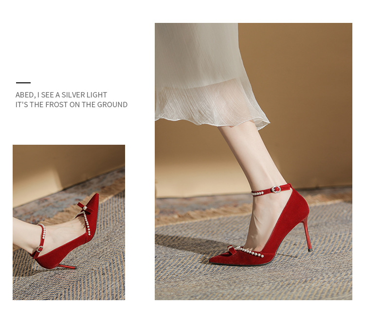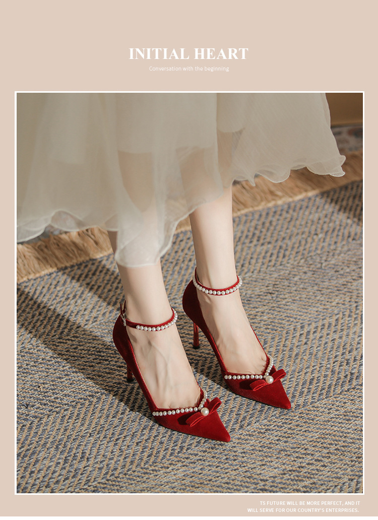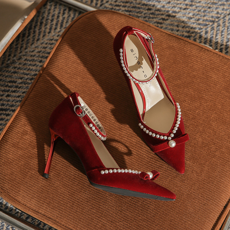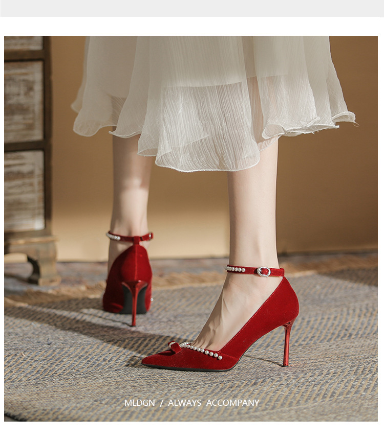 Đôi giày cao gót này có phần gót thanh mảnh và mũi nhọn, tạo dáng thanh lịch. Trên dây đeo ngang cổ chân được điểm xuyết những viên ngọc tr nhỏ, thêm phần nữ tính. Kiểu dáng phù hợp cho các dịp quan trọng như lễ cưới, tiệc. Sản phẩm có qu dạng dây đeo chữ T ôm sát chân, giúp bạn di chuyển thoải mái và tự tin hơn. | Tên sản phẩm: Giày Cao Gót Nữ Mũi Nhọn Gót Nhọn Dùng Trong Lễ Cưới - Giày Dép Nữ | Mã sản phẩm: A1284 - Giá: 830.000đ | Mã nhà sản xuất: HUDS-G03Hình ảnh sản phẩm