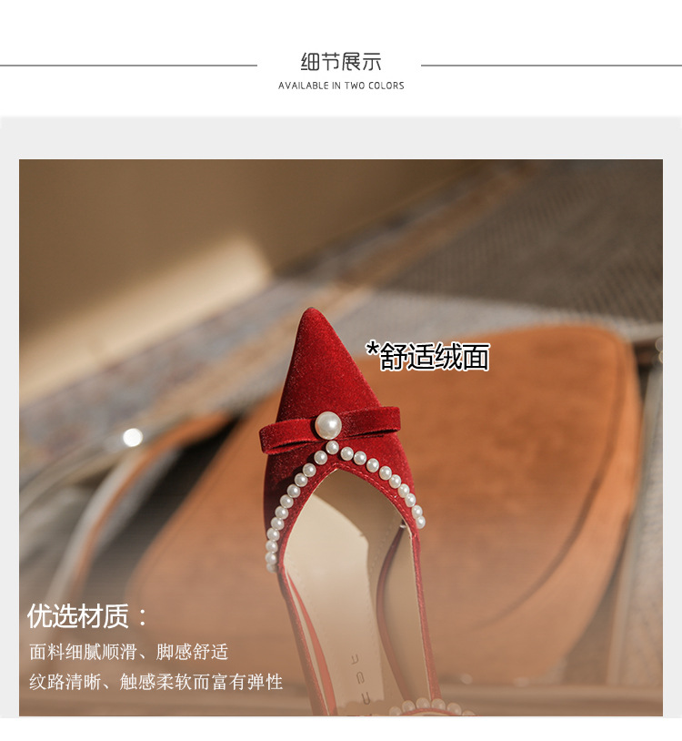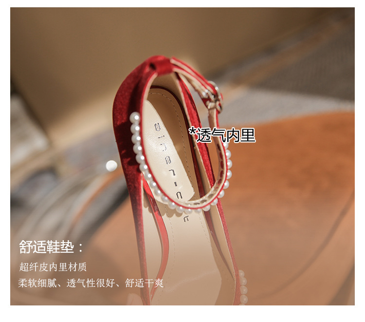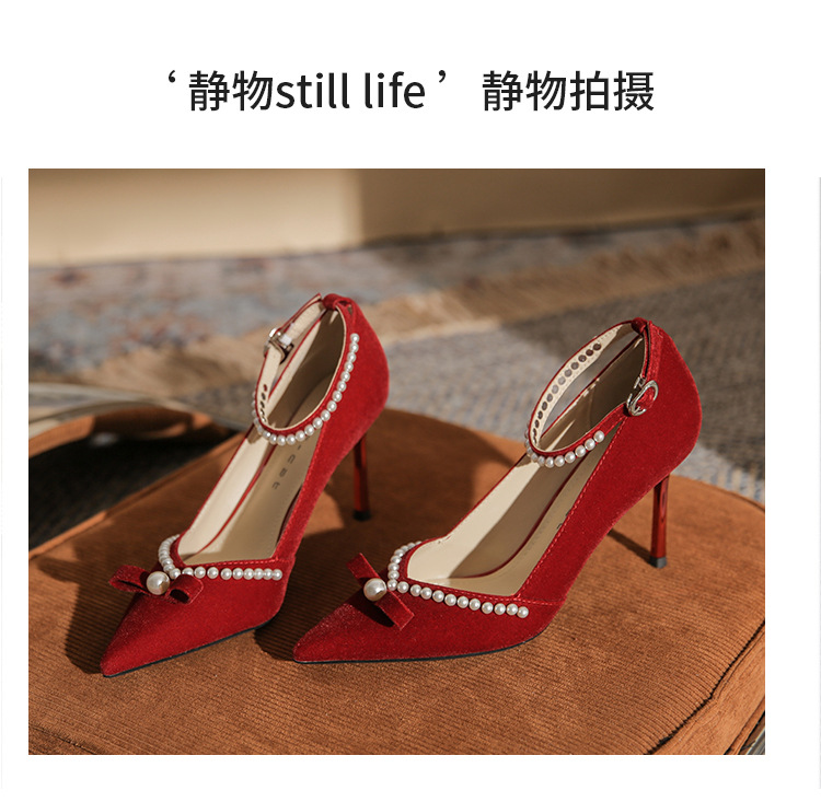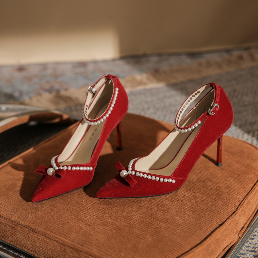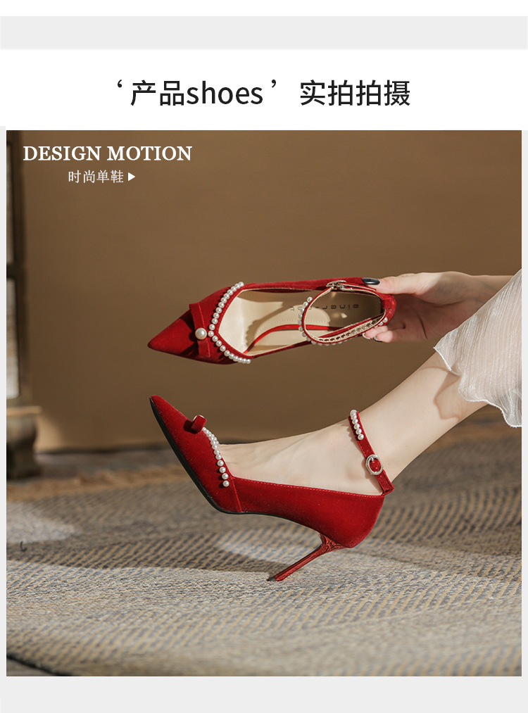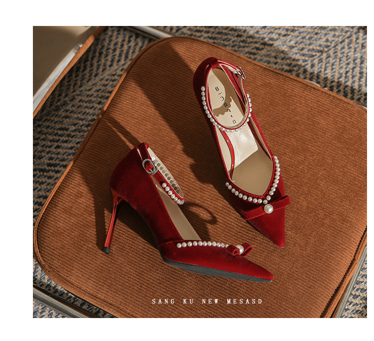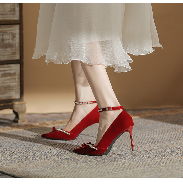 Đôi giày cao gót này có phần gót thanh mảnh và mũi nhọn, tạo dáng thanh lịch. Trên dây đeo ngang cổ chân được điểm xuyết những viên ngọc tr nhỏ, thêm phần nữ tính. Kiểu dáng phù hợp cho các dịp quan trọng như lễ cưới, tiệc. Sản phẩm có qu dạng dây đeo chữ T ôm sát chân, giúp bạn di chuyển thoải mái và tự tin hơn. | Tên sản phẩm: Giày Cao Gót Nữ Mũi Nhọn Gót Nhọn Dùng Trong Lễ Cưới - Giày Dép Nữ | Mã sản phẩm: A1284 - Giá: 830.000đ | Mã nhà sản xuất: HUDS-G03Hình ảnh sản phẩm