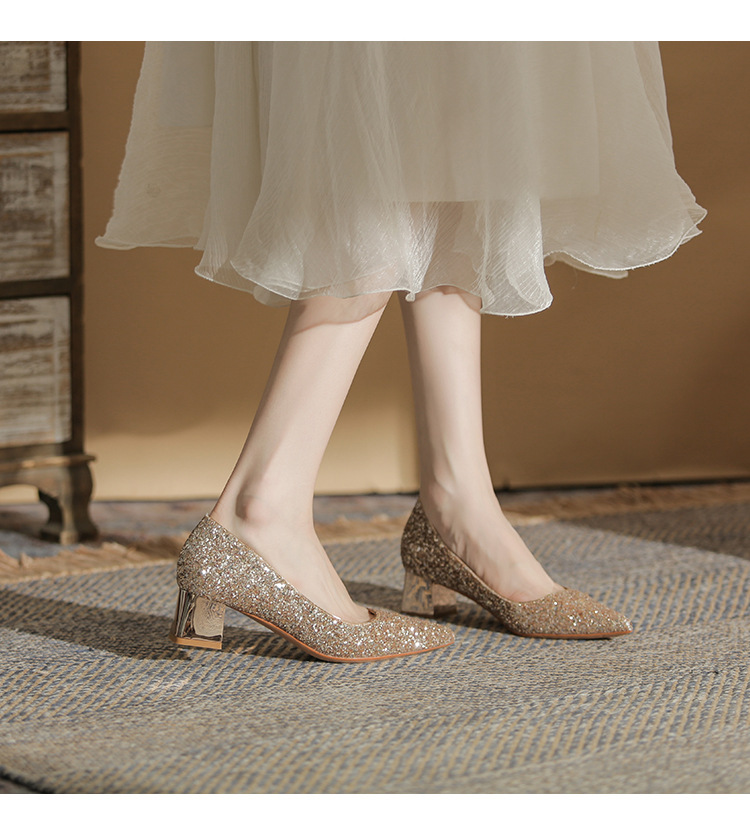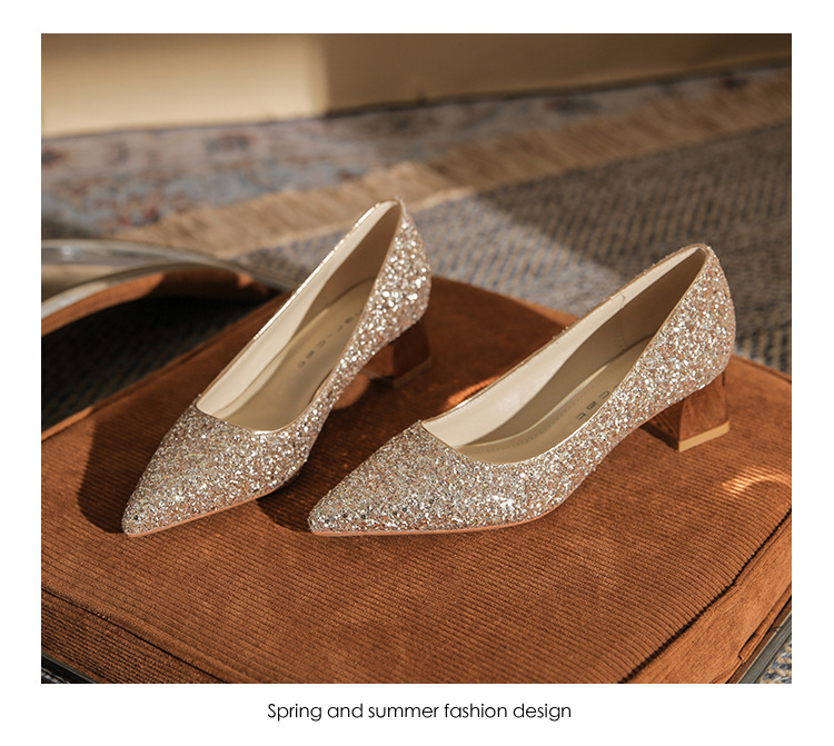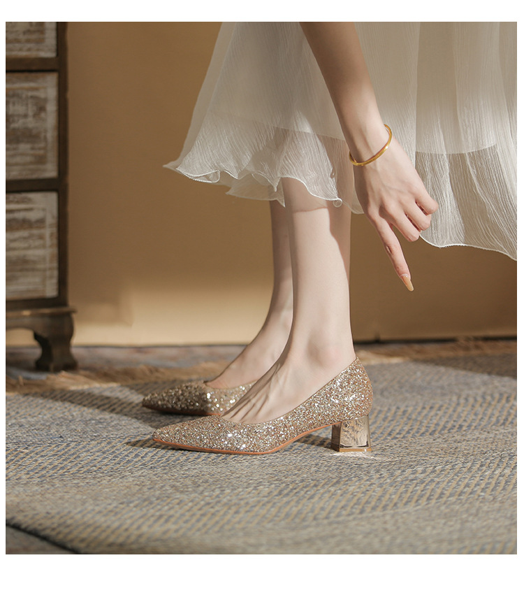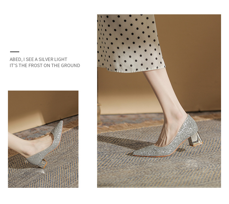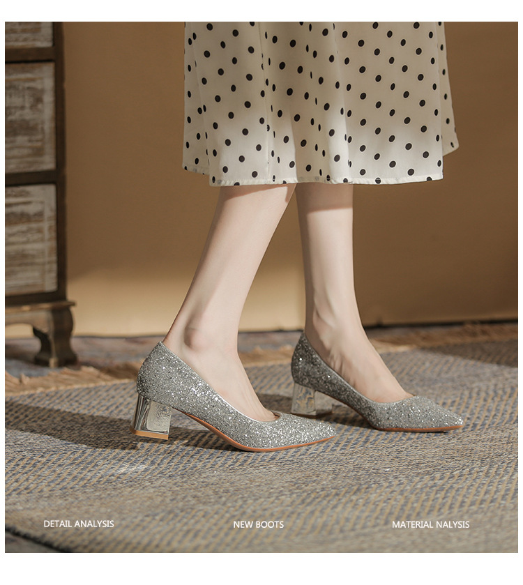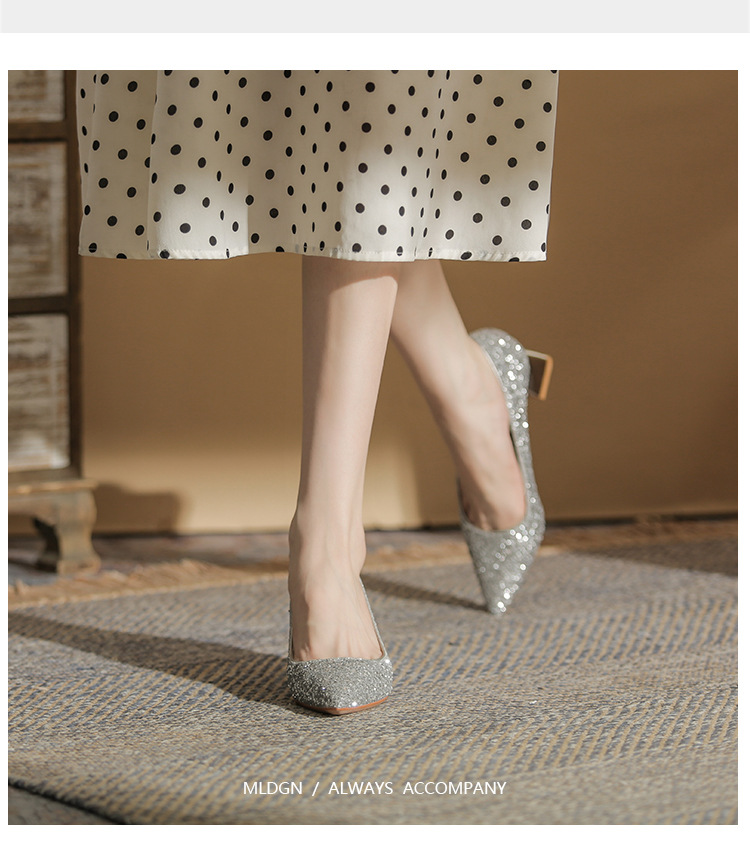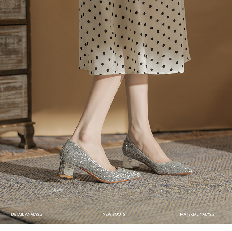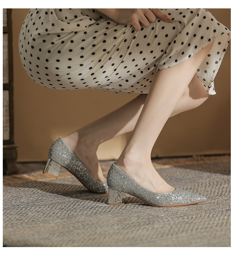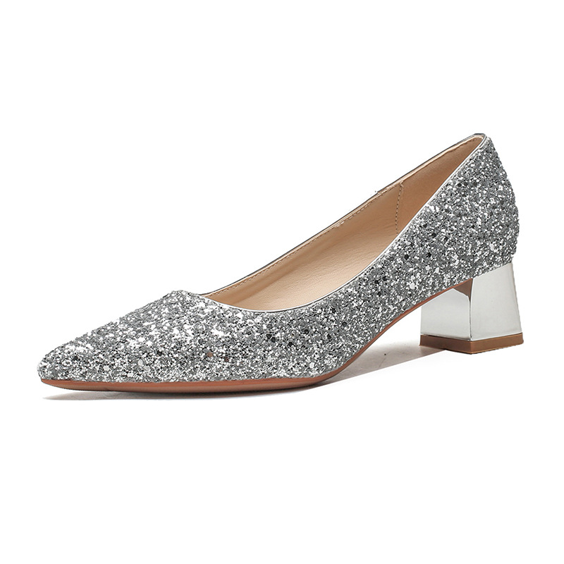 Đôi giày nữ với phần gót thấp vững chãi, kiểu dáng cổ điển dễ phối đồ. Mũi giày nhọn thanh lịch, ôm vừa vặn bàn chân. Chất liệu phủ ánh bạc lấp lánh điểm xuyến những chi tiết trong suốt như pha lê. Thiết kế cổ thấp thoải mái, phù hợp cho nhiều dịp như dự tiệc hay trong ngày trọng đại. Chỉ cần mang vào là bạn đã có ngay vẻ ngoài chỉn chu và nữ tính. | Tên sản phẩm: Giày Cao Gót Nữ Mũi Nhọn Gót Vuông Dùng Trong Lễ Cưới - Giày Dép Nữ | Mã sản phẩm: A1193 - Giá: 780.000đ | Mã nhà sản xuất: HUDS-G02Hình ảnh sản phẩm