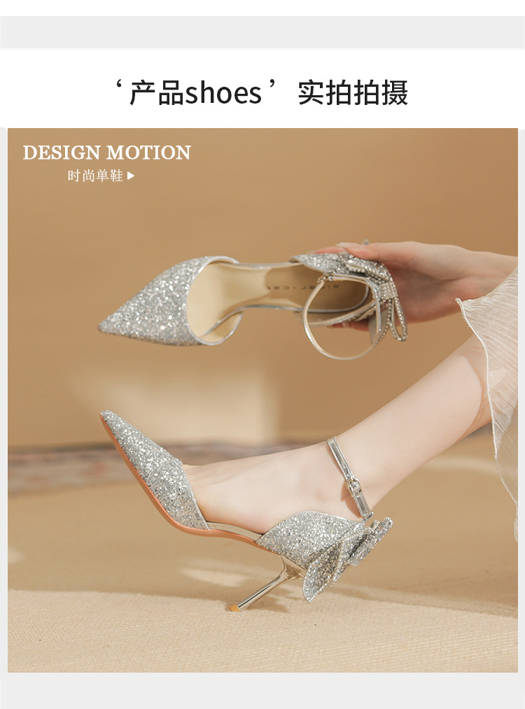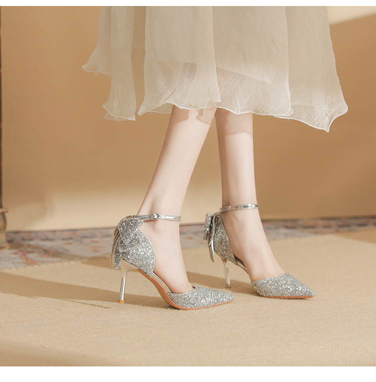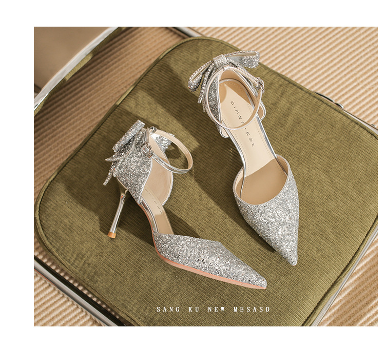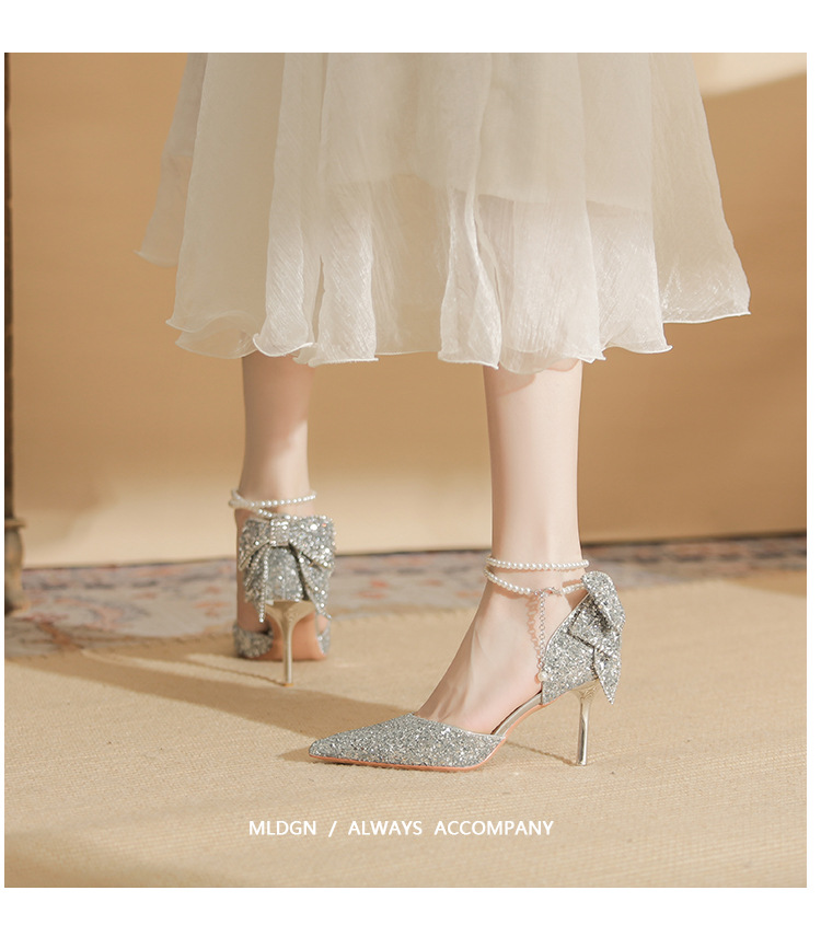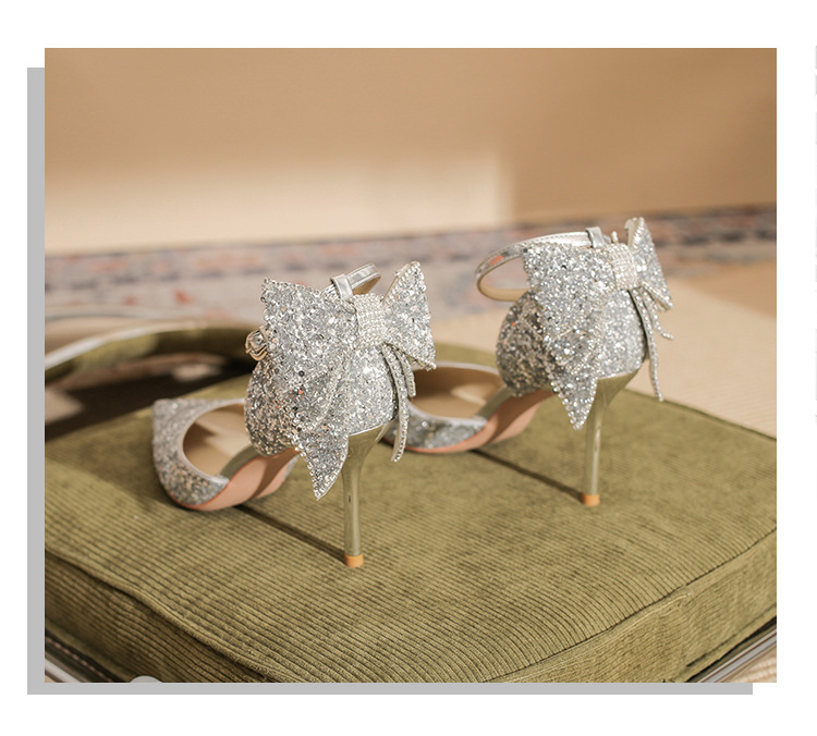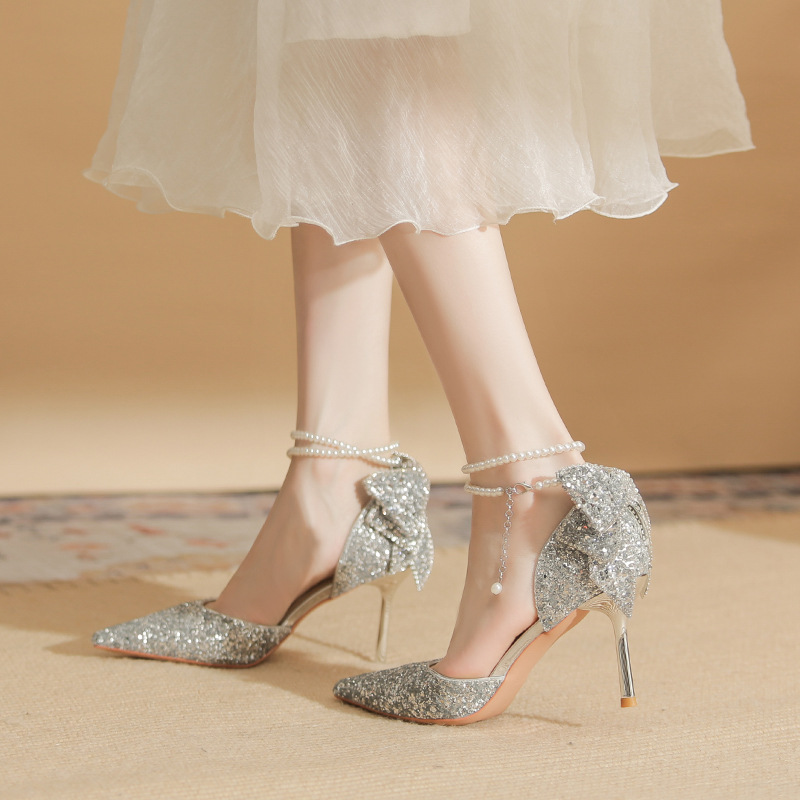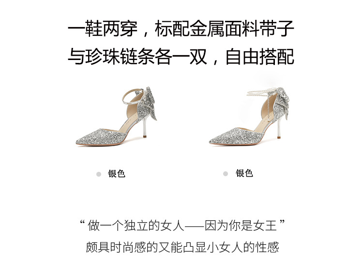 Đôi giày này có phần mũi nhọn và gót thanh mảnh, tạo dáng thanh lịch. Điểm nhấn là nơ kết hợp dây xích lấp lánh, có thể tháo rời để biến đổi thành hai kiểu mang khác nhau. Sản phẩm thích hợp để mang trong các dịp như tiệc cưới hay sự kiện. Bạn chỉ cần chọn cỡ giày phù hợp và kết hợp với trang phục để có vẻ ngoài ưng ý. | Tên sản phẩm: Giày Cao Gót Nữ Thắt Nơ Bướm Gắn Đá Mũi Nhọn Gót Nhọn Dùng Trong Lễ Cưới - Giày Dép Nữ | Mã sản phẩm: A1122 - Giá: 940.000đ | Mã nhà sản xuất: HUDS-G03Hình ảnh sản phẩm