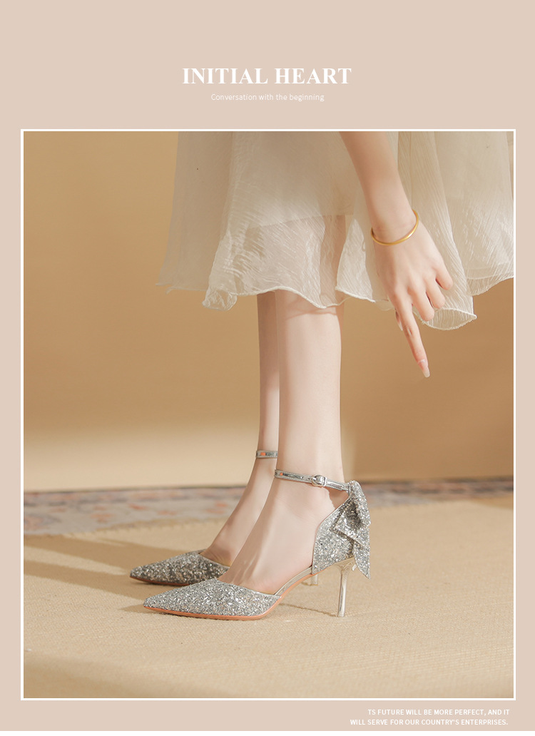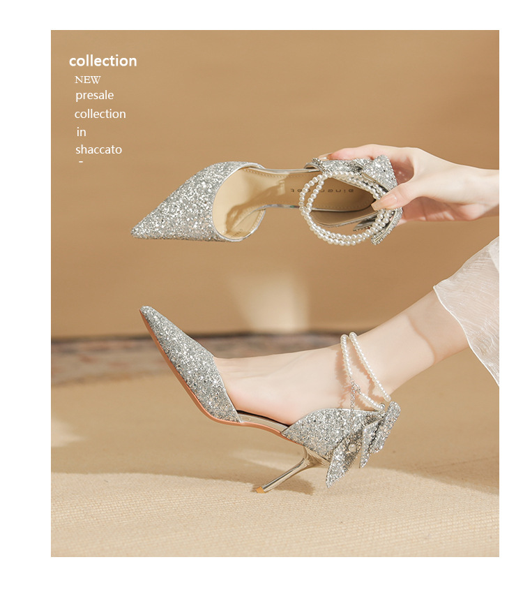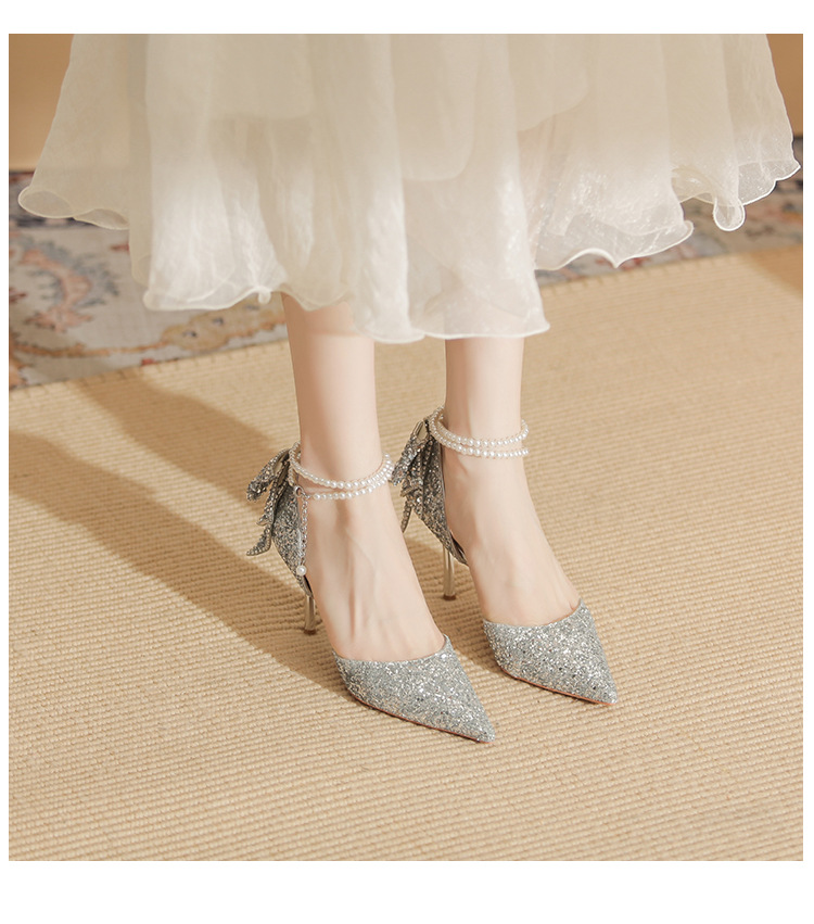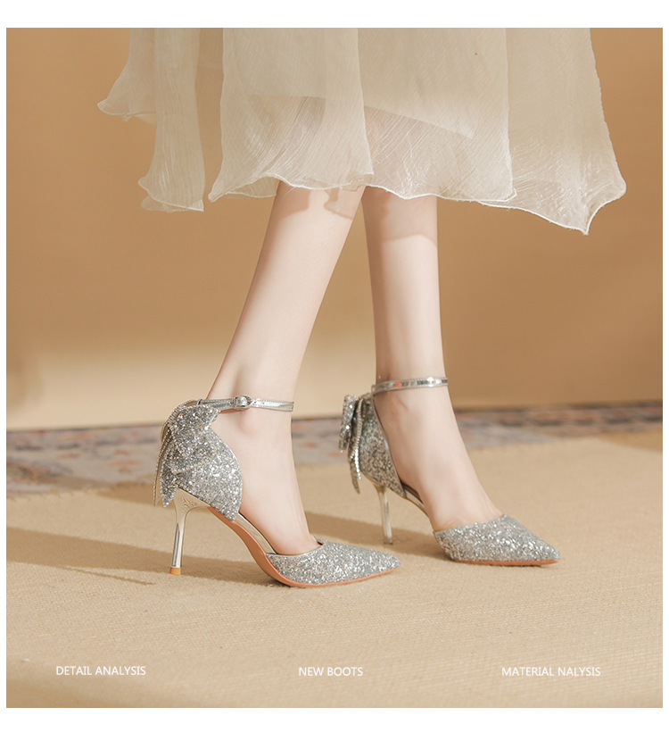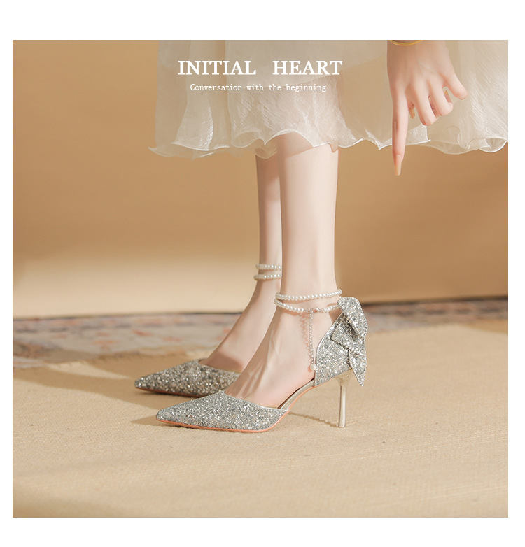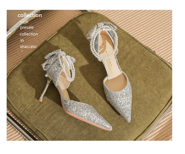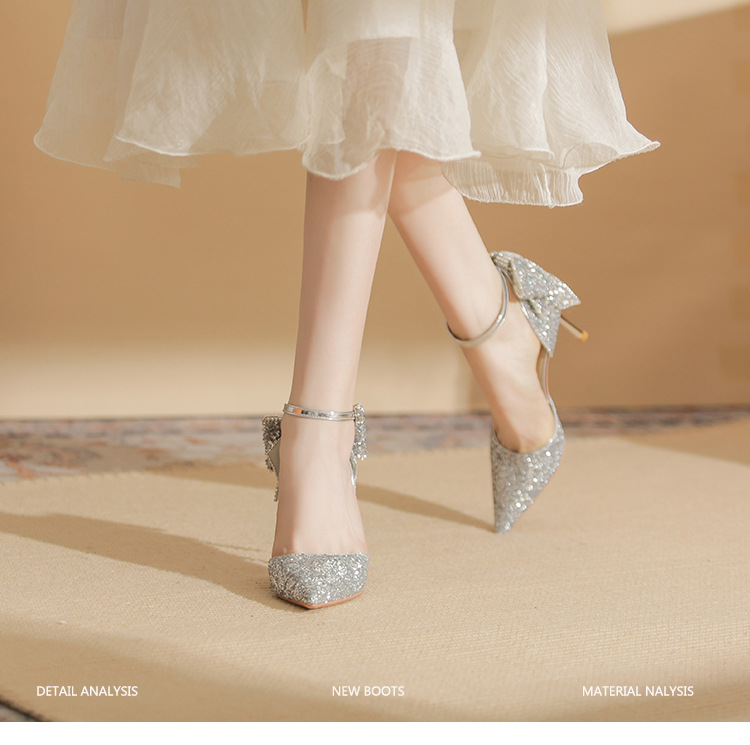 Đôi giày này có phần mũi nhọn và gót thanh mảnh, tạo dáng thanh lịch. Điểm nhấn là nơ kết hợp dây xích lấp lánh, có thể tháo rời để biến đổi thành hai kiểu mang khác nhau. Sản phẩm thích hợp để mang trong các dịp như tiệc cưới hay sự kiện. Bạn chỉ cần chọn cỡ giày phù hợp và kết hợp với trang phục để có vẻ ngoài ưng ý. | Tên sản phẩm: Giày Cao Gót Nữ Thắt Nơ Bướm Gắn Đá Mũi Nhọn Gót Nhọn Dùng Trong Lễ Cưới - Giày Dép Nữ | Mã sản phẩm: A1122 - Giá: 940.000đ | Mã nhà sản xuất: HUDS-G03Hình ảnh sản phẩm