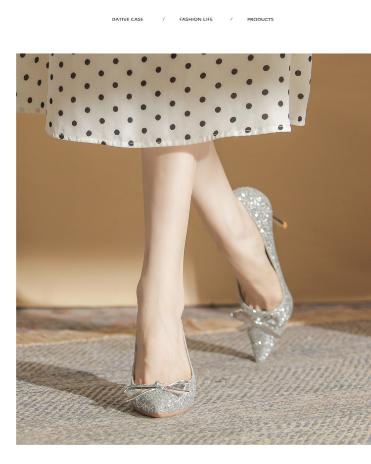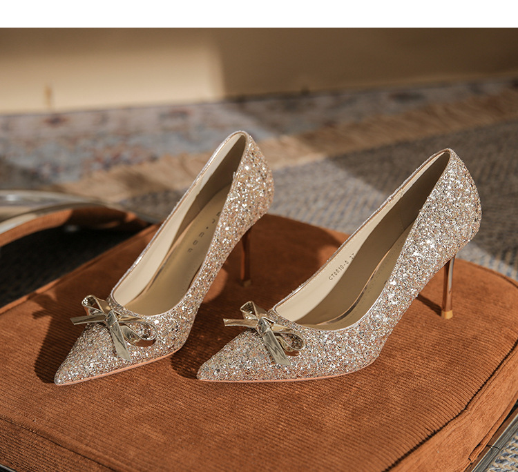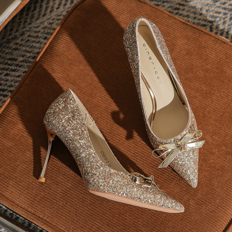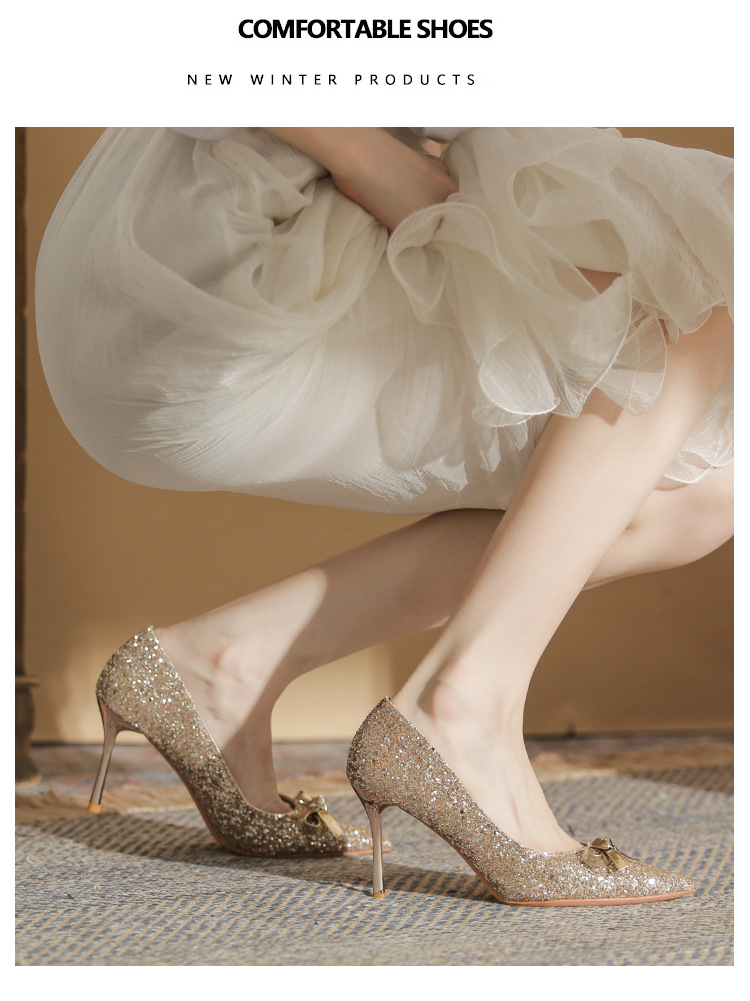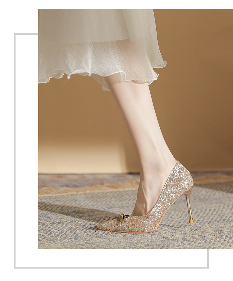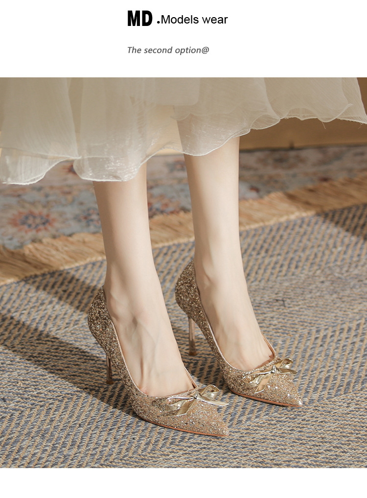 Đôi giày này có phần gót thon và mũi nhọn, tạo dáng thanh thoát. Kiểu dáng cổ thấp phù hợp cho các dịp như cô dâu trong ngày cưới. Trên thân giày được điểm xuyết những chi tiết óng ánh và nơ nhỏ xinh, thêm phần nổi bật. Sản phẩm dễ dàng phối cùng nhiều trang phục khác nhau. Bạn chỉ cần xỏ chân vào và cài nơ hoặc khóa cho vừa vặn là có thể sử dụng ngay. | Tên sản phẩm: Giày Cao Gót Nữ Thắt Nơ Bướm Mũi Nhọn Gót Nhọn Dùng Trong Lễ Cưới - Giày Dép Nữ | Mã sản phẩm: A1380 - Giá: 800.000đ | Mã nhà sản xuất: HUDS-G02Hình ảnh sản phẩm