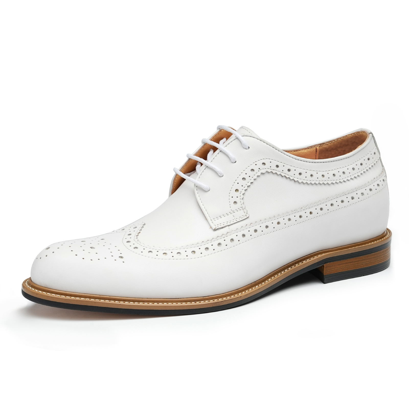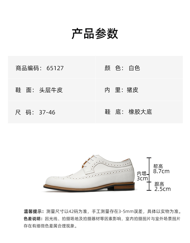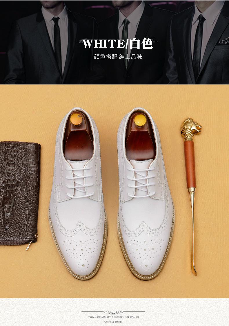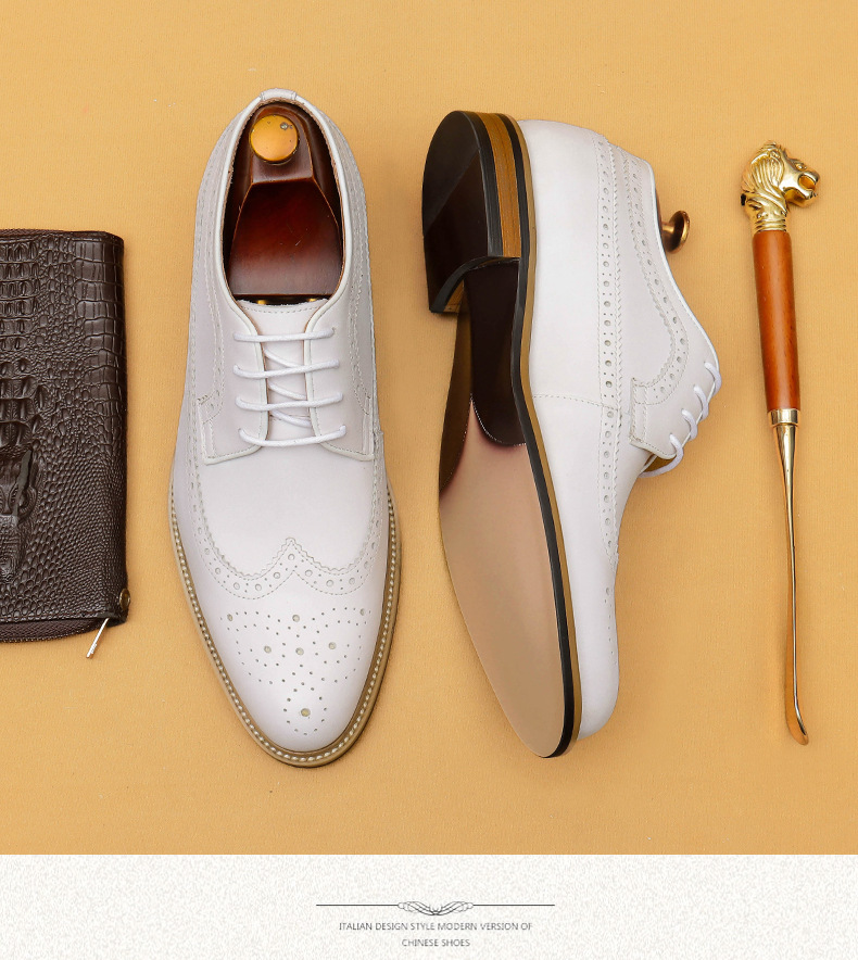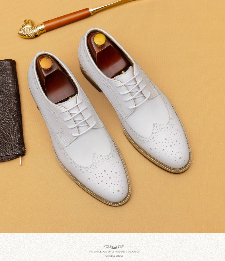 Đôi giày da thật màu trắng dành cho nam, thiết kế kiểu dáng công sở lịch sự phù hợp khi làm việc hoặc trong những sự kiện quan trọng. Bên trong giày có đế nâng đệm một cách tinh tế, giúp tăng chiều cao một cách tự nhiên mà không để lộ ra ngoài. Kiểu dáng Brogue với các đường cắt trang trí tinh xảo, tạo điểm nhấn thanh lịch. Sử dụng dễ dàng, chỉ cần xỏ vào và điều chỉnh dây hoặc khóa cho vừa chân. | Tên sản phẩm: Giày Da Nam Chất Liệu Da Bò Tăng Chiều Cao Dùng Trong Lễ Cưới Ngày Cưới - Giày Dép Nam | Mã sản phẩm: B1519 - Giá: 2.360.000đ | Mã nhà sản xuất: SHERAW-G05Hình ảnh sản phẩm