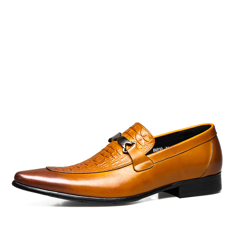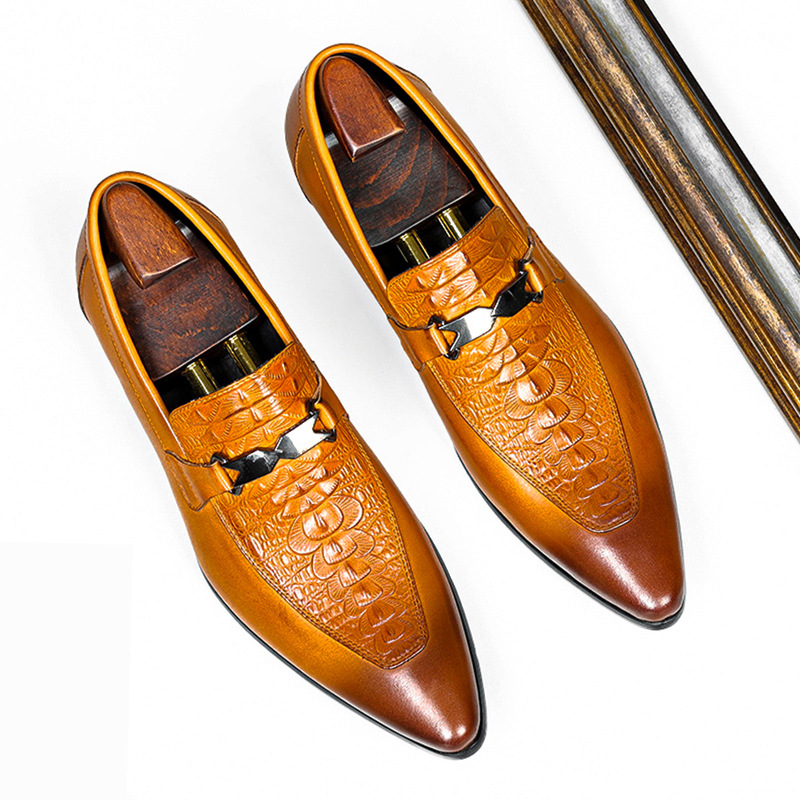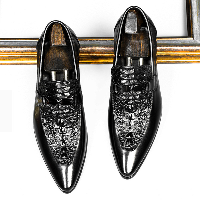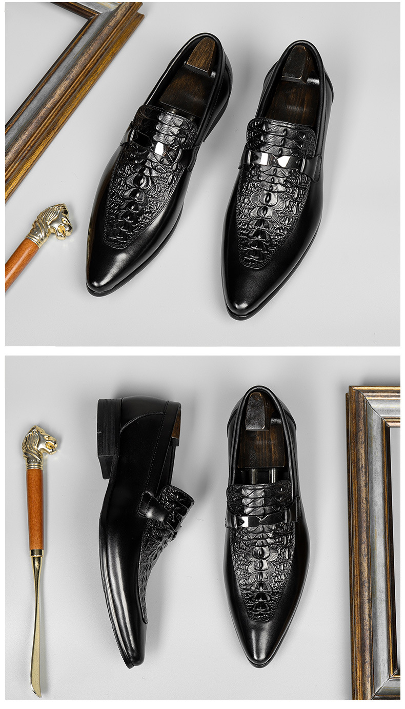 Giày da nam kiểu dáng mũi nhọn, trên mặt giày có họa tiết da cá sấu được dập nổi tinh tế, tạo điểm nhấn khác biệt. Chất liệu có những lỗ nhỏ li ti giúp đôi chân luôn khô ráo và dễ chịu. Kiểu dáng phù hợp cho các dịp làm việc, gặp đối tác hoặc dạo phố. Dễ dàng phối cùng quần âu, áo sơ mi để có diện mạo chỉn chu. Sử dụng hàng ngày và vệ sinh bằng khăn mềm. | Tên sản phẩm: Giày Da Nam Vân Da Cá Sấu Mũi Nhọn Họa Tiết Hoa Thoáng Khí Phong Cách Hàn Quốc - Giày Dép Nam | Mã sản phẩm: H3655 - Giá: 2.660.000đ | Mã nhà sản xuất: SHDI-G06Hình ảnh sản phẩm