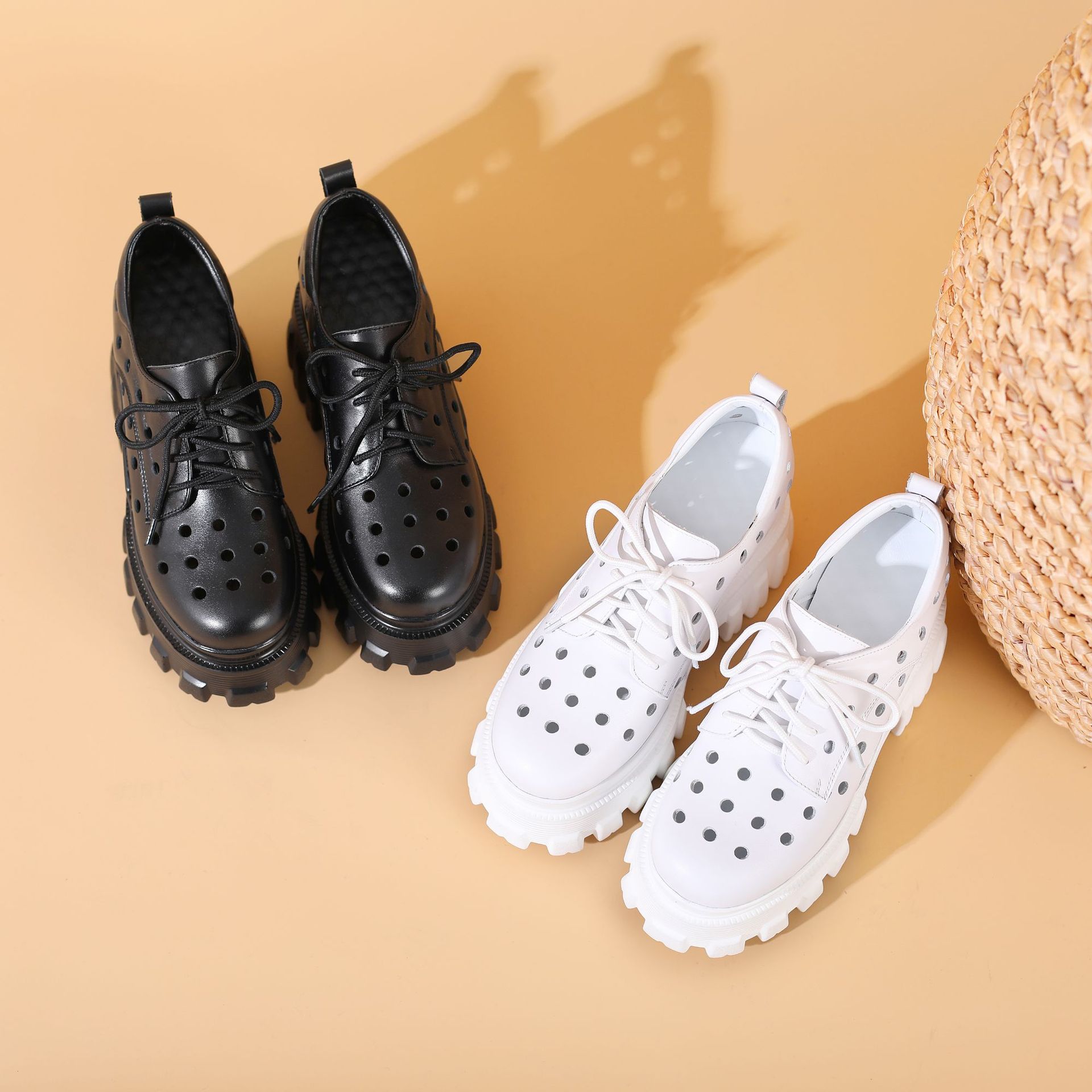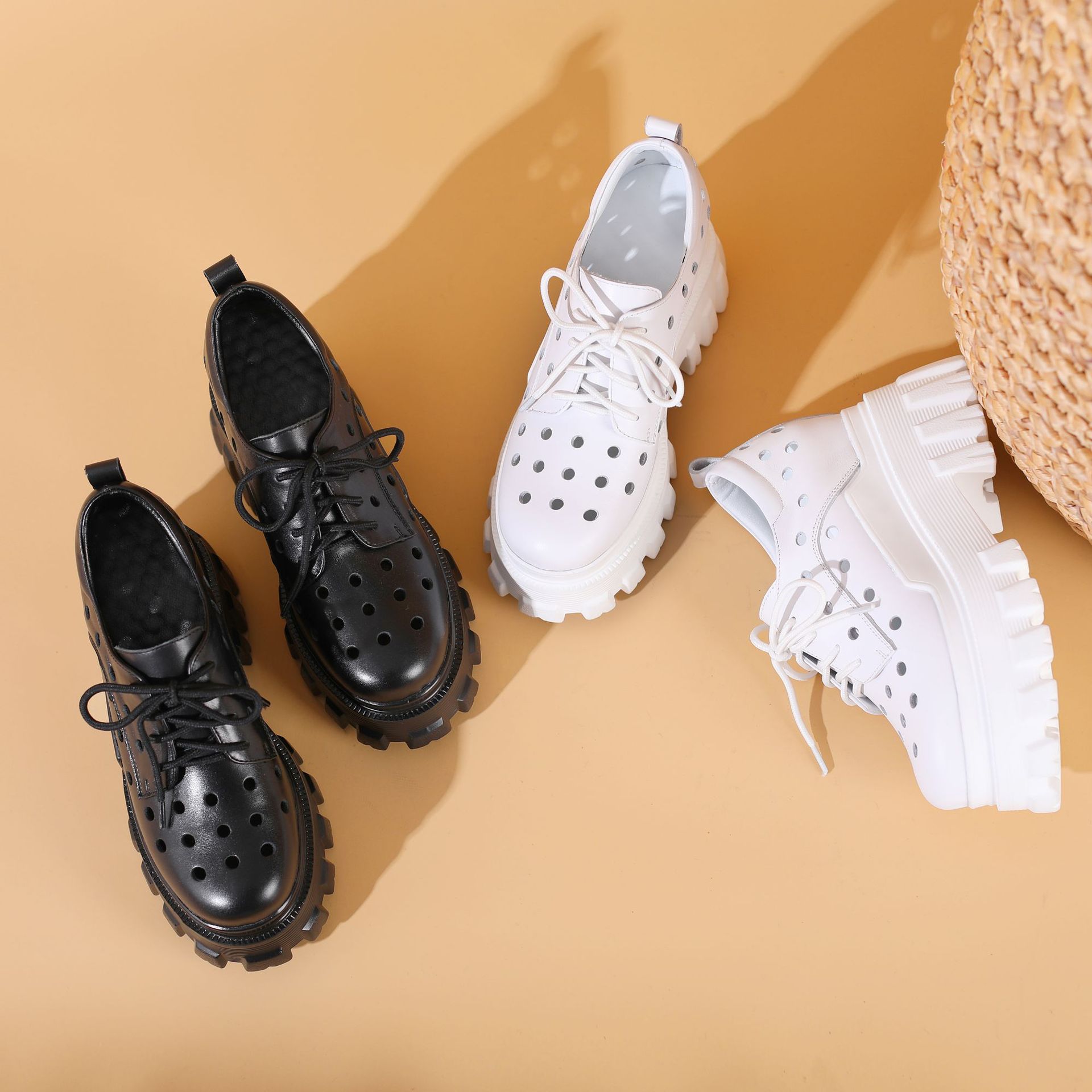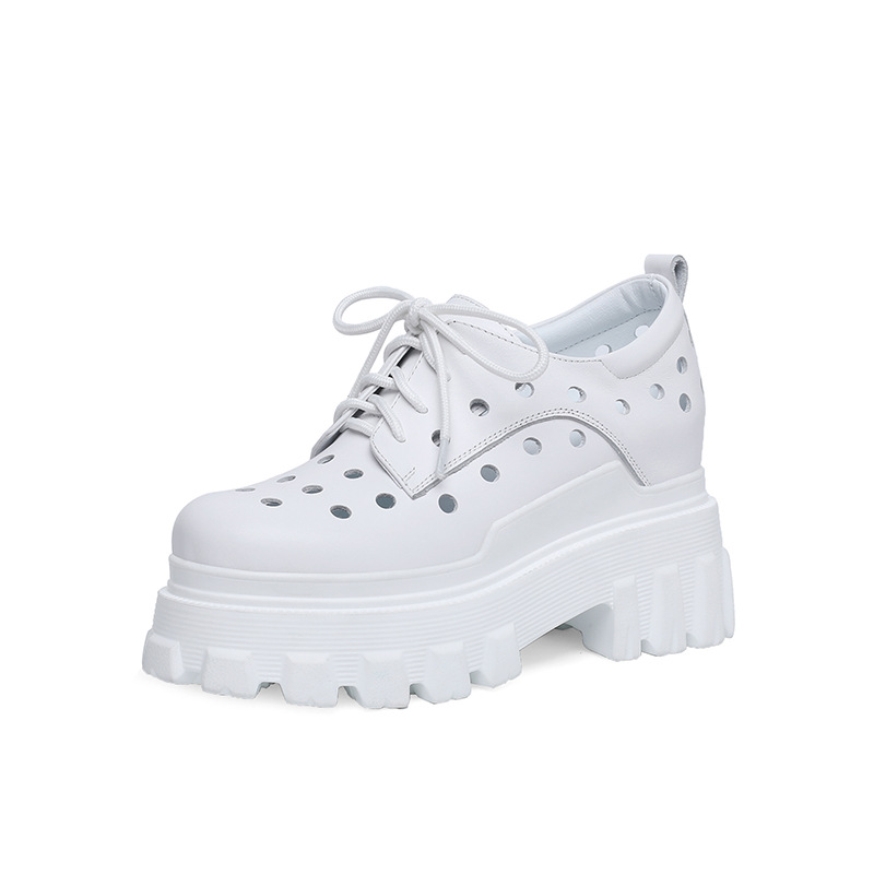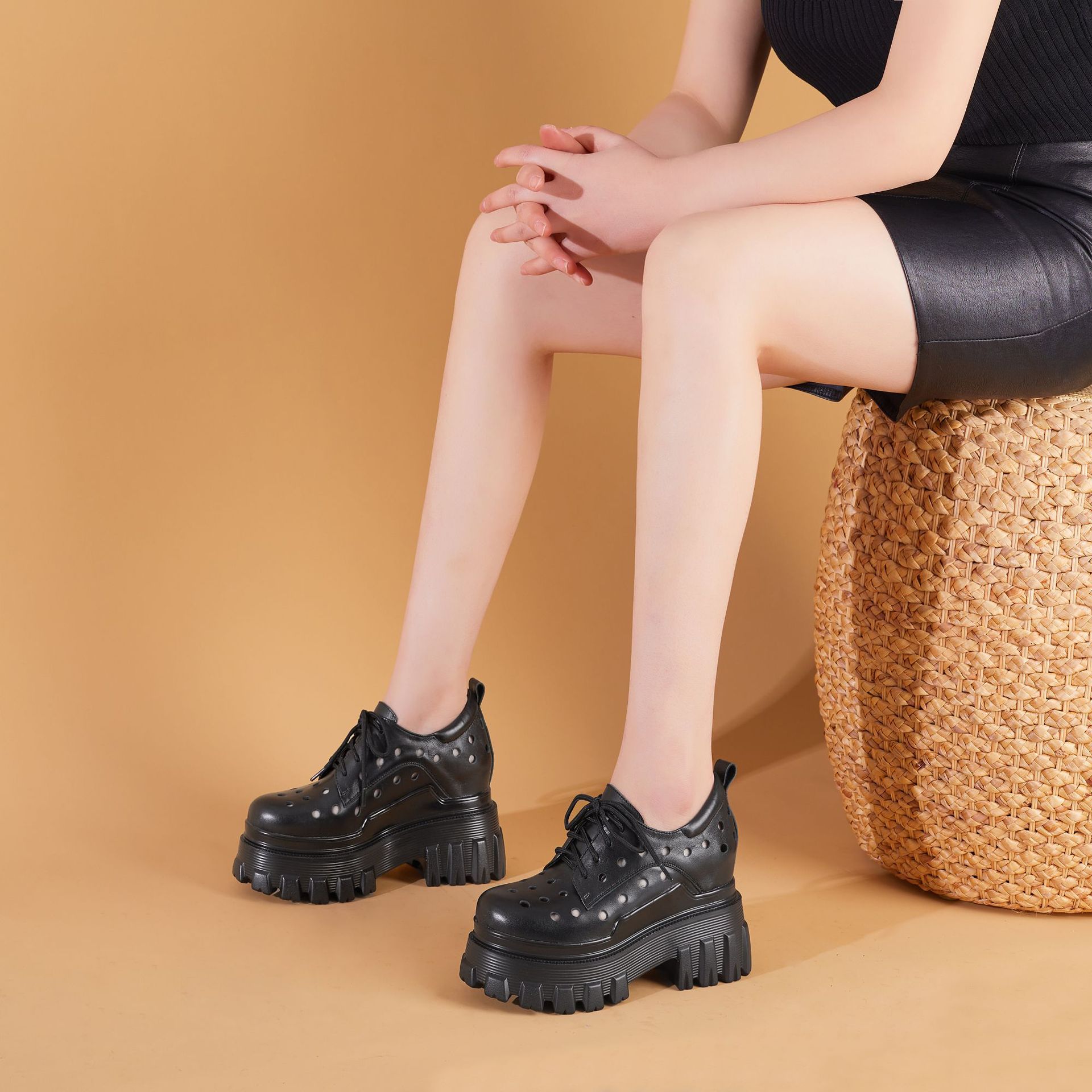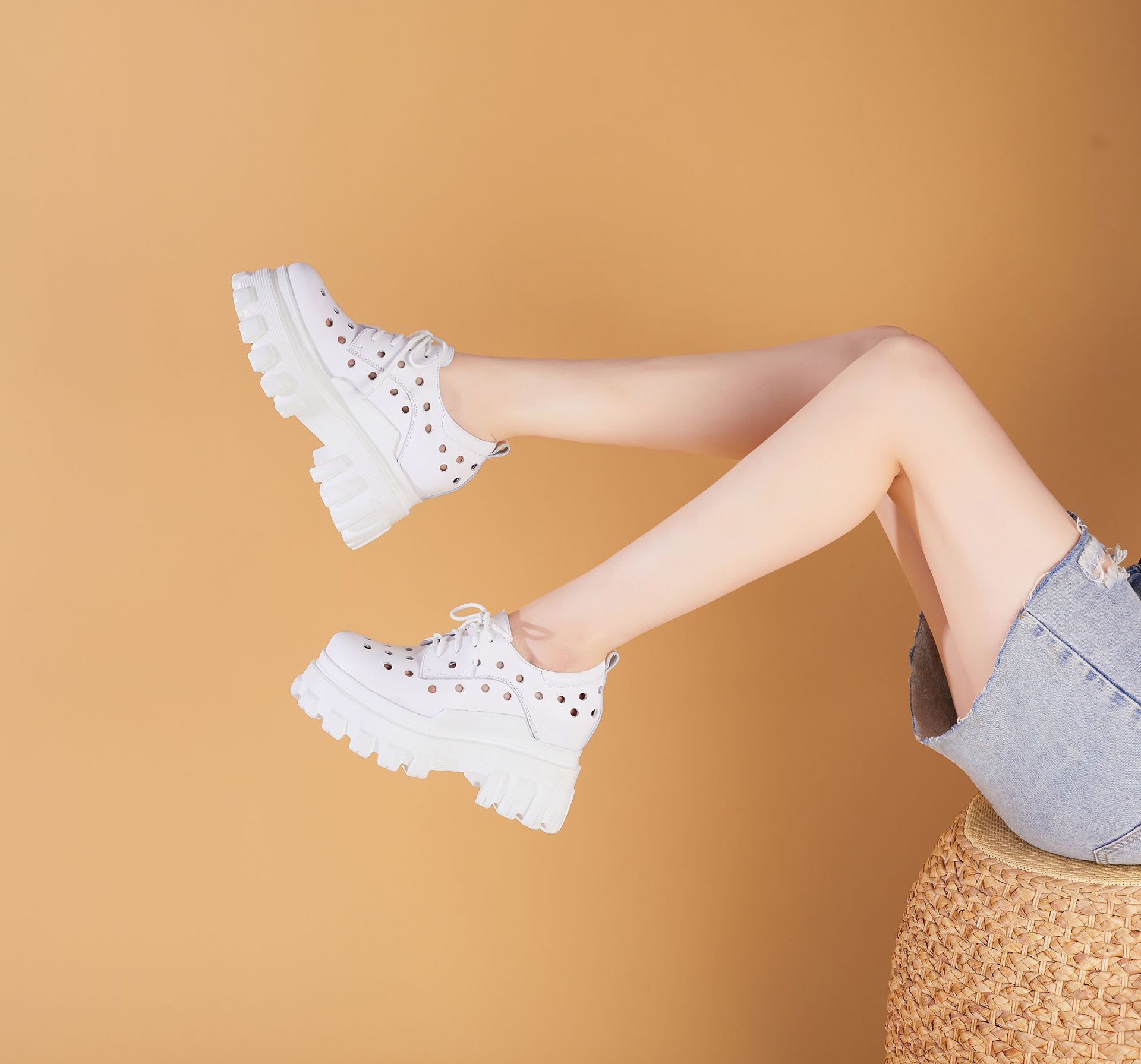 Đôi giày da này mang phong cách cổ điển châu Âu, phù hợp cho mùa xuân. Thiết kế có phần đế dày vừa phải giúp tăng chiều cao một cách nhẹ nhàng. Trên mặt giày có các chi tiết khoét họa tiết, tạo sự thông thoáng khi mang. Đây là mẫu giày bắt mắt, dễ dàng phối cùng nhiều loại trang phục như quần âu, chân váy hay quần jeans để tạo điểm nhấn. Bạn có thể sử dụng hằng ngày cho những dịp đi làm, đi chơi hoặc gặp mặt. | Tên sản phẩm: Giày Da Nữ Cao 10cm Tăng Chiều Cao Thoáng Khí Đế Cao Hàng Mùa Xuân Thu Đông - Giày Dép Nữ | Mã sản phẩm: B4391 - Giá: 1.640.000đ | Mã nhà sản xuất: QIDNG-G05Hình ảnh sản phẩm