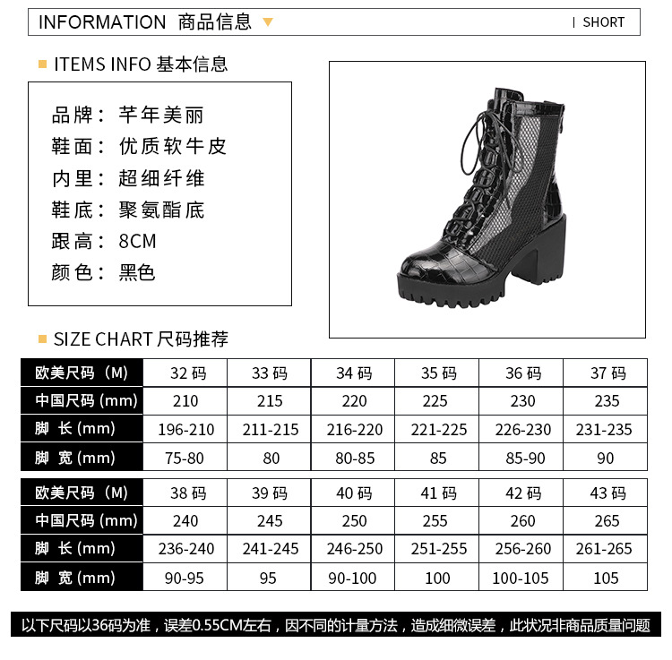 Đôi bốt mùa hè này có phần đế được làm từ chất liệu thoáng mát kết hợp da thật, tạo nên sự mềm mại và bền bỉ. Kiểu dáng bốt cổ điền với mũi tròn, đế hộp vừa phải và qu cài dây giúp ôm chân thoải mái. Sản phẩm có khả năng chống nước nhẹ ở phần đế, phù hợp để diện trong nhiều dịp. Bạn chỉ cần thắt dây và điều chỉnh độ vừa vặn là đã sẵn sàng để bước đi. | Tên sản phẩm: Cao Gót Nữ Chất Liệu Da Bò Big Size Ngoại Cỡ Mũi Tròn Gót Vuông Hàng Mùa Hè - Giày Dép Nữ | Mã sản phẩm: A0520 - Giá: 1.070.000đ | Mã nhà sản xuất: WUDTI-G03Hình ảnh sản phẩm