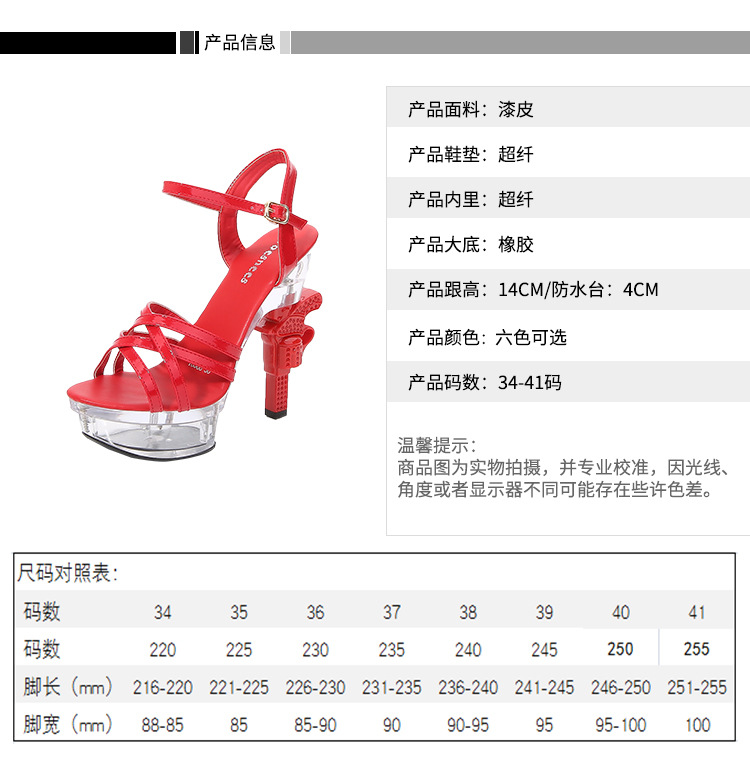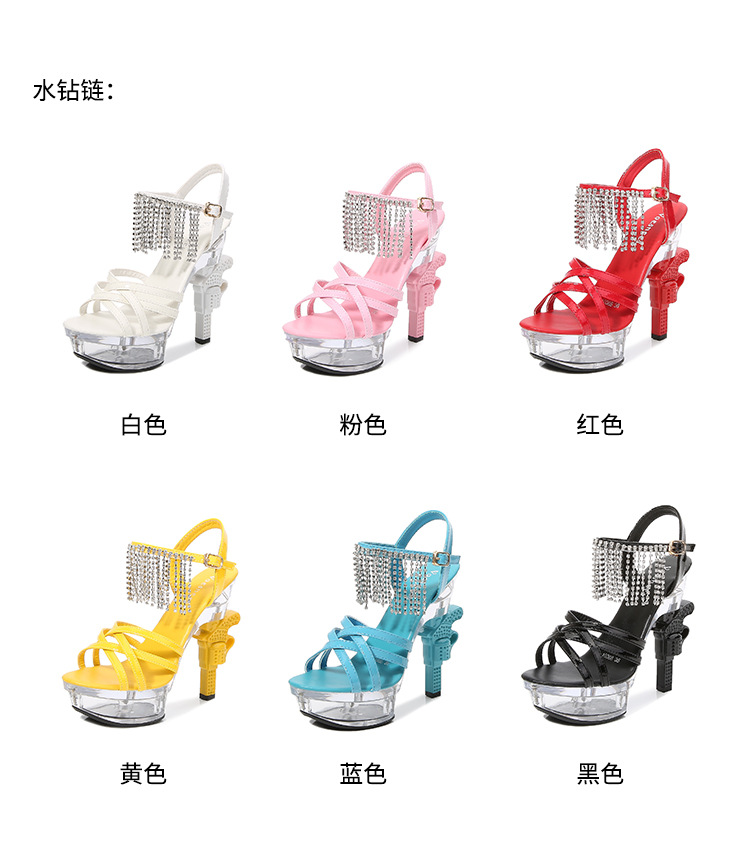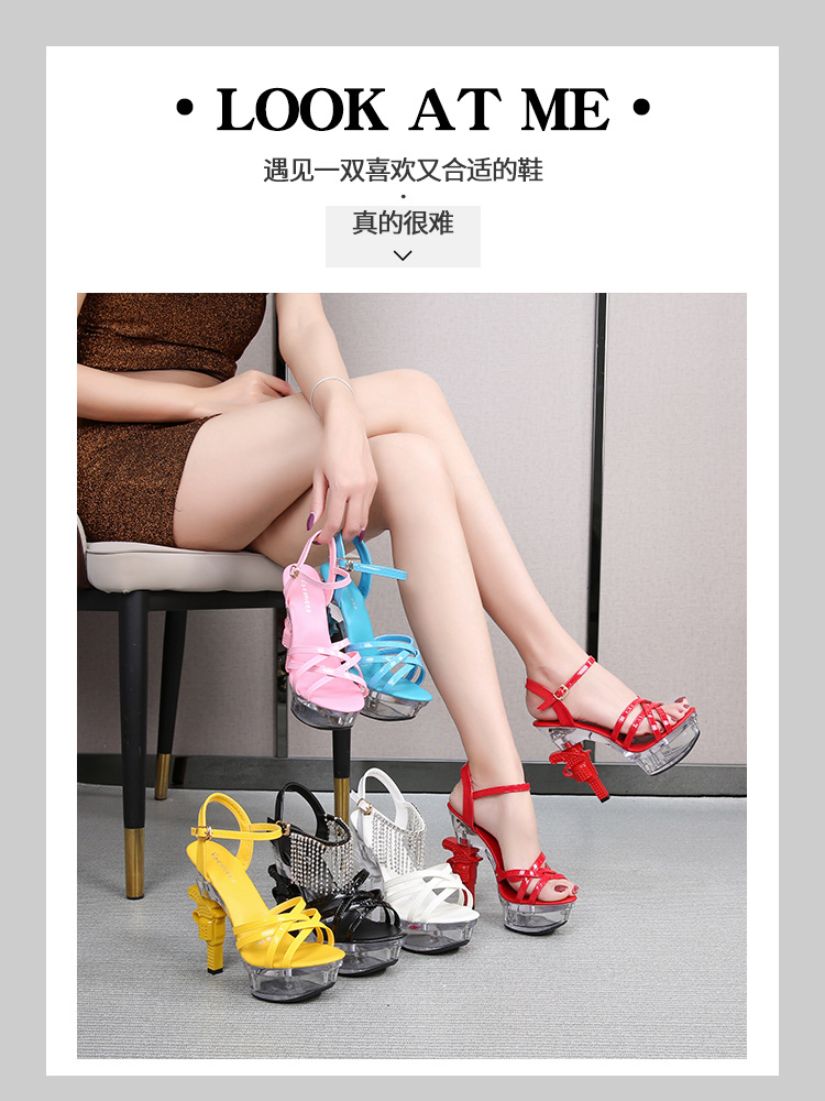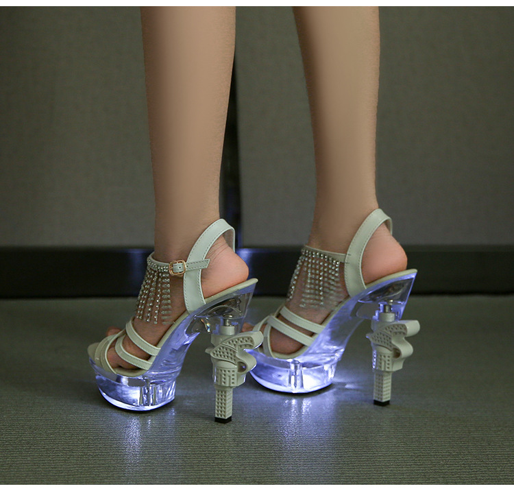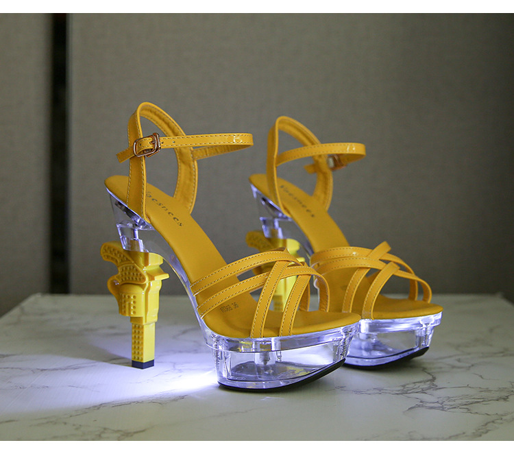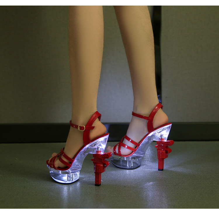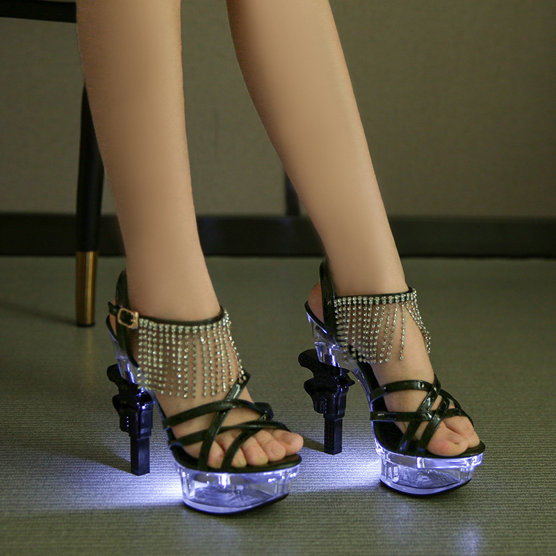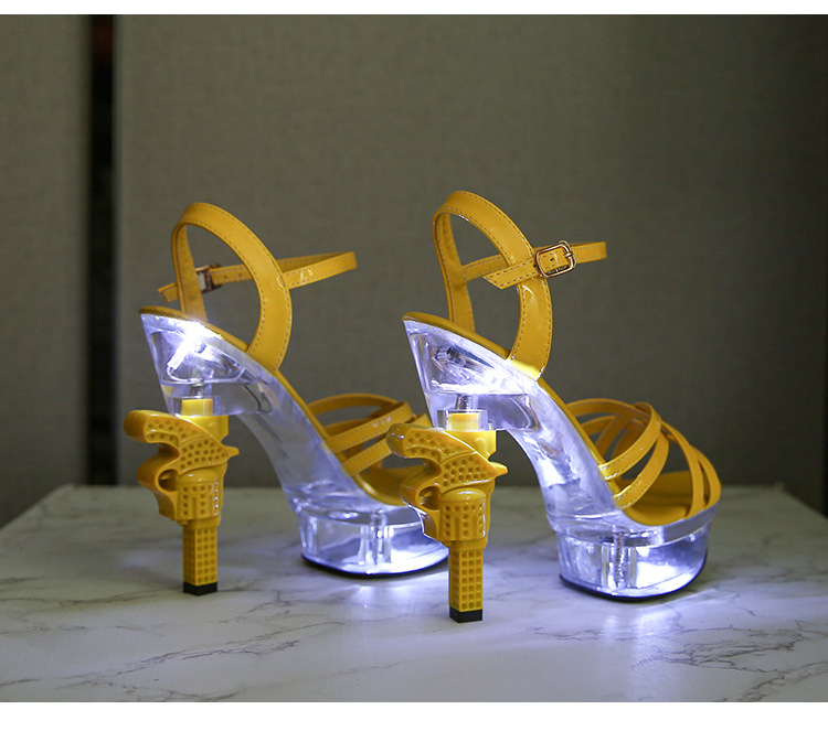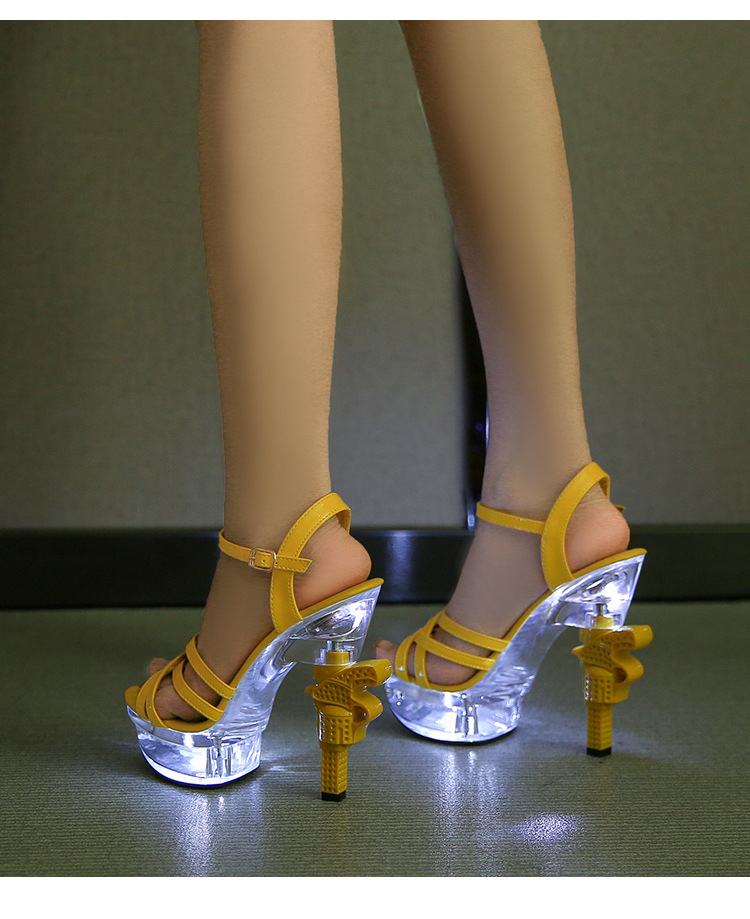 Đôi giày cao gót nữ với phần gót được tạo hình độc đáo, phối cùng chất liệu trong suốt lấp lánh tạo điểm nhấn. Kiểu dáng sandal mở mũi, qu hẹp, mang phong cách gợi cảm và dễ dàng kết hợp với nhiều trang phục. Sản phẩm có khả năng phát sáng nhẹ ở phần gót, thích hợp cho nhiều dịp như dự tiệc hoặc trong những sự kiện quan trọng. Chỉ cần xỏ qu và cài khóa là đã sẵn sàng sử dụng. | Tên sản phẩm: Giày Cao Gót Nữ Hàng Mùa Hè Dùng Trong Lễ Cưới - Giày Dép Nữ | Mã sản phẩm: A7692 - Giá: 1.060.000đ | Mã nhà sản xuất: JIENNG-G03Hình ảnh sản phẩm