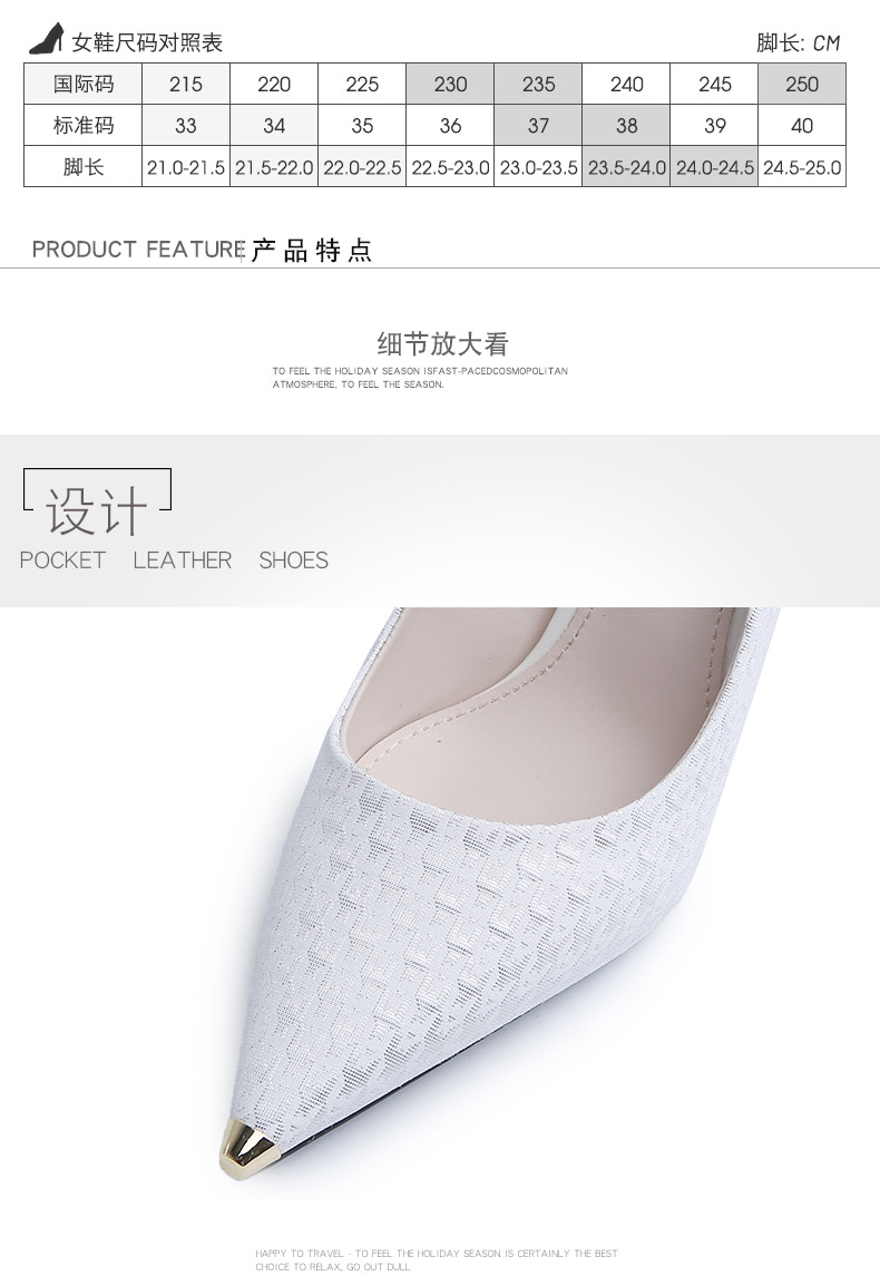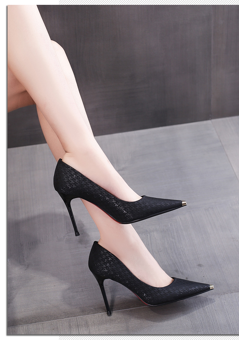Giày cao gót nữ với phần mũi được bọc kim loại sáng bóng, tạo điểm nhấn nổi bật. Kiểu dáng mũi nhọn và gót thanhai mảnh giúp tôn lên vẻ thanh lịch. Mẫu giày này dễ dàng phối cùng nhiều trang phục khác nhau như quần âu, váy công sở hay đồ dạo phố. Bạn có thể mang chúng để đi làm hoặc dự những buổi gặp mặt hằng ngày. | Tên sản phẩm: Giày Cao Gót Nữ Mũi Nhọn Gót Nhọn - Giày Dép Nữ | Mã sản phẩm: B6747 - Giá: 1.070.000đ | Mã nhà sản xuất: ZHDIA-G03Hình ảnh sản phẩm