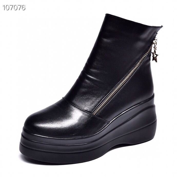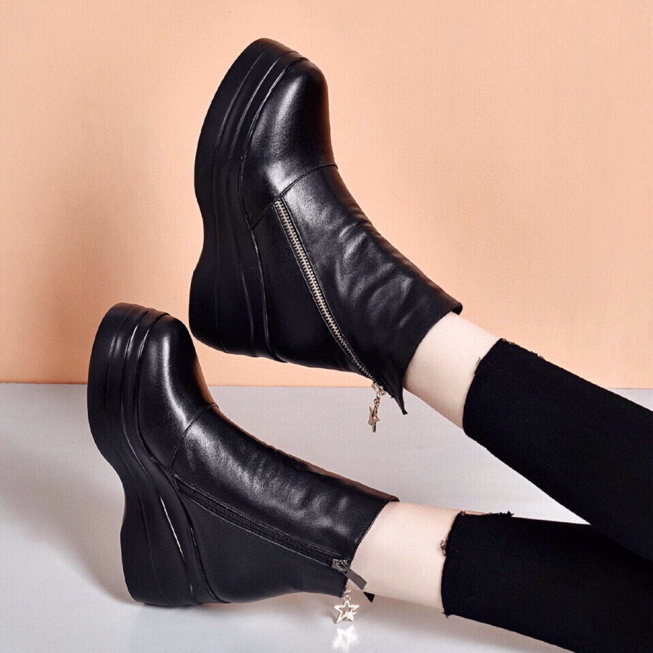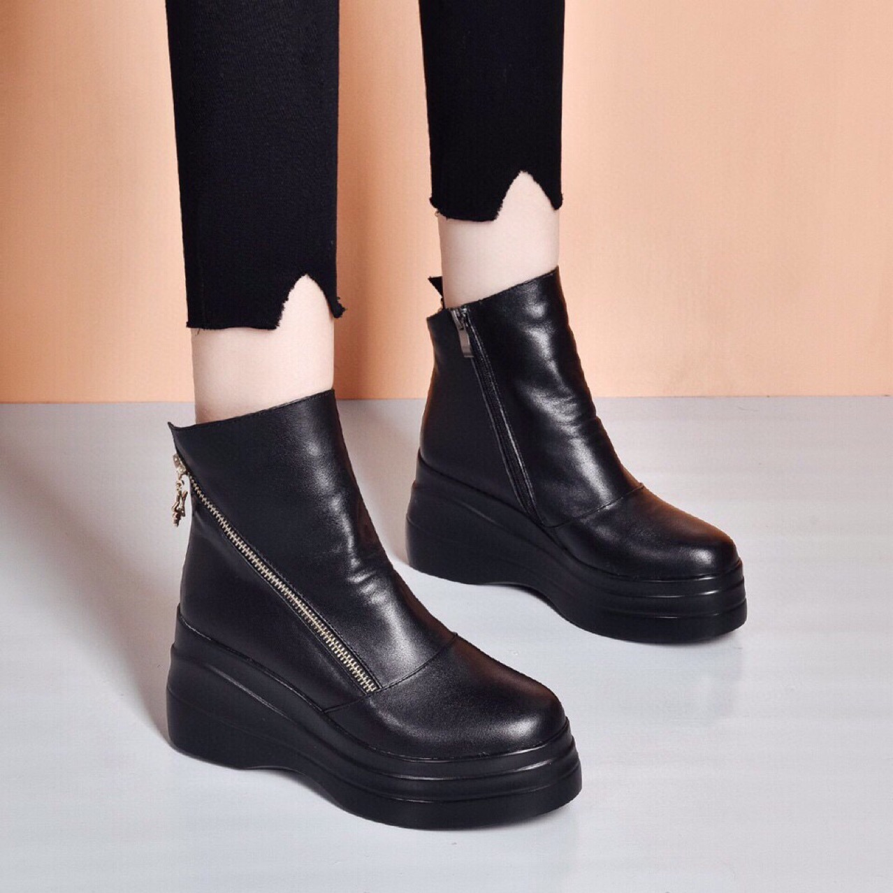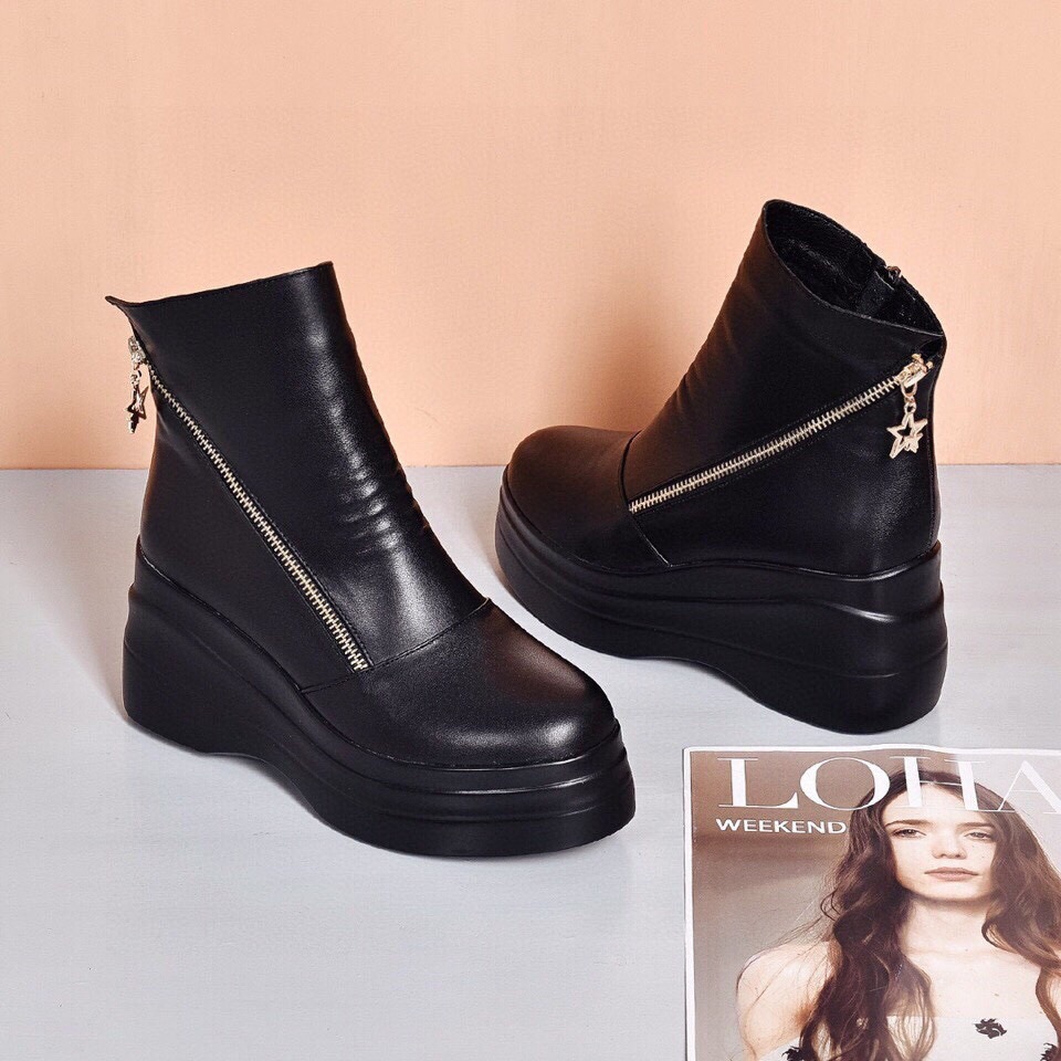 Đôi bốt cổ thấp này có phần đế được thiết kế dày và thoải từ gót xuống mũi, giúp tăng chiều cao một cách nhẹ nhàng. Làm từ chất liệu da mềm mại, kiểu dáng bốt bụi bặm mang đến vẻ ngoài khỏe khoắn. Bạn có thể dễ dàng phối cùng quần jeans hay váy để tạo điểm nhấn thời trang. Sản phẩm thích hợp để mang trong những ngày thời tiết mát mẻ. | Tên sản phẩm: Giày Boot Cổ Thấp Nữ Chất Liệu Da Bò Tăng Chiều Cao Đế Xuồng Đế Cao Hàng Mùa Xuân Thu Đông - Giày Dép Nữ | Mã sản phẩm: D3722 - Giá: 1.570.000đ | Mã nhà sản xuất: TOREHU-G04Hình ảnh sản phẩm