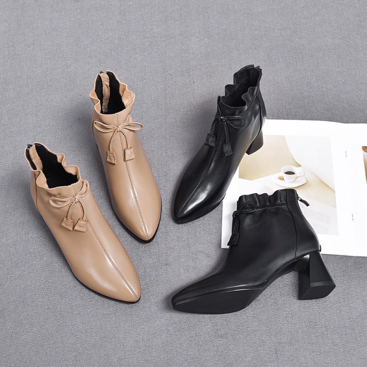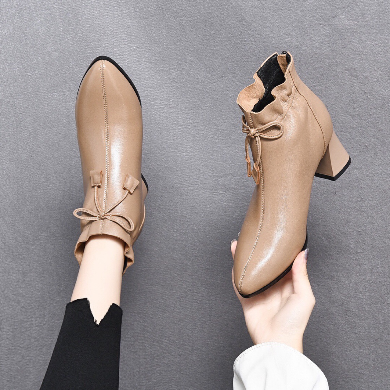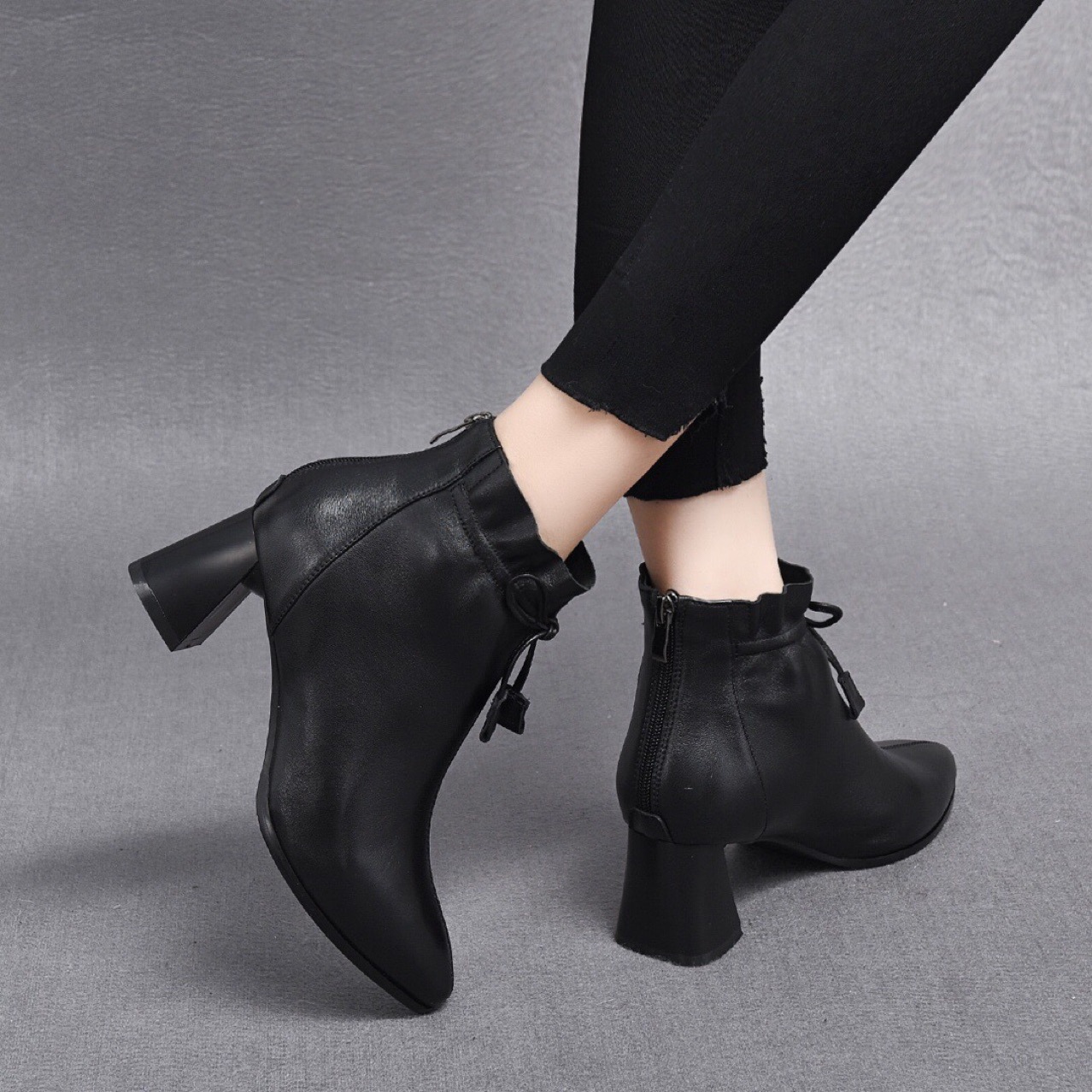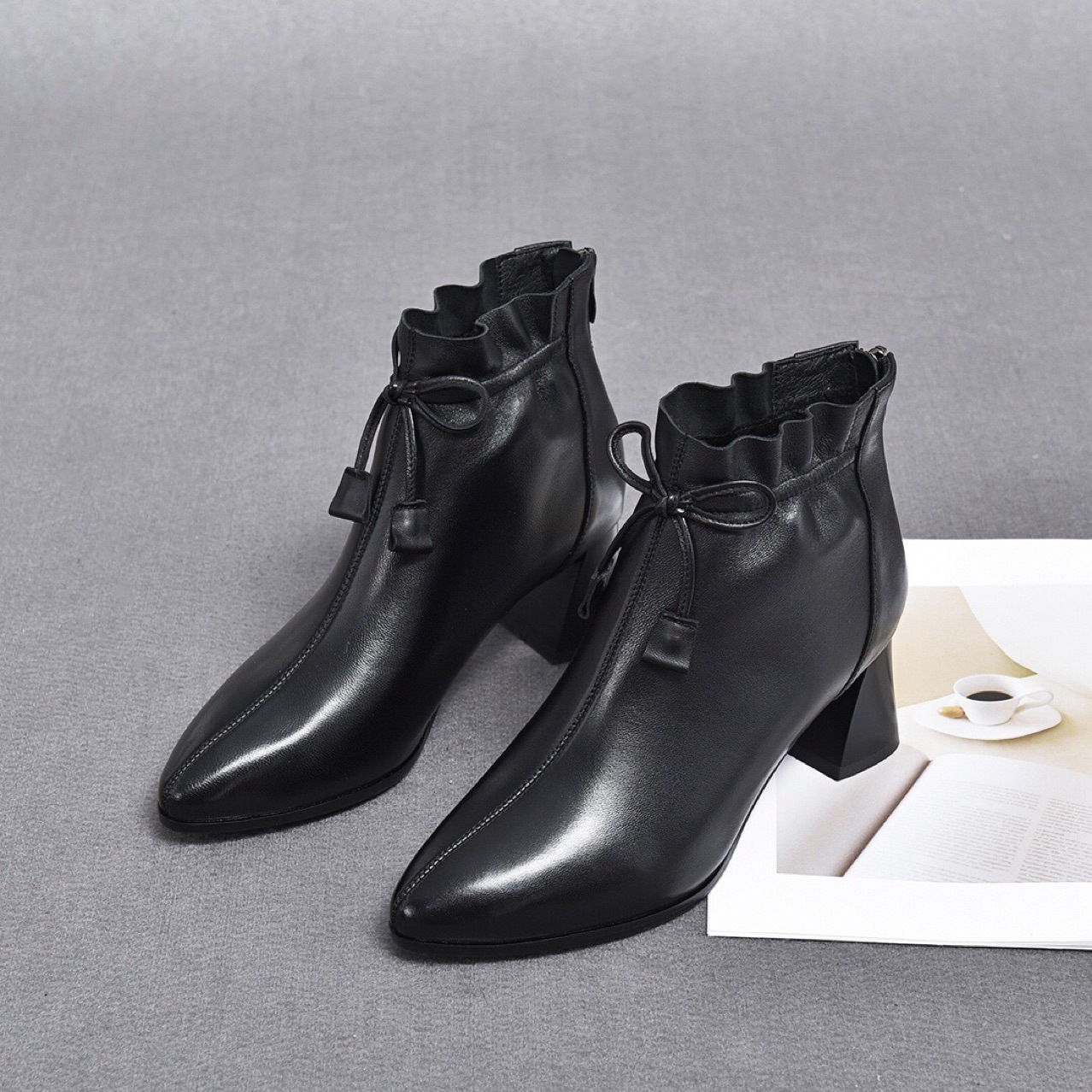 Đôi bốt cổ thấp này có mũi nhọn và phần gót chân to vừa phải, tạo dáng thanh thoát và giúp nâng đỡ bàn chân tốt. Chất da mềm mại ôm sát chân, mang lại cảm giác dễ chịu khi mang cả ngày. Kiểu dáng này phù hợp để kết hợp với nhiều loại trang phục khác nhau như quần jeans, váy hay quần âu. Bạn có thể sử dụng chúng hàng ngày cho những dịp đi làm, đi chơi hay gặp gỡ bạn bè. | Tên sản phẩm: Giày Boot Cổ Thấp Nữ Chất Liệu Da Bò Mũi Nhọn Gót Vuông Hàng Mùa Xuân Thu Đông - Giày Dép Nữ | Mã sản phẩm: D3779 - Giá: 1.430.000đ | Mã nhà sản xuất: TOREHU-G04Hình ảnh sản phẩm