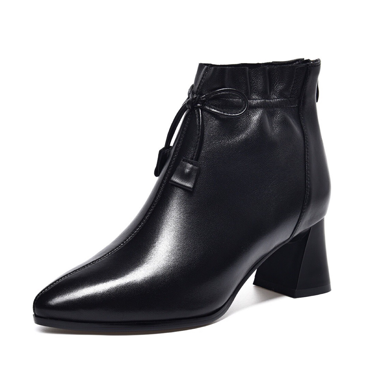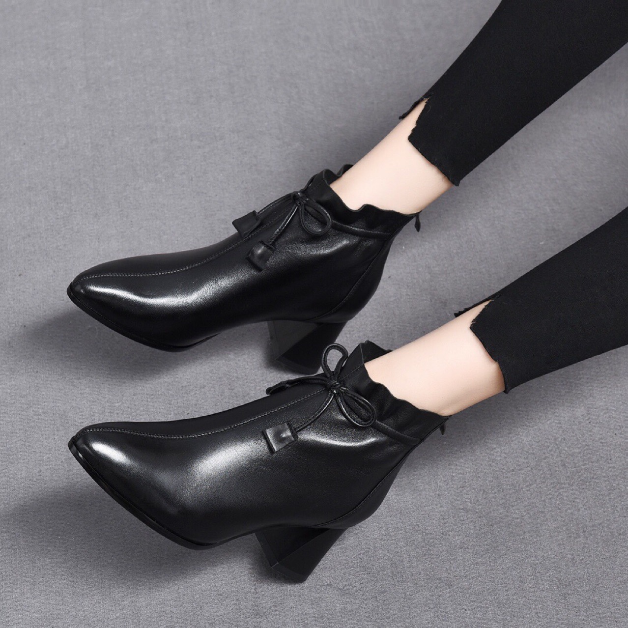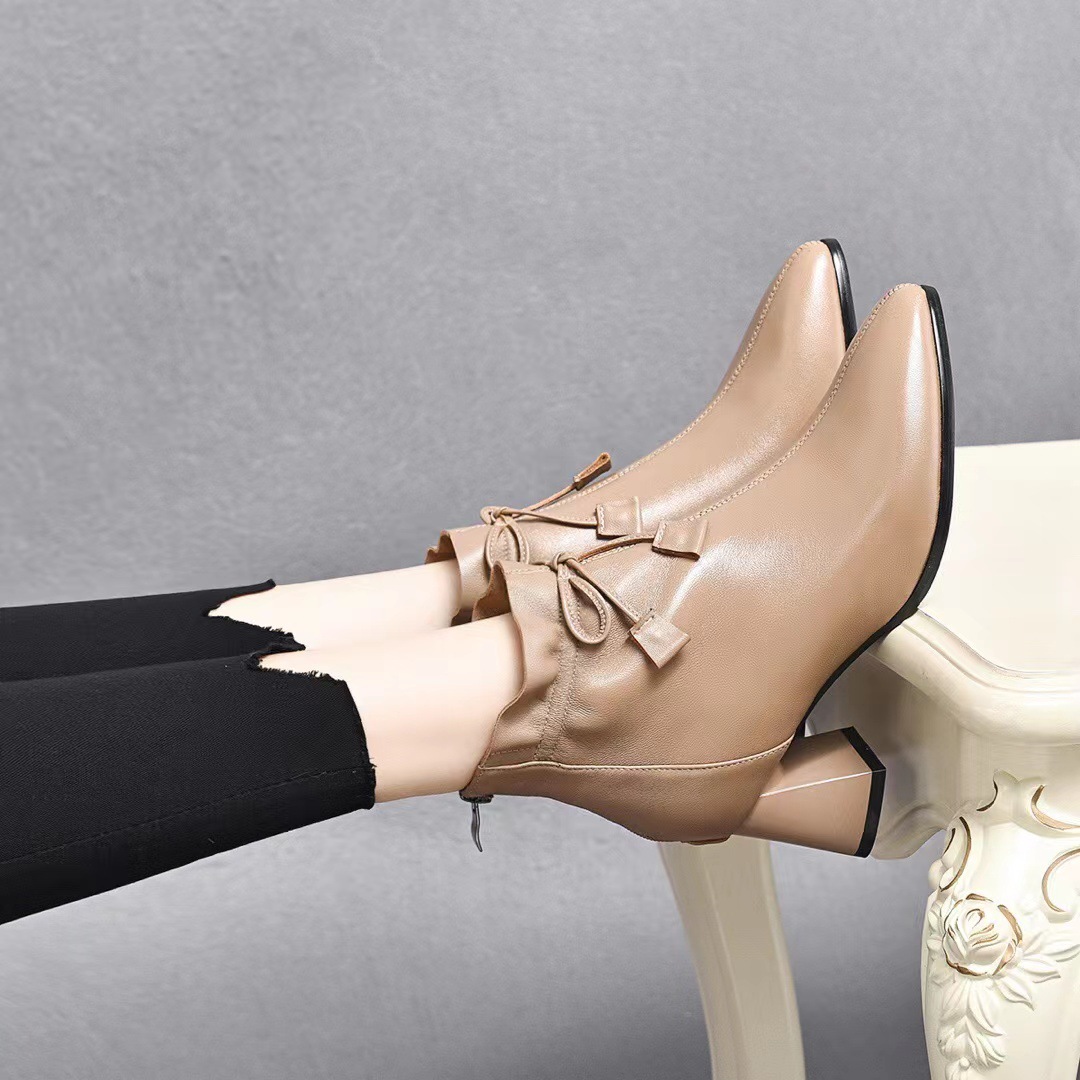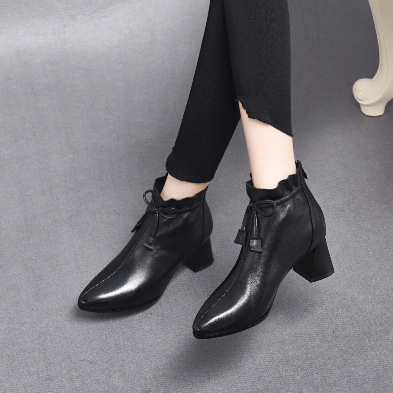 Đôi bốt cổ thấp này có mũi nhọn và phần gót chân to vừa phải, tạo dáng thanh thoát và giúp nâng đỡ bàn chân tốt. Chất da mềm mại ôm sát chân, mang lại cảm giác dễ chịu khi mang cả ngày. Kiểu dáng này phù hợp để kết hợp với nhiều loại trang phục khác nhau như quần jeans, váy hay quần âu. Bạn có thể sử dụng chúng hàng ngày cho những dịp đi làm, đi chơi hay gặp gỡ bạn bè. | Tên sản phẩm: Giày Boot Cổ Thấp Nữ Chất Liệu Da Bò Mũi Nhọn Gót Vuông Hàng Mùa Xuân Thu Đông - Giày Dép Nữ | Mã sản phẩm: D3779 - Giá: 1.430.000đ | Mã nhà sản xuất: TOREHU-G04Hình ảnh sản phẩm
