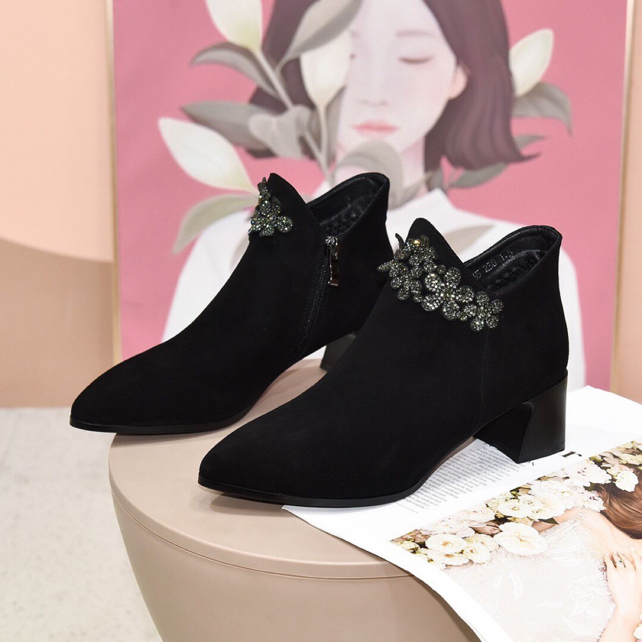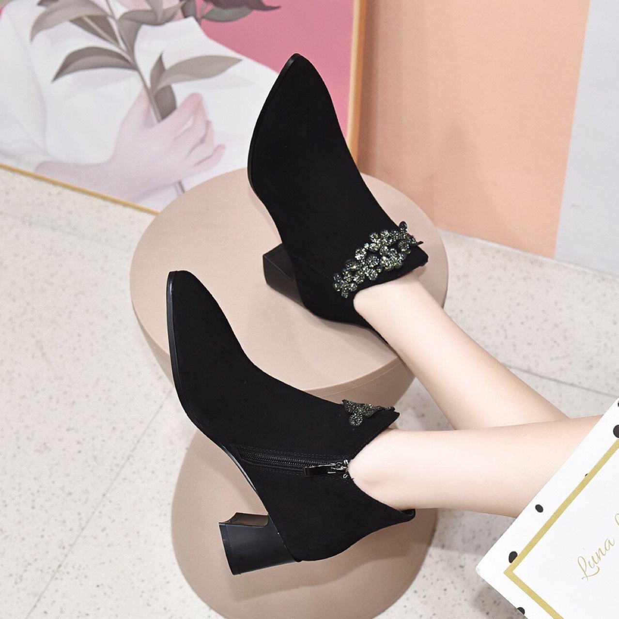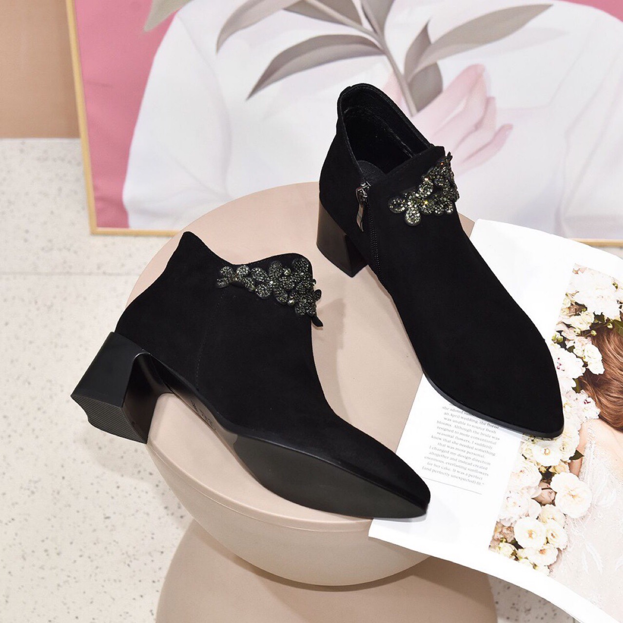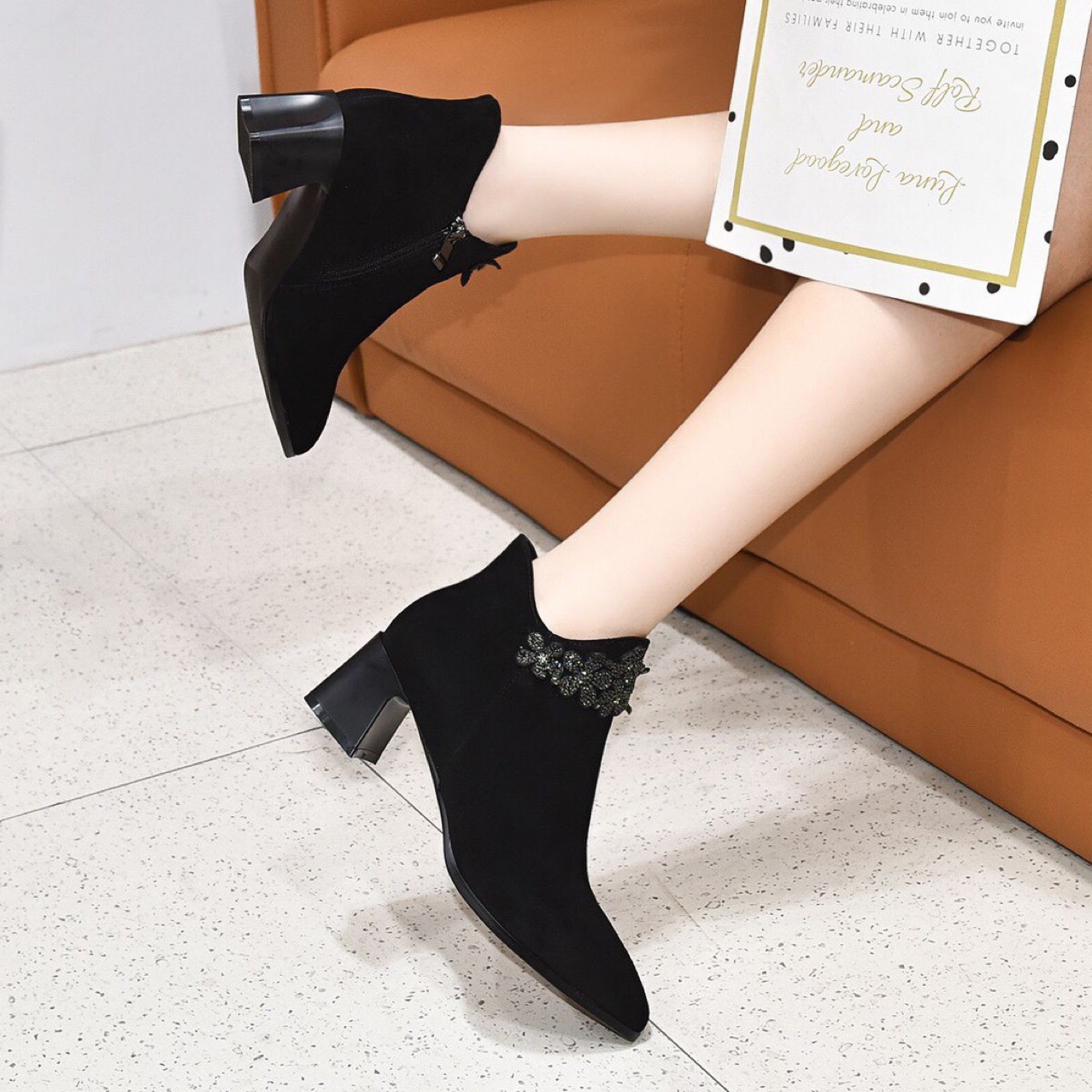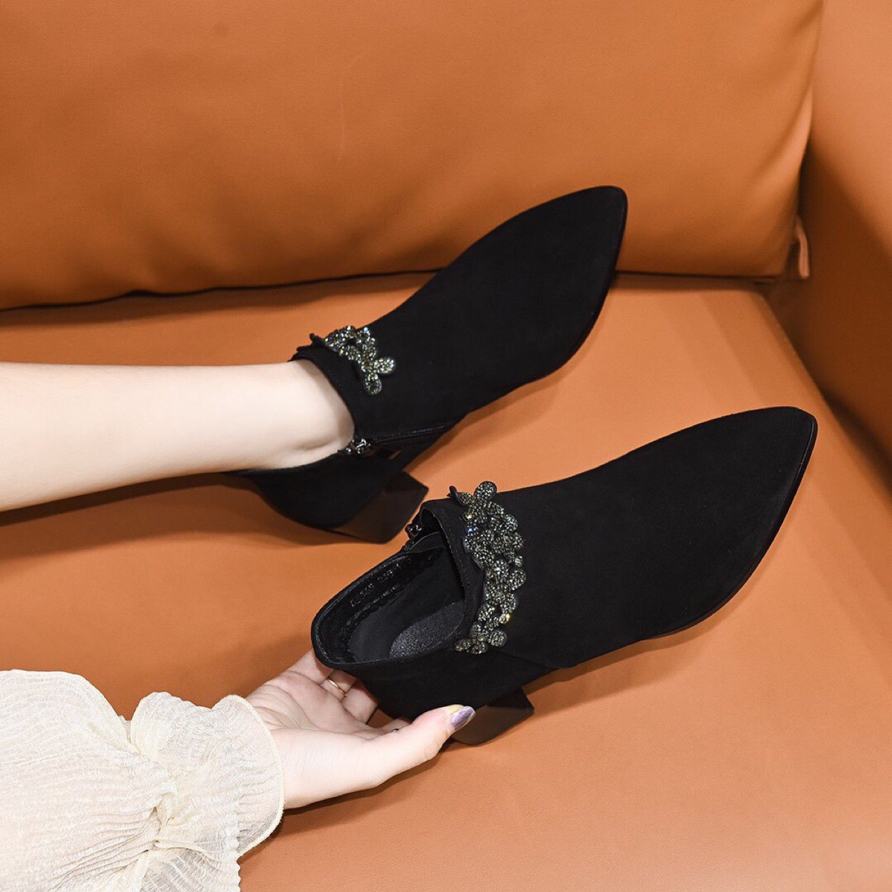 Đôi bốt cổ thấp này có mũi nhọn và phần gót chân được thiết kế chắc chắn. Sản phẩm sử dụng chất liệu da mềm mịn tạo cảm giác dễ chịu. Kiểu dáng gọn gàng, dễ dàng kết hợp với nhiều trang phục khác nhau như quần jeans hay váy. Điểm nhấn là những viên đá lấp lánh được gắn trang trí, làm nổi bật tổng thể. Bạn có thể sử dụng hằng ngày để tạo điểm nhấn cho phong cách của mình. | Tên sản phẩm: Boot Cổ Thấp Nữ Gắn Đá Mũi Nhọn Gót Vuông Hàng Mùa Xuân Thu Đông - Giày Dép Nữ | Mã sản phẩm: D3793 - Giá: 1.250.000đ | Mã nhà sản xuất: TOREHU-G04Hình ảnh sản phẩm