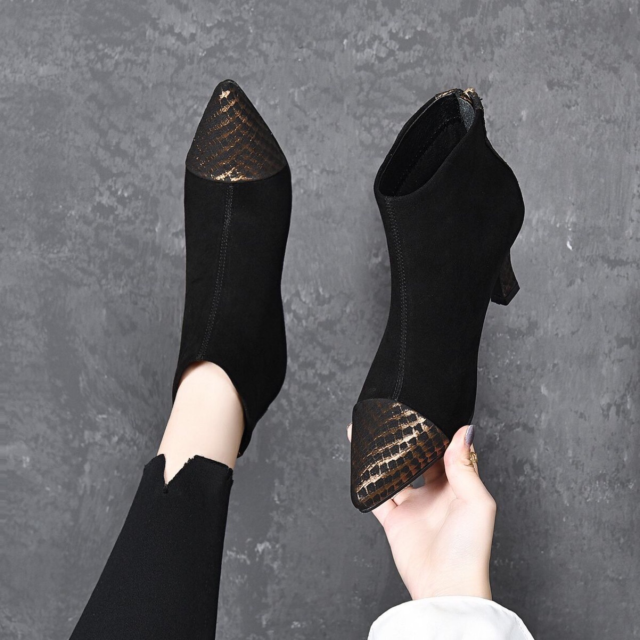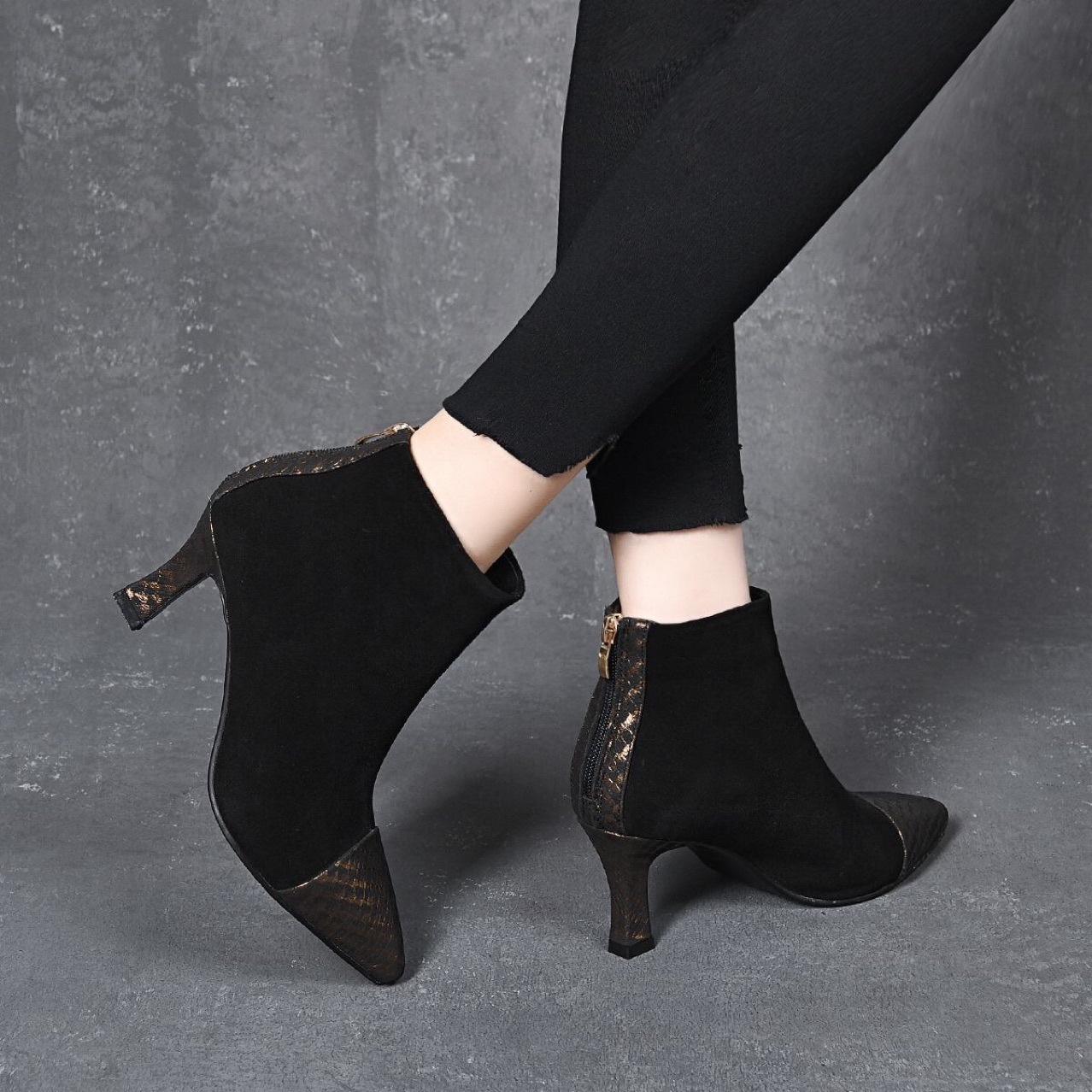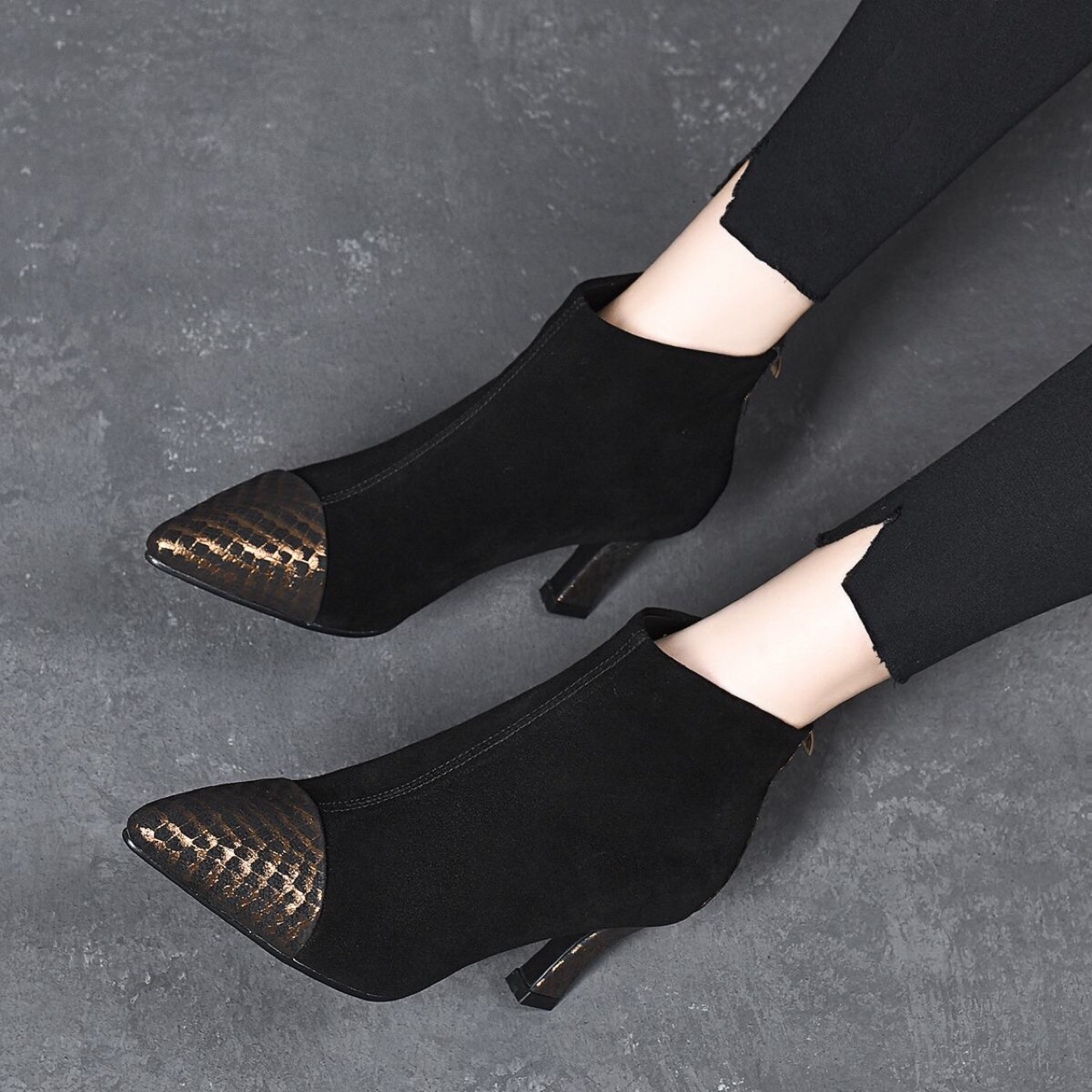 Đôi bốt này có phần mũi nhọn và gót thanh mảnh, tạo dáng thanh lịch. Sản phẩm kết hợp chất liệu da thật với phần cổ bốt co giãn, ôm vừa chân. Kiểu dáng bốt cổ thấp, có khóa kéo phía sau để tiện mang vào. Bạn có thể dễ dàng phối với nhiều trang phục như quần jeans hay váy để tạo điểm nhấn nổi bật mỗi khi ra ngoài. | Tên sản phẩm: Boot Cổ Thấp Nữ Chất Liệu Da Bò Mũi Nhọn Gót Nhọn - Giày Dép Nữ | Mã sản phẩm: D5433 - Giá: 1.390.000đ | Mã nhà sản xuất: TOREHU-G04Hình ảnh sản phẩm