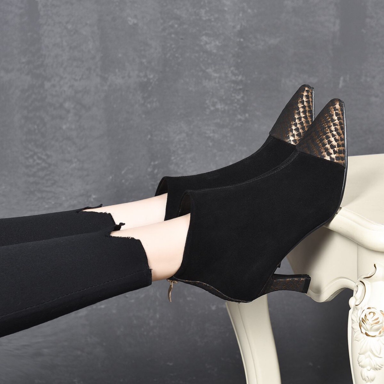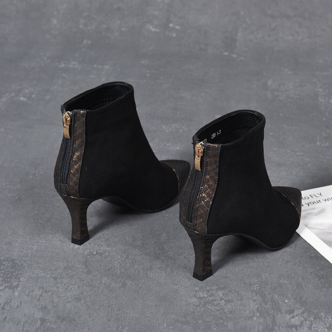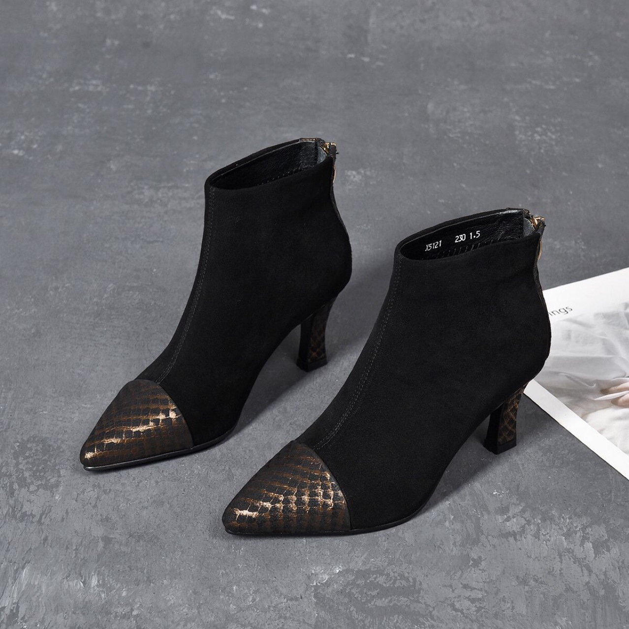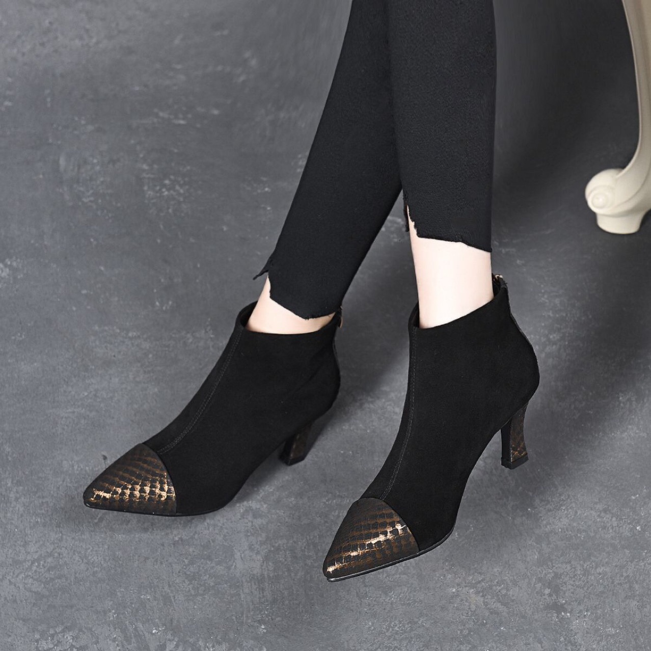 Đôi bốt này có phần mũi nhọn và gót thanh mảnh, tạo dáng thanh lịch. Sản phẩm kết hợp chất liệu da thật với phần cổ bốt co giãn, ôm vừa chân. Kiểu dáng bốt cổ thấp, có khóa kéo phía sau để tiện mang vào. Bạn có thể dễ dàng phối với nhiều trang phục như quần jeans hay váy để tạo điểm nhấn nổi bật mỗi khi ra ngoài. | Tên sản phẩm: Boot Cổ Thấp Nữ Chất Liệu Da Bò Mũi Nhọn Gót Nhọn - Giày Dép Nữ | Mã sản phẩm: D5433 - Giá: 1.390.000đ | Mã nhà sản xuất: TOREHU-G04Hình ảnh sản phẩm