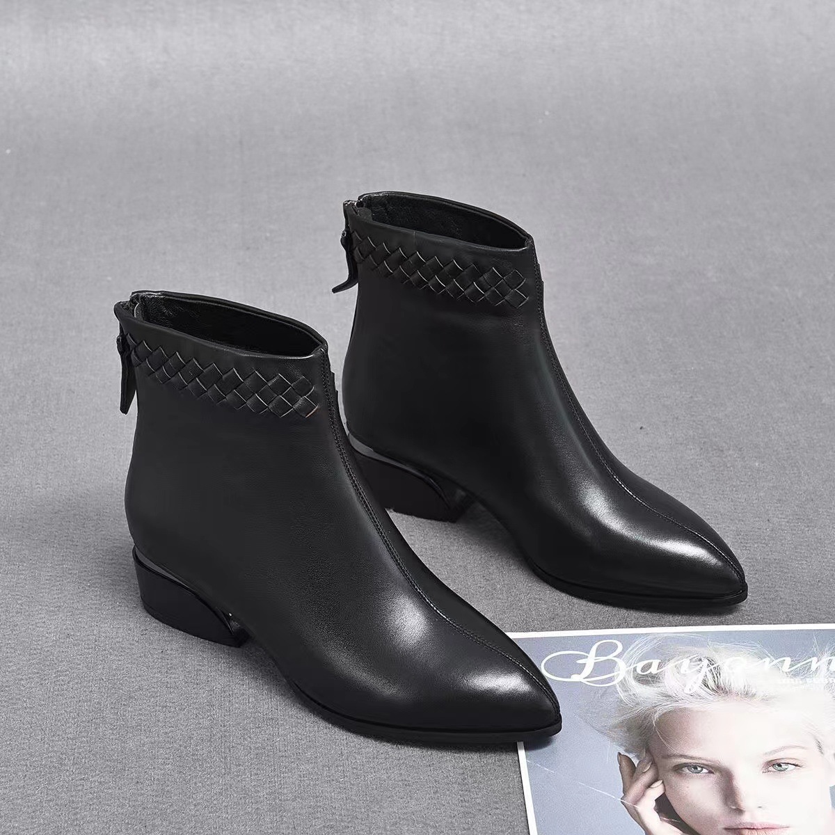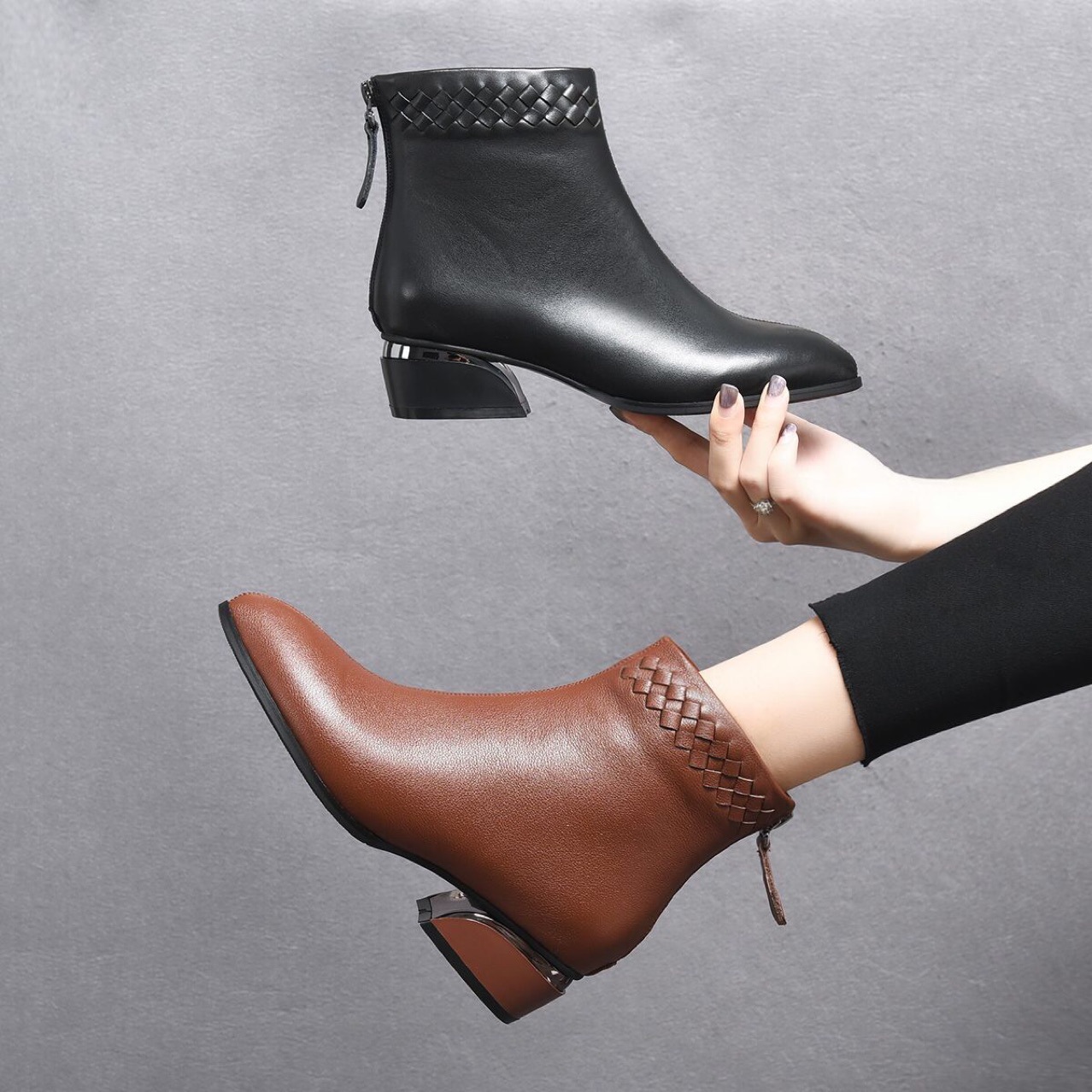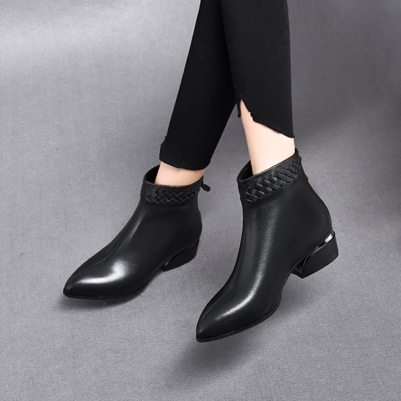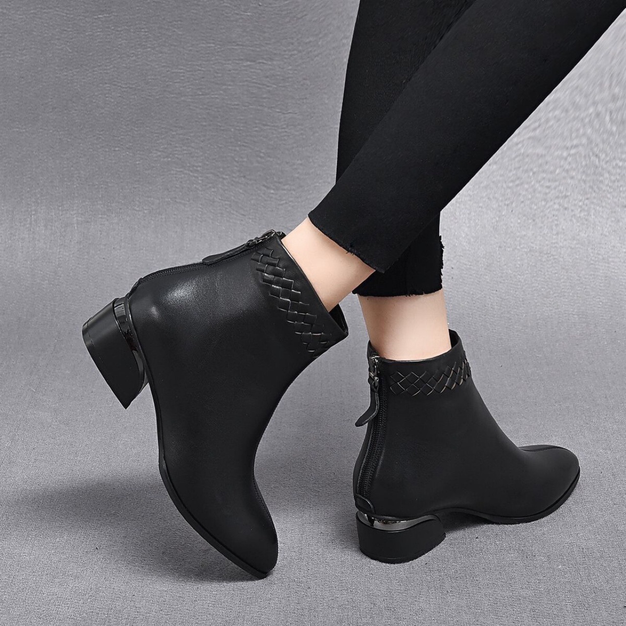 Đôi bốt cổ thấp với mũi nhọn thanh lịch, được làm từ chất liệu da mềm mại và có lớp lót ấm áp bên trong. Kiểu dáng gót vuông vừa phải giúp bạn dễ dàng di chuyển cả ngày. Thiết kế đơn giản, dễ phối hợp với nhiều loại trang phục như quần jeans, váy hay quần tây. Sản phẩm phù hợp để mang trong những ngày thời tiết mát mẻ. Chỉ cần lau sạch bề mặt bằng vải mềm sau khi sử dụng. | Tên sản phẩm: Boot Cổ Thấp Nữ Chất Liệu Da Bò Mũi Nhọn Gót Vuông Hàng Mùa Xuân Thu Đông - Giày Dép Nữ | Mã sản phẩm: D5446 - Giá: 1.390.000đ | Mã nhà sản xuất: TOREHU-G04Hình ảnh sản phẩm