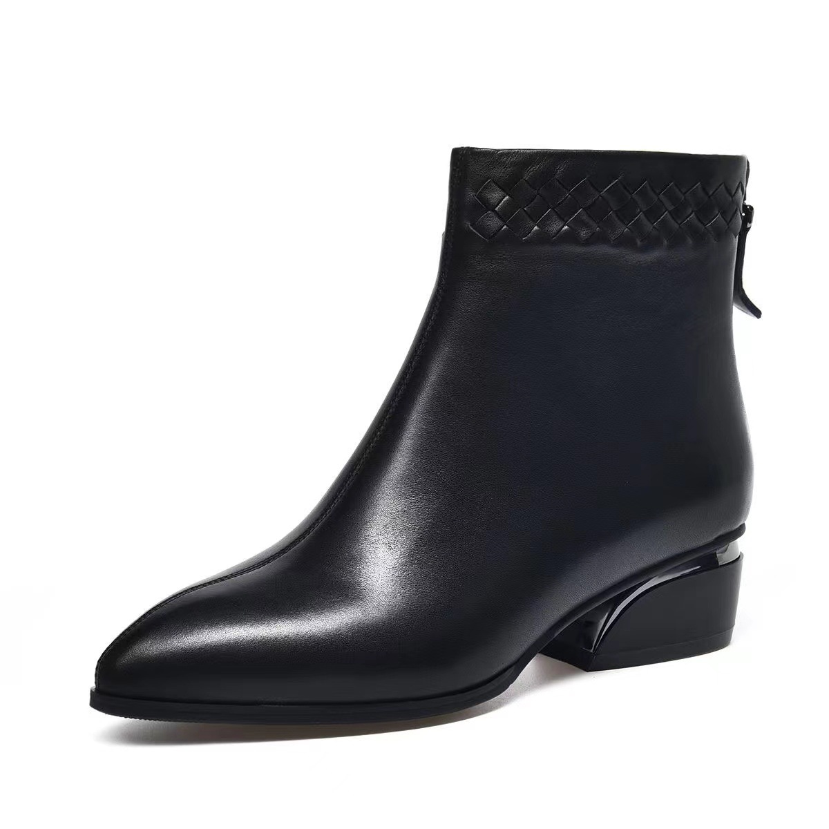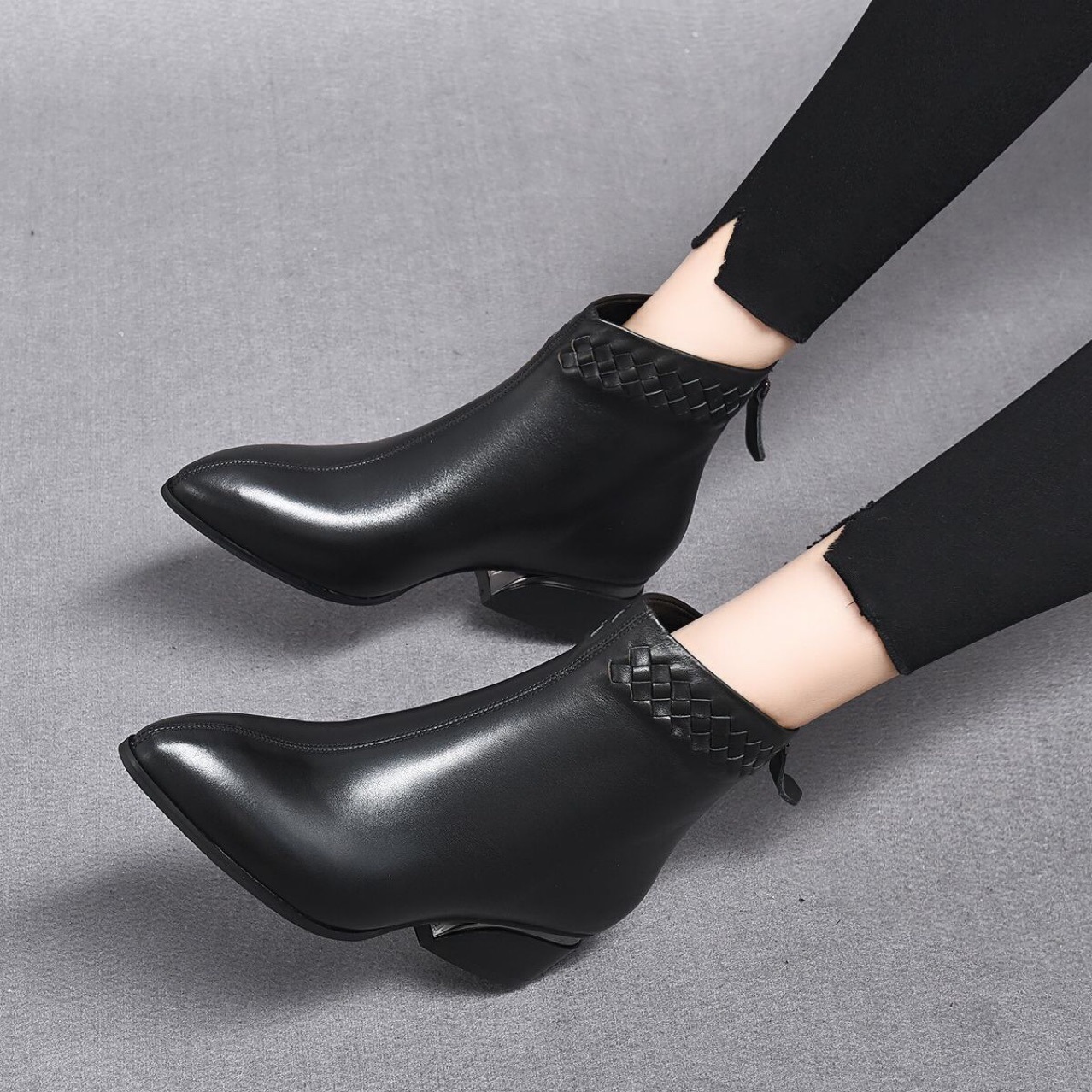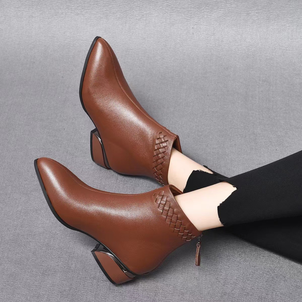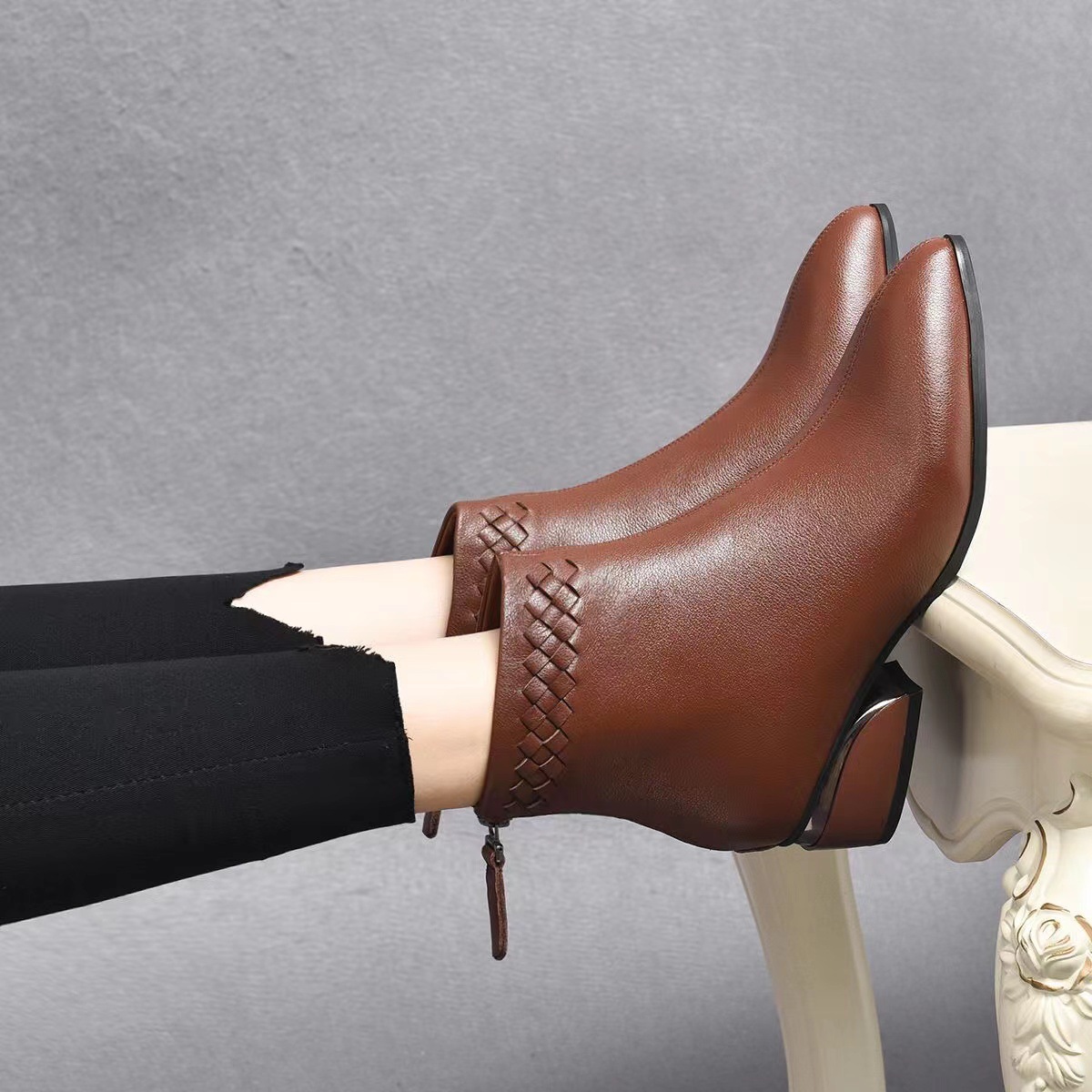 Đôi bốt cổ thấp với mũi nhọn thanh lịch, được làm từ chất liệu da mềm mại và có lớp lót ấm áp bên trong. Kiểu dáng gót vuông vừa phải giúp bạn dễ dàng di chuyển cả ngày. Thiết kế đơn giản, dễ phối hợp với nhiều loại trang phục như quần jeans, váy hay quần tây. Sản phẩm phù hợp để mang trong những ngày thời tiết mát mẻ. Chỉ cần lau sạch bề mặt bằng vải mềm sau khi sử dụng. | Tên sản phẩm: Boot Cổ Thấp Nữ Chất Liệu Da Bò Mũi Nhọn Gót Vuông Hàng Mùa Xuân Thu Đông - Giày Dép Nữ | Mã sản phẩm: D5446 - Giá: 1.390.000đ | Mã nhà sản xuất: TOREHU-G04Hình ảnh sản phẩm