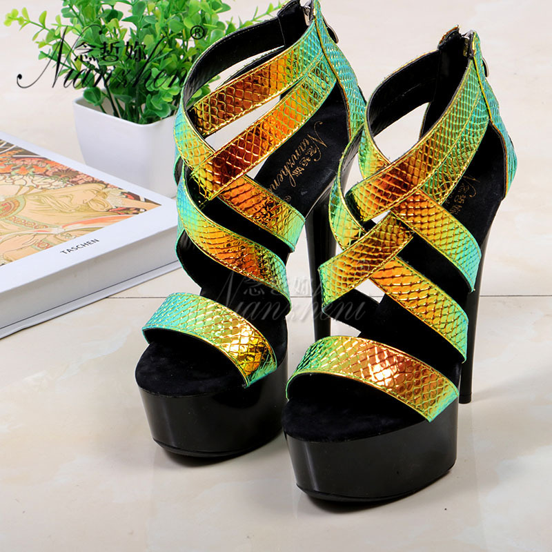Đôi giày sandal này có phần đế cao mười lăm phân, kết hợp đế ngoài dày giúp tăng chiều cao và dễ di chuyển. Kiểu dáng phù hợp cho sân khấu hoặc các buổi tiệc, toát lên vẻ quyến rũ mạnh mẽ. Thiết kế sử dụng chất liệu ánh kim lấp lánh dưới ánh đèn. Khi sử dụng, chỉ cần quấn các dây da quanh mắt cá chân và cố định bằng khóa kéo. | Tên sản phẩm: Giày Cao Gót Nữ Big Size Ngoại Cỡ Cao 15cm Chống Nước - Giày Dép Nữ | Mã sản phẩm: H8647 - Giá: 1.290.000đ | Mã nhà sản xuất: SHDI-G04Hình ảnh sản phẩm