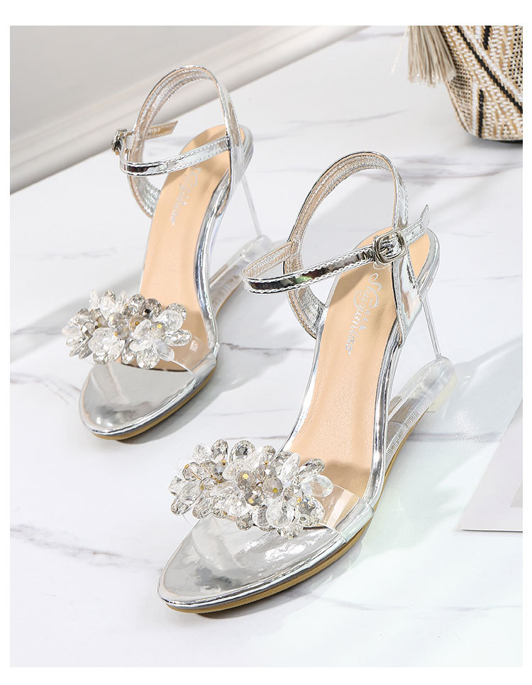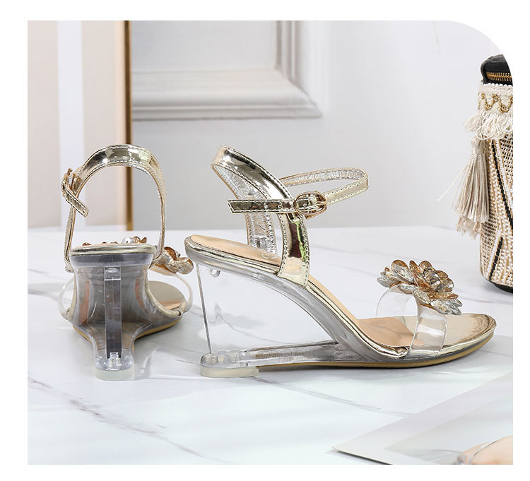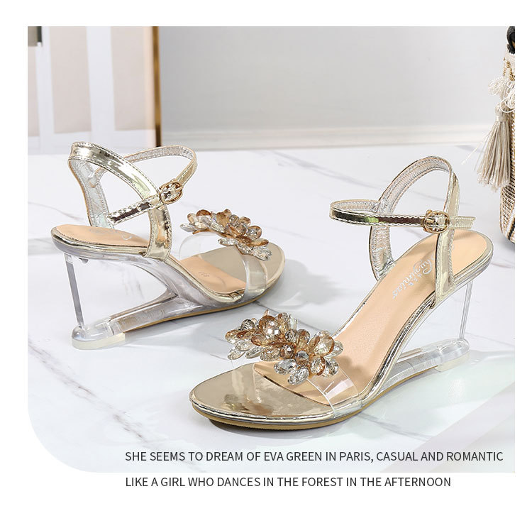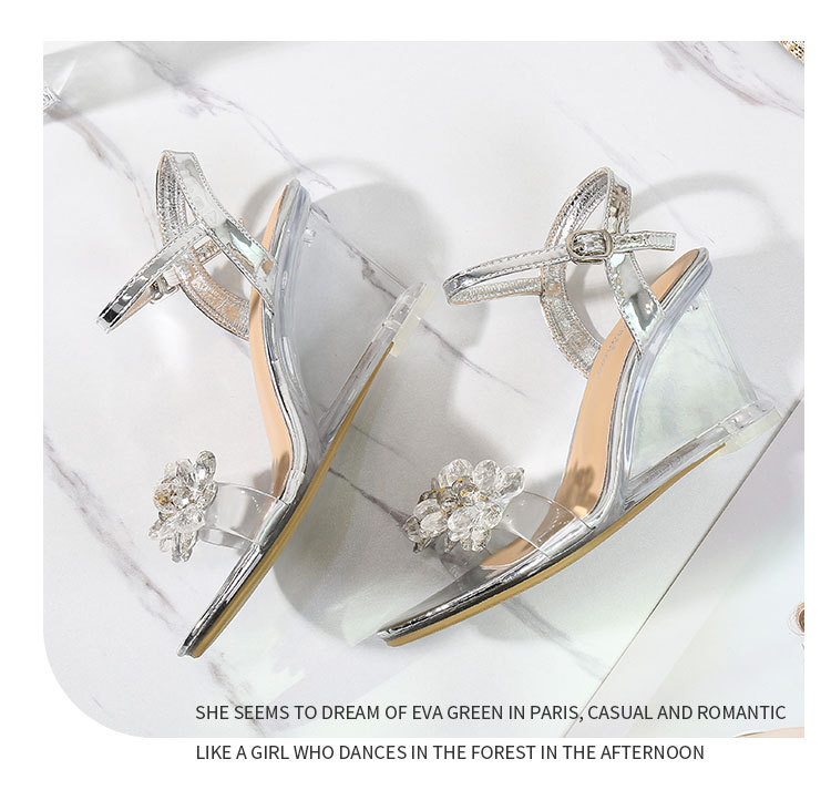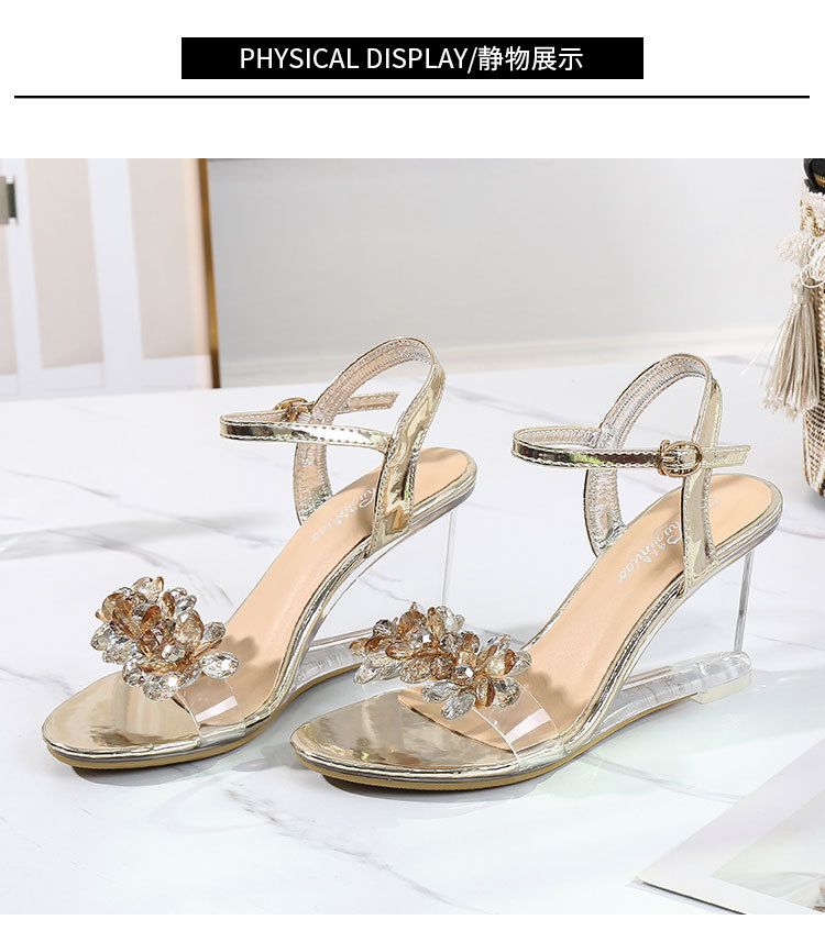 Đôi giày sandal nữ này mang phong cách trẻ trung, hiện đại. Sản phẩm có phần đế xuồng vững chãi, giúp tôn dáng và dễ dàng phối cùng nhiều trang phục. Phần qu giày trong suốt, được điểm xuyết bằng các viên đá lấp lánh tạo nên điểm nhấn tinh tế. Bạn chỉ cần xỏ chân vào và cài qu cho vừa vặn là đã có ngay một vẻ ngoài ưa nhìn cho những ngày hè. | Tên sản phẩm: Giày Cao Gót Nữ Gắn Đá Đế Xuồng Hàng Mùa Hè Phong Cách Hàn Quốc - Giày Dép Nữ | Mã sản phẩm: M9236 - Giá: 810.000đ | Mã nhà sản xuất: JIENNG-G03Hình ảnh sản phẩm