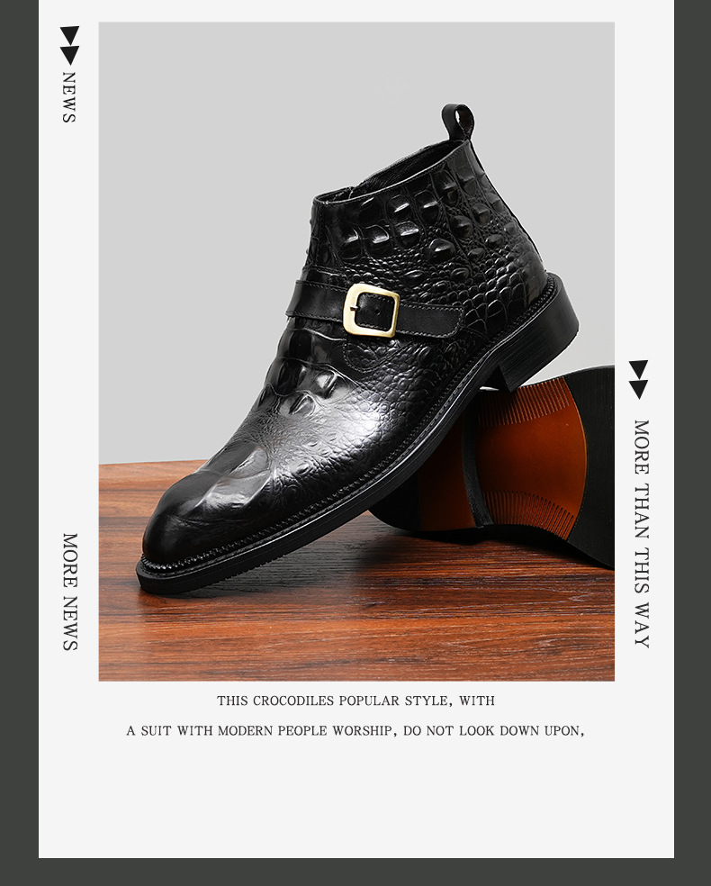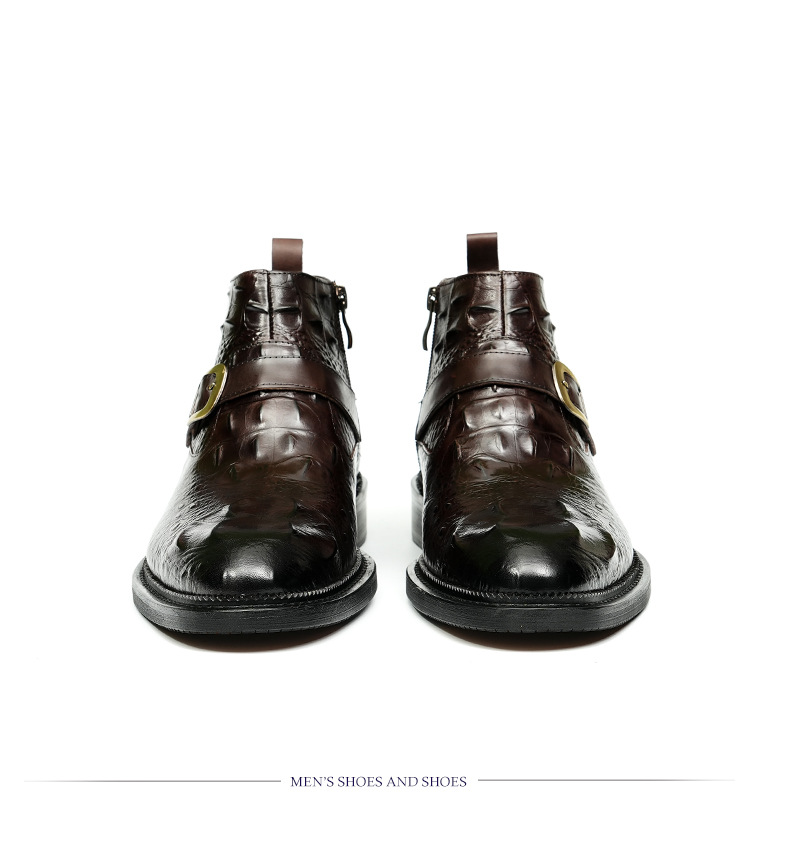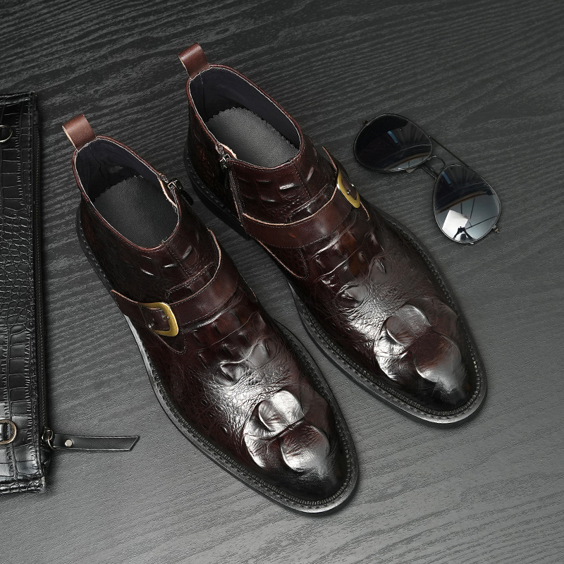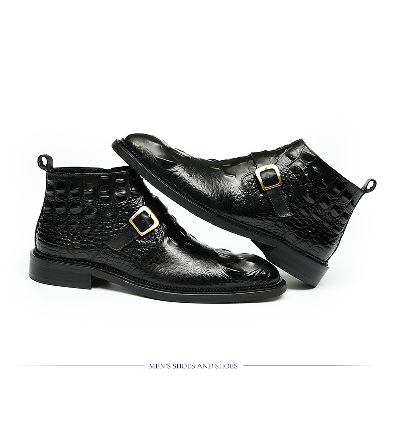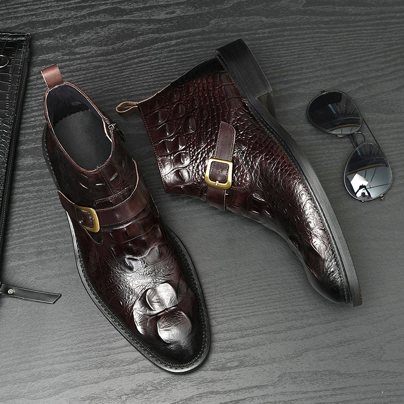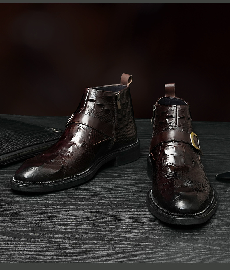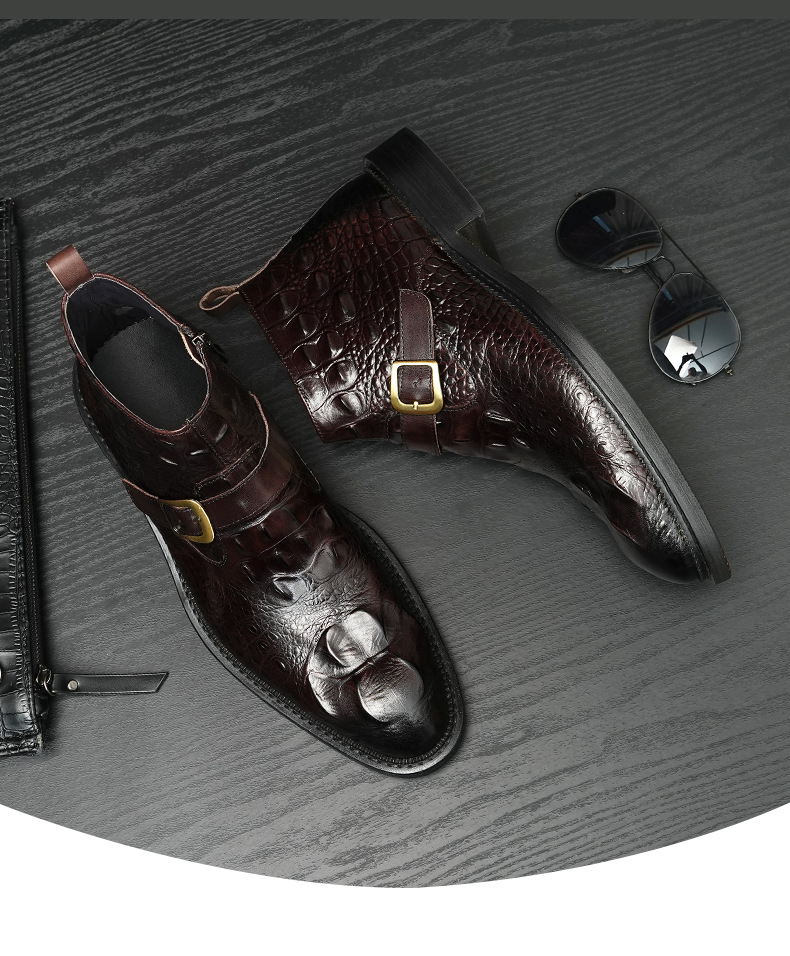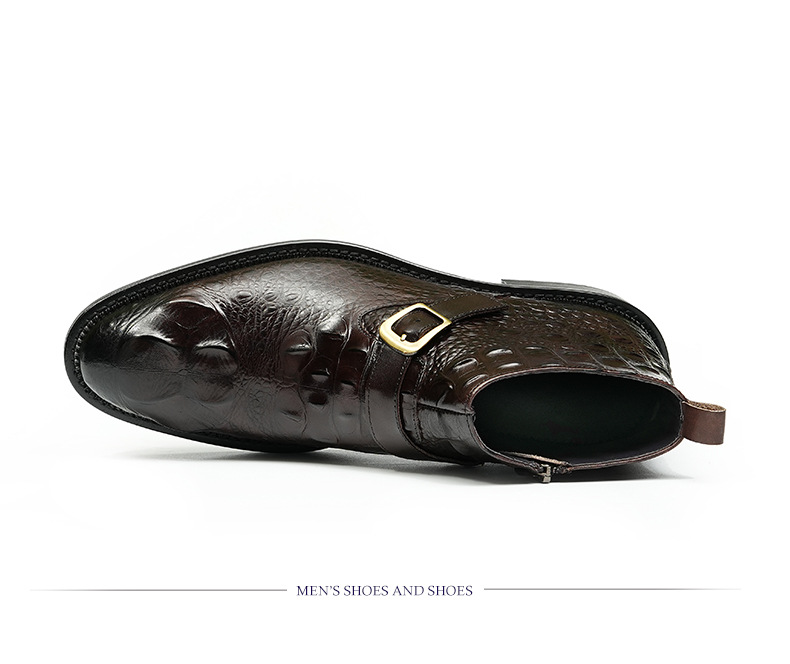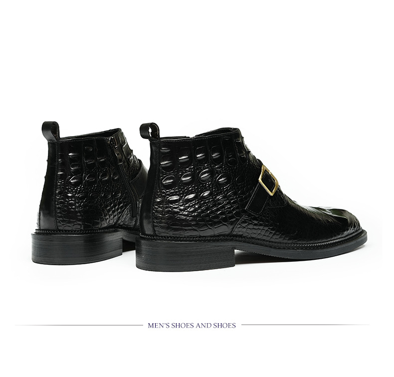 Giày bốt nam thiết kế cổ cao, phần mũi nhọn tạo điểm nhấn. Sản phẩm làm từ chất liệu da thật, bề mặt được dập nổi hoa văn như da cá sấu, vừa bền chắc vừa có tính thẩm mỹ. Đặc biệt có khóa kéo bên hông giúp mang vào và tháo ra dễ dàng. Kiểu dáng kết hợp giữa phong cách lịch sự và nét phóng khoáng, phù hợp để phối cùng nhiều loại trang phục khác nhau. Sử dụng tốt cho cả những dịp làm việc thông thường và sinh hoạt hằng ngày. | Tên sản phẩm: Boot Cổ Thấp Nam Chất Liệu Da Bò Vân Da Cá Sấu Mũi Nhọn Họa Tiết Hoa - Giày Dép Nam | Mã sản phẩm: A0108 - Giá: 2.550.000đ | Mã nhà sản xuất: SHRYIC-G06Hình ảnh sản phẩm