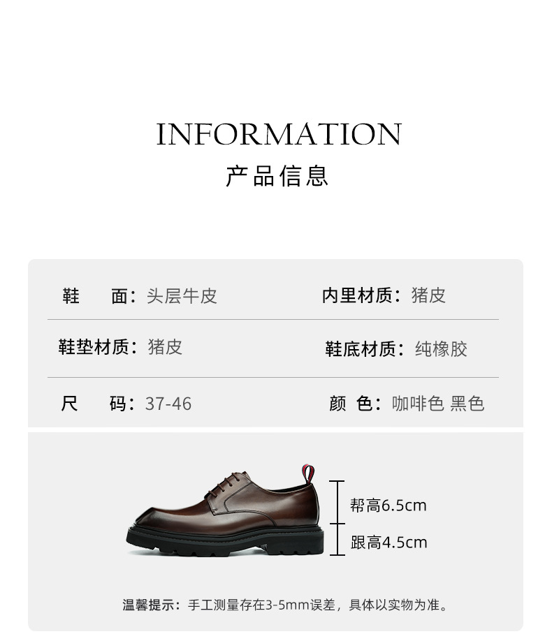 Giày tây nam thiết kế phần đế dày mang đến cảm giác vững chãi và thoải mái khi di chuyển. Sản phẩm được làm từ chất liệu da bò mềm mại, tạo độ bền đẹp theo thời gian. Kiểu dáng hơi ôm vuông ở mũi, phù hợp cho nhiều dạng bàn chân. Bạn có thể dễ dàng phối cùng quần âu để đi làm hoặc kết hợp với trang phục thường ngày cho những dịp gặp gỡ. Sử dụng cùng tất và vệ sinh bằng khăn mềm để giữ giày luôn sạch đẹp. | Tên sản phẩm: Giày Da Nam Chất Liệu Da Bò Đế Cao Phong Cách Hàn Quốc - Giày Dép Nam | Mã sản phẩm: A0235 - Giá: 2.360.000đ | Mã nhà sản xuất: SHRYIC-G05Hình ảnh sản phẩm