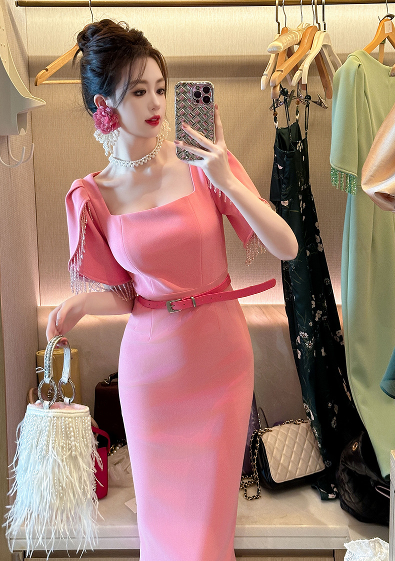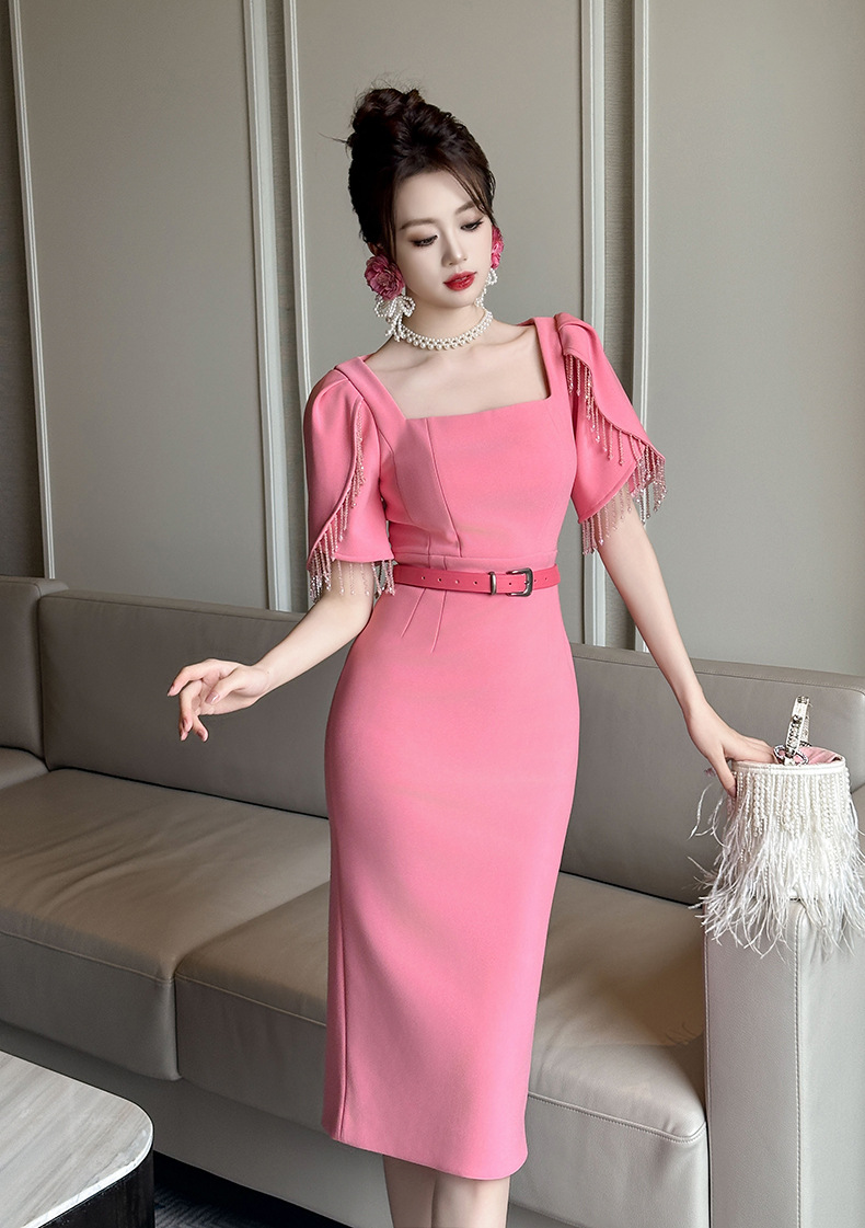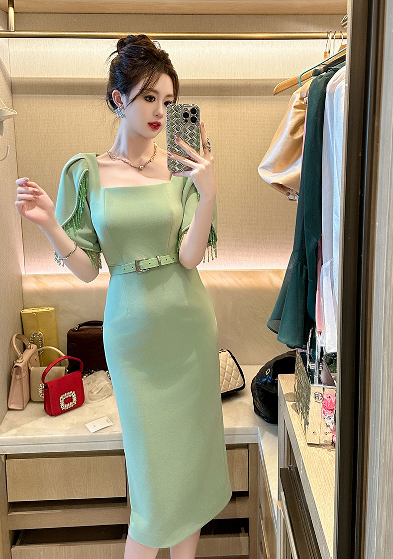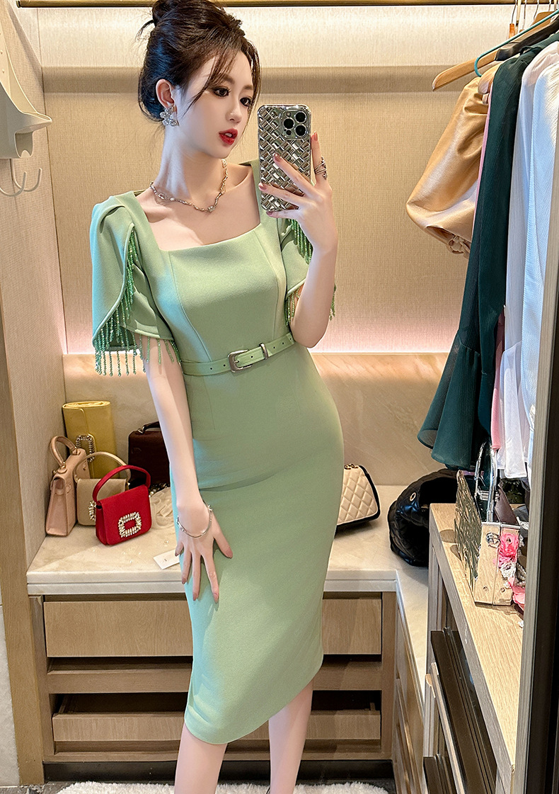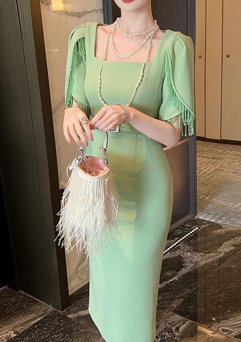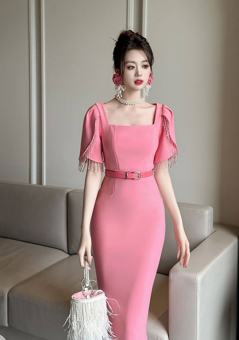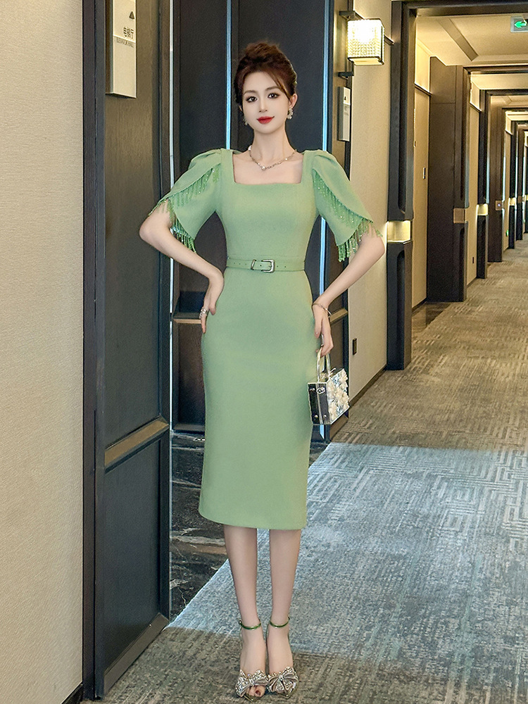 Váy dành cho các buổi tiệc, kiểu dáng ôm sát cơ thể và xòe nhẹ ở phần mông. Tay áo ngắn, thiết kế theo phong cách thanh lịch. Điểm nhấn là những đường diềm tua rua tinh tế tạo sự mềm mại, duyên dáng mỗi khi chuyển động. Sản phẩm phù hợp mặc trong những dịp lễ hội hay sự kiện. Có thể giặt bằng tay và phơi ở nơi râm mát để giữ dáng váy được bền đẹp. | Tên sản phẩm: Váy Đầm Liền Thân Nữ Dáng Ôm Ngắn Tay Hàng Mùa Hè - Thời Trang Nữ | Mã sản phẩm: A0239 - Giá: 1.380.000đ | Mã nhà sản xuất: CHDG-G04Hình ảnh sản phẩm