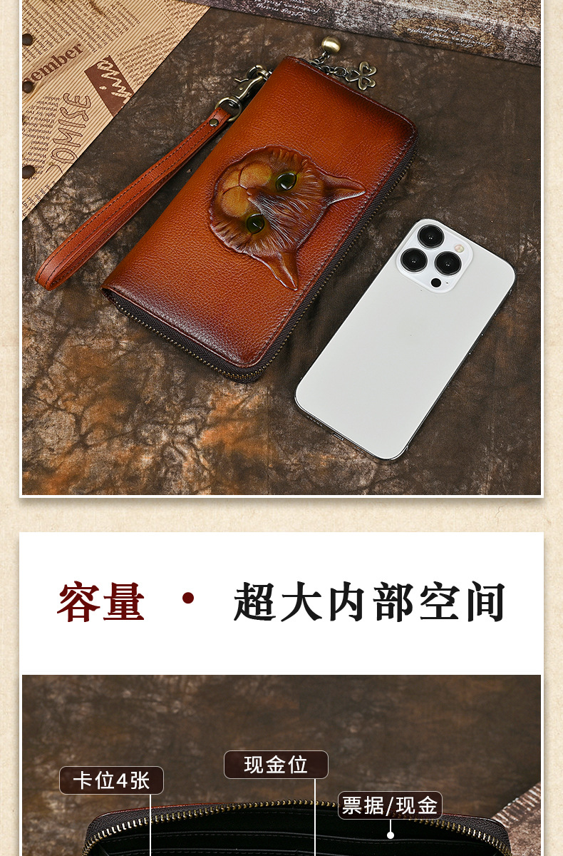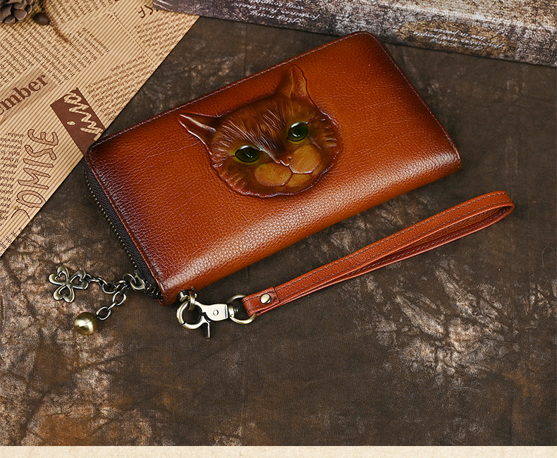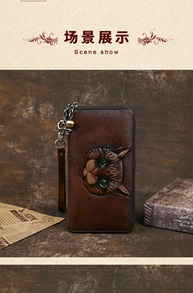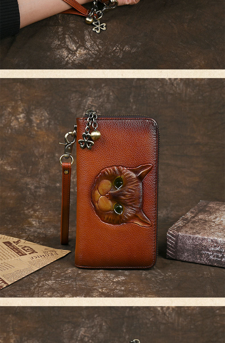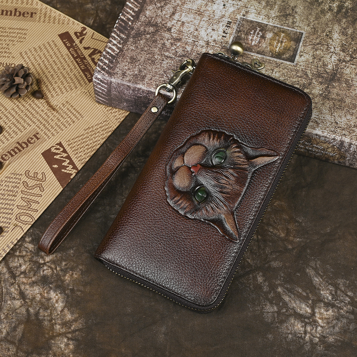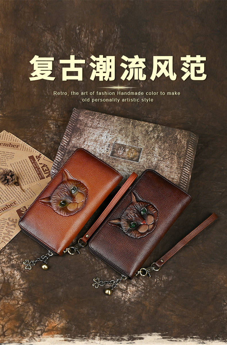 Chiếc bóp dành cho nữ này có kiểu dáng thon dài, mang phong cách hoài cổ nhưng vẫn rất hợp thời. Sản phẩm được làm từ chất liệu da bò thật, bền đẹp theo thời gian. Điểm nhấn đáng yêu là họa tiết chú mèo được in nổi bật trên mặt bóp. Bạn có thể dễ dàng cầm tay hoặc để trong túi xách lớn. Thiết kế nhiều ngăn giúp đựng tiền, thẻ và các vật dụng cá nhân một cách gọn gàng, ngăn nắp. | Tên sản phẩm: Ví Bóp Cầm Tay Nữ Chất Liệu Da Bò Phục Cổ Cổ Điển - Túi Ví Nữ | Mã sản phẩm: A0250 - Giá: 670.000đ | Mã nhà sản xuất: GUDGE-G02Hình ảnh sản phẩm