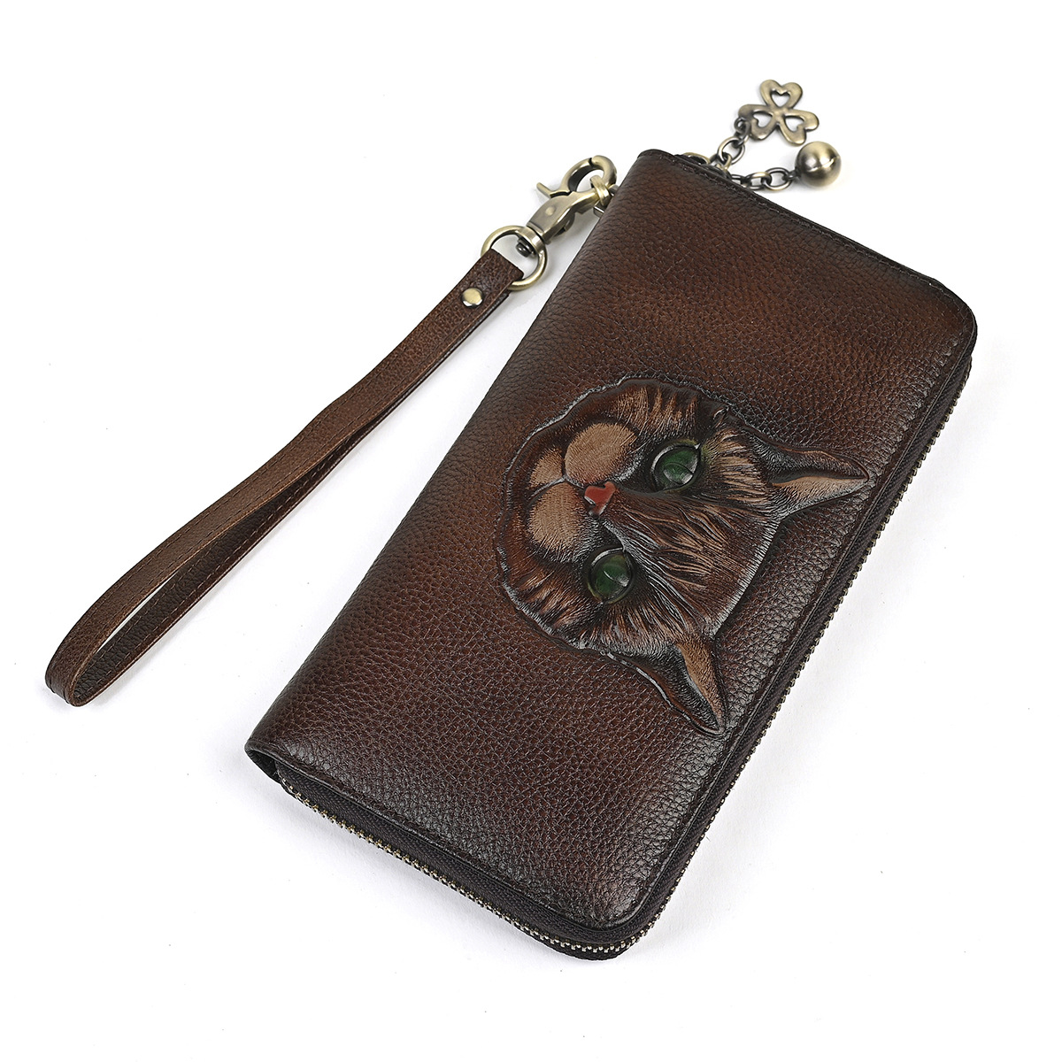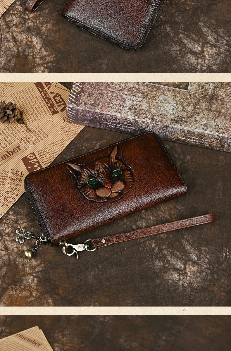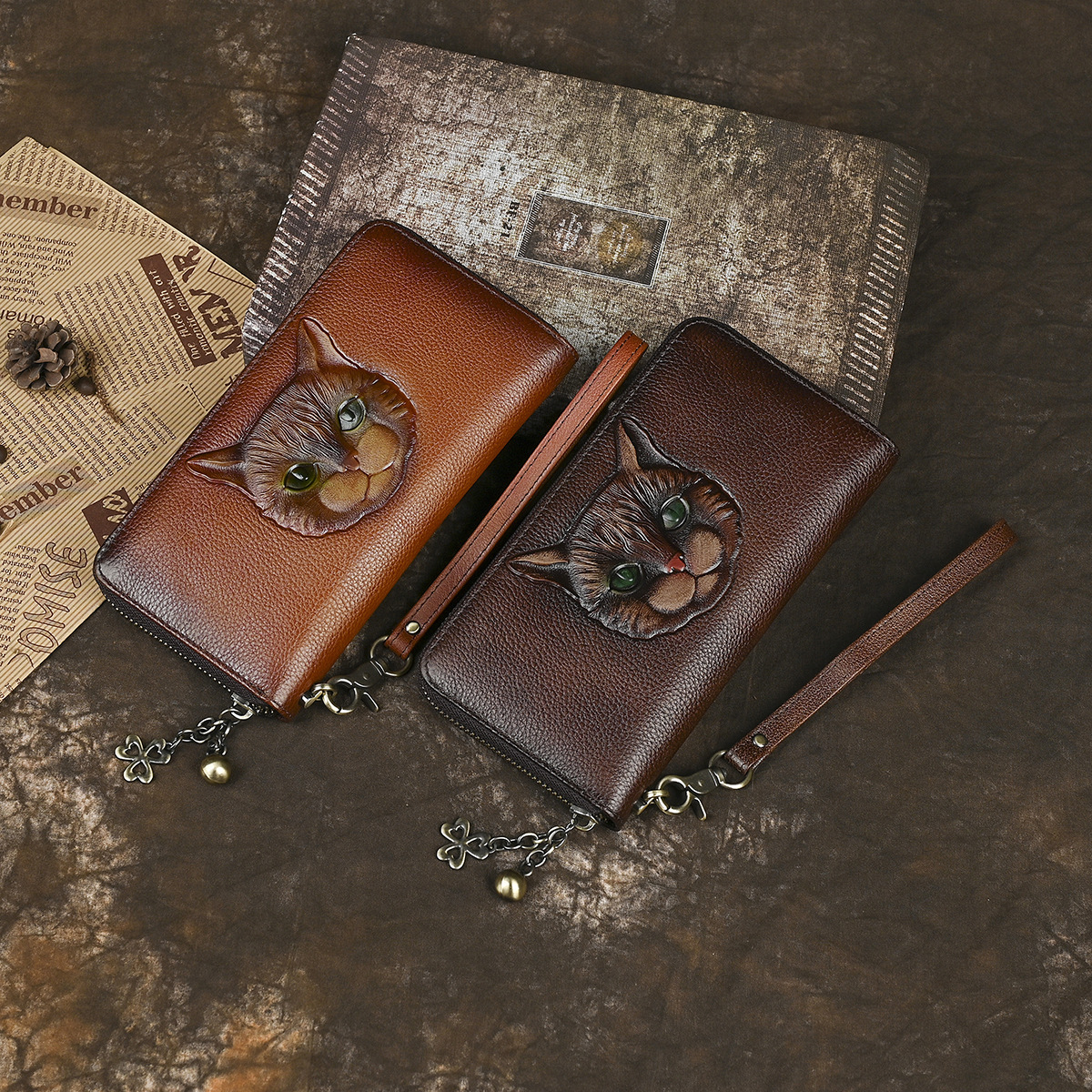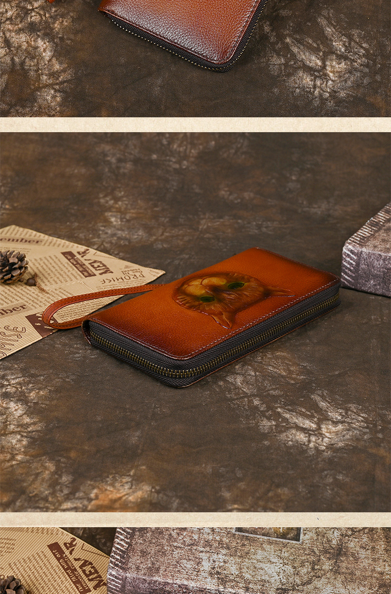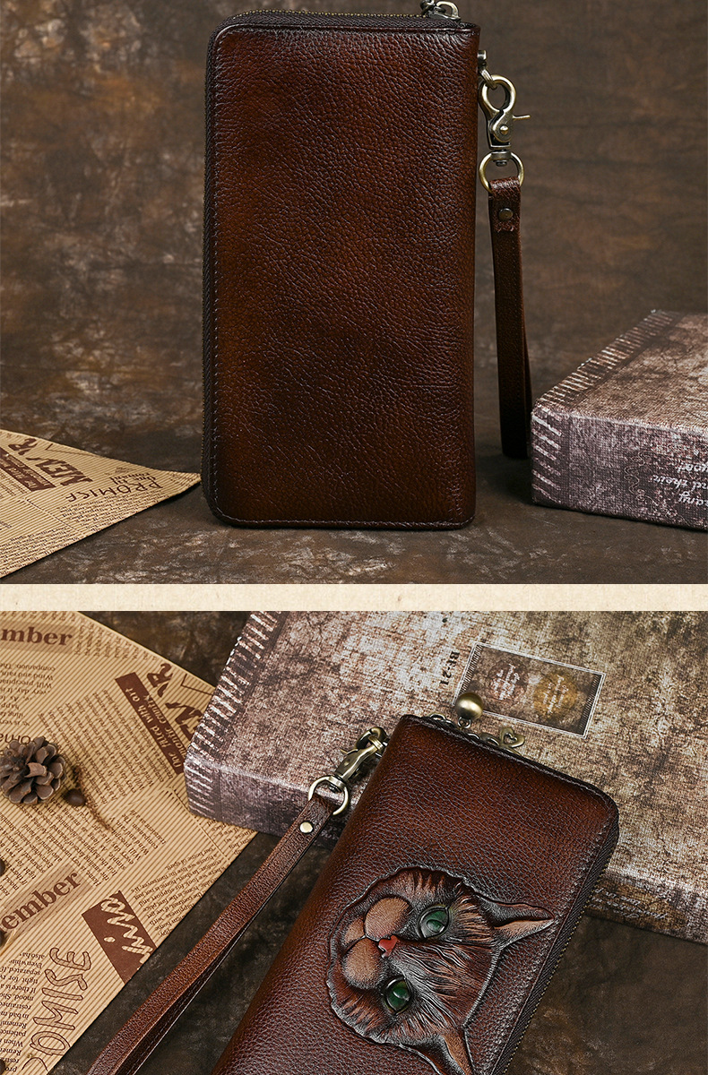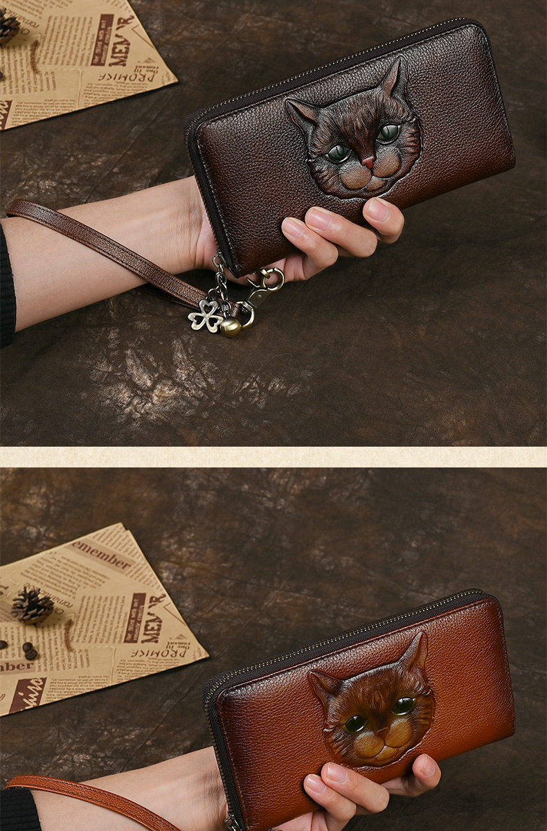 Chiếc bóp dành cho nữ này có kiểu dáng thon dài, mang phong cách hoài cổ nhưng vẫn rất hợp thời. Sản phẩm được làm từ chất liệu da bò thật, bền đẹp theo thời gian. Điểm nhấn đáng yêu là họa tiết chú mèo được in nổi bật trên mặt bóp. Bạn có thể dễ dàng cầm tay hoặc để trong túi xách lớn. Thiết kế nhiều ngăn giúp đựng tiền, thẻ và các vật dụng cá nhân một cách gọn gàng, ngăn nắp. | Tên sản phẩm: Ví Bóp Cầm Tay Nữ Chất Liệu Da Bò Phục Cổ Cổ Điển - Túi Ví Nữ | Mã sản phẩm: A0250 - Giá: 670.000đ | Mã nhà sản xuất: GUDGE-G02Hình ảnh sản phẩm