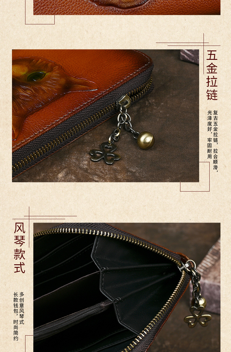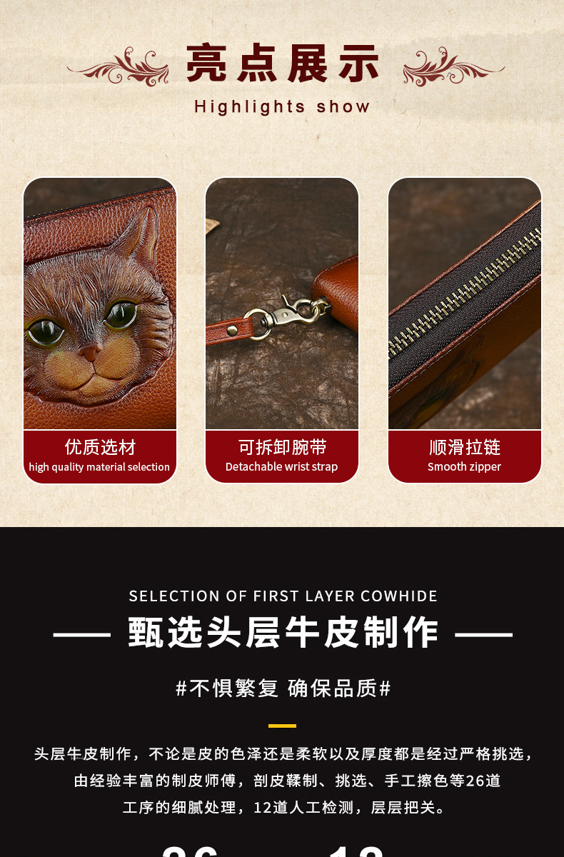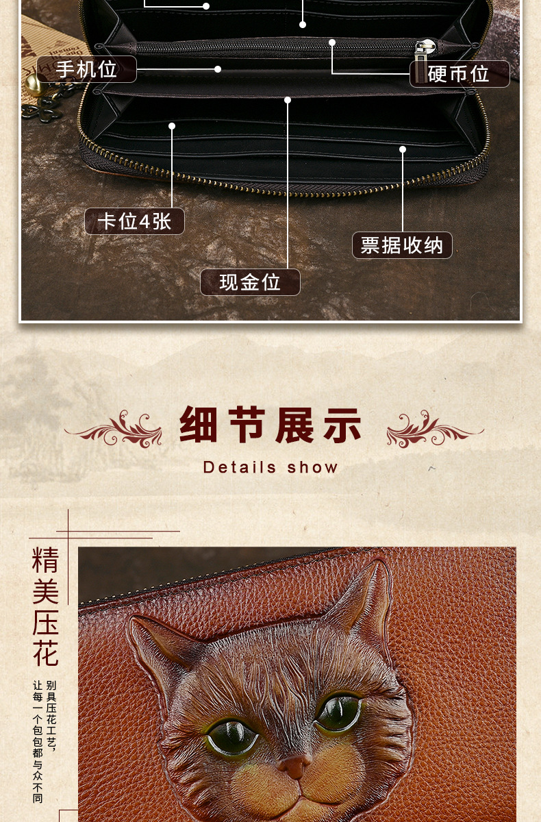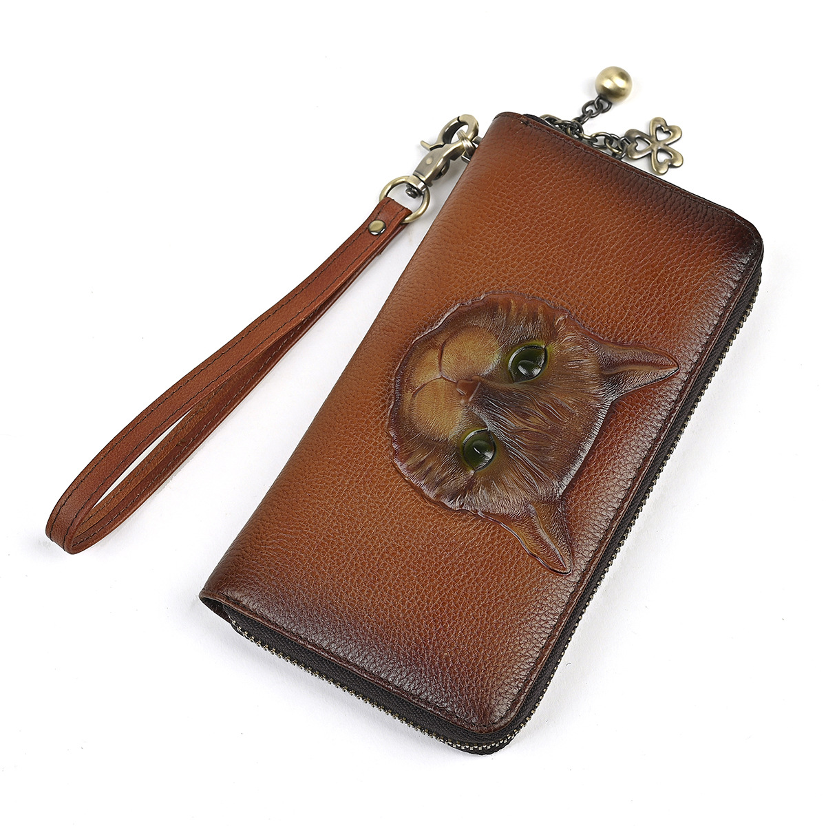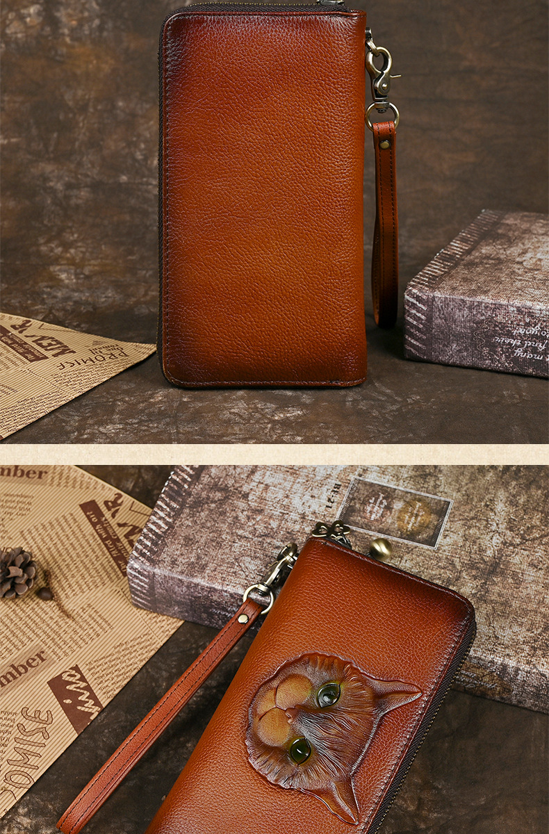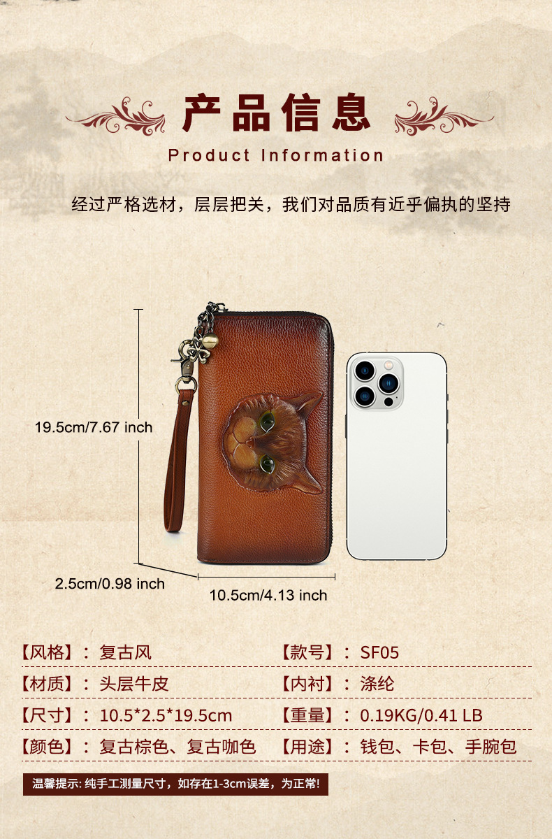 Chiếc bóp dành cho nữ này có kiểu dáng thon dài, mang phong cách hoài cổ nhưng vẫn rất hợp thời. Sản phẩm được làm từ chất liệu da bò thật, bền đẹp theo thời gian. Điểm nhấn đáng yêu là họa tiết chú mèo được in nổi bật trên mặt bóp. Bạn có thể dễ dàng cầm tay hoặc để trong túi xách lớn. Thiết kế nhiều ngăn giúp đựng tiền, thẻ và các vật dụng cá nhân một cách gọn gàng, ngăn nắp. | Tên sản phẩm: Ví Bóp Cầm Tay Nữ Chất Liệu Da Bò Phục Cổ Cổ Điển - Túi Ví Nữ | Mã sản phẩm: A0250 - Giá: 670.000đ | Mã nhà sản xuất: GUDGE-G02Hình ảnh sản phẩm