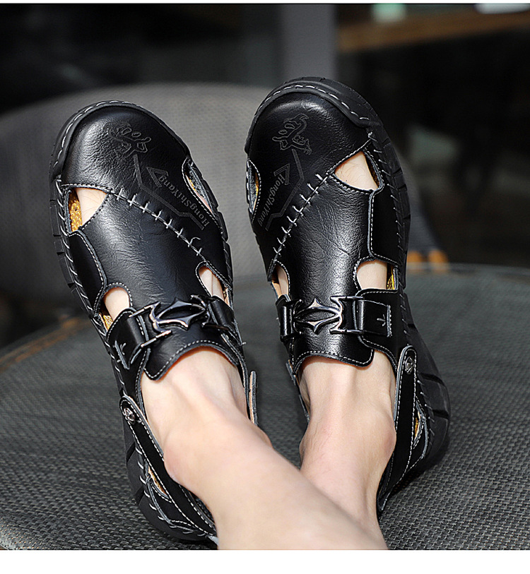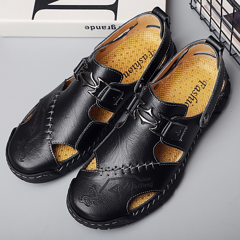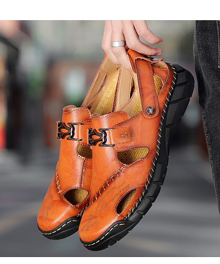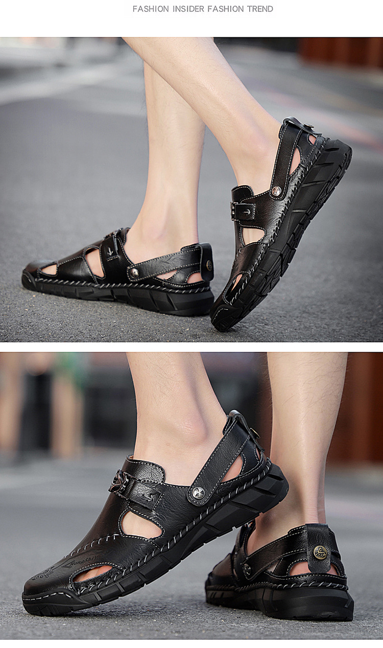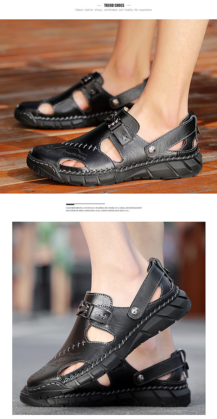 Dành cho nam giới, đôi dép này có kiểu dáng rộng rãi thoải mái. Dép được làm từ chất liệu da thật, phần mũi bịt kín và thiết kế đục lỗ tinh tế giúp đôi chân luôn thông thoáng. Đây là mẫu dép qu hậu dễ mang, phù hợp cho những lúc thư giãn, dạo bờ biển hay đi chơi hàng ngày. Chỉ cần xỏ chân vào và bạn đã sẵn sàng để tận hưởng cảm giác mát mẻ, dễ chịu. | Tên sản phẩm: Giày Dép Sandal Nam Chất Liệu Da Bò Big Size Ngoại Cỡ Thoáng Khí - Giày Dép Nam | Mã sản phẩm: A0906 - Giá: 670.000đ | Mã nhà sản xuất: TUNEZH-G02Hình ảnh sản phẩm